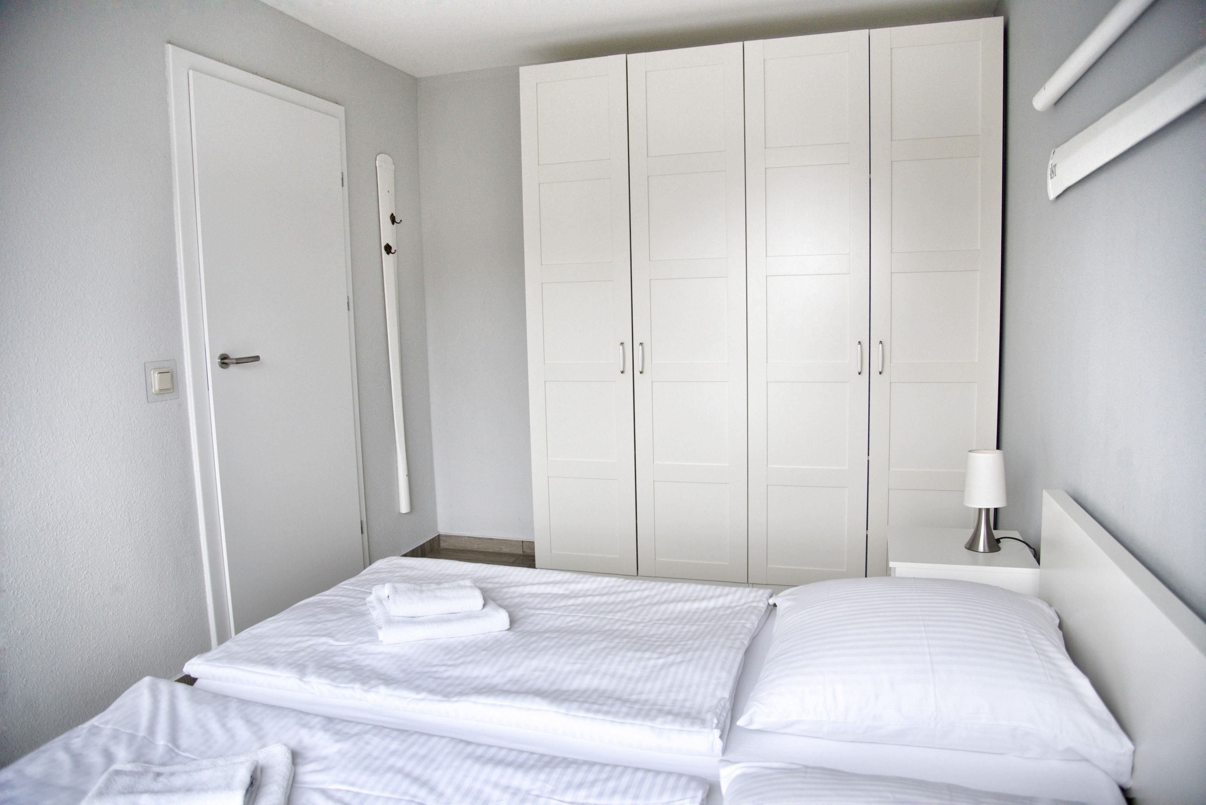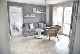 Das lichtdurchflutete Wohnzimmer verfügt über einen Esstisch mit vier Stühlen, ein ausziehbares Schlafsofa mit einem Schlafplatz für zwei Personen und einen Sessel. Für die Übernachtungsgäste des Wohnzimmers steht Ihnen ein separater Kleiderschrank zur Verfügung. Multimedial können Sie auf einen großen Flachbildfernseher zurückgreifen. Ihre Ferienwohnung hat einen Kabelanschluss. Auch einige Gesellschaftsspiele warten hier schon auf Sie. In Ihrem Schlafzimmer befindet sich ein Doppelbett mit höhenverstellbaren Lattenrosten. Nachtische, Leselampen und Garderoben möchten hier von Ihnen genutzt werden. Der große Schrank wird Ihnen gute Dienste leisten und genügend Stauraum für Ihr Gepäck bieten. Ihre Wohnküche ist zum Wohnzimmer hin offen, was den Raum noch großzügiger erscheinen lässt. Die Sterneküche ist für Sie voll ausgestattet. Bestandteile sind unter anderem ein Cerankochfeld, ein Backofen, eine Kaffeemaschine, eine Mikrowelle, viel Geschirr, ein Geschirrspüler sowie eine große Kühl- und Gefrierkombination. Das Badezimmer hält eine Dusche mit Duschkabine, Ablageflächen und einen Fön für Sie bereit. Ihre mitgebrachten Utensilien finden hier ausreichend Platz. Im Flur finden Sie eine Garderobe, einen großen Spiegel und Reinigungsgeräte vor. Die Ferienwohnung Aak befindet sich im Erdgeschoss des Hauses Regatta im Eingang 3. In unmittelbarer Nähe dieser Ferienwohnung befinden sich weitere Ferienappartements unserer Gesellschaft.