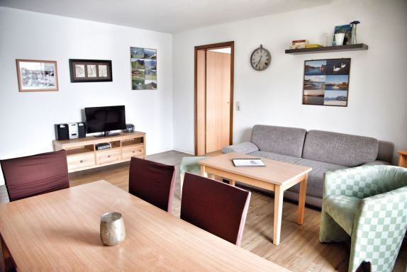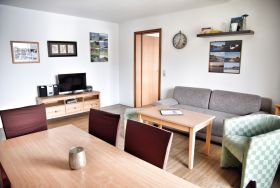 Ihr Wohnzimmer verfügt über einen Esstisch mit sechs Stühlen, ein ausziehbares Klappsofa mit einem Schlafplatz für zwei Personen und einem Sessel mit Fußhocker. Für die Übernachtungsgäste des Wohnzimmers steht Ihnen ein kleiner Schrank für Ihre Mitbringsel zur Verfügung. Multimedial wartet hier ein Flachbildfernseher auf Sie. Ihre Ferienwohnung hat einen Kabelanschluss. Auch einige Gesellschaftsspiele dürfen im Bestand nicht fehlen. Im großen und kleinen Schlafzimmer befinden sich ein Doppelbett. Nachtische, Leselampen und Garderoben möchten hier von Ihnen genutzt werden. Die Kleiderschränke werden Ihnen gute Dienste leisten.