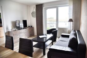Ihr Wohnzimmer verfügt über einen Esstisch mit sechs Stühlen, ein ausziehbares Klappsofa mit einem Schlafplatz für zwei Personen und einen Sessel. Multimedial stehen Ihnen ein großer Flachbildfernseher zur Verfügung. Die Ferienwohnung hat auch einen Kabelanschluss.