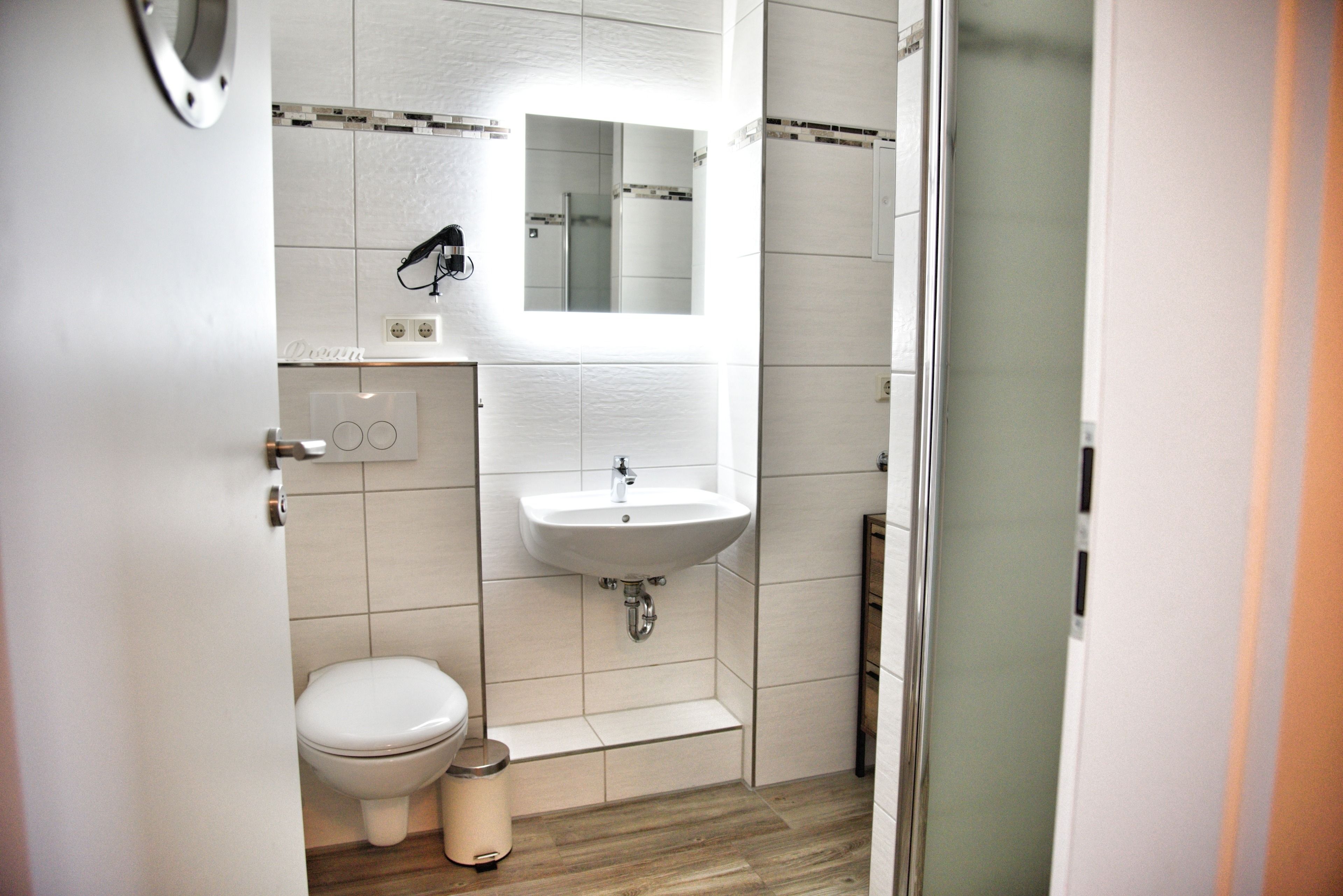 Die moderne Küche verfügt über eine komplett ausgestattete Küchenzeile, mit Cerankochfeld, Backofen, Geschirrspüler, Mikrowelle, viel Geschirr, sowie einem Kühlschrank mit kleinem Gefrierfach. Das neu geflieste Badezimmer hat eine Dusche mit ausreichend Ablageflächen. Ihre mitgebrachten Utensilien werden Sie hier gut verstauen können. Eine Garderobe im Flur ziert Ihren Eingangsbereich.