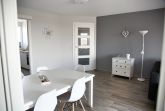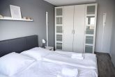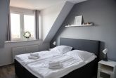 Das Wohnzimmer verfügt über einen großen Esstisch mit sechs Stühlen, ein ausziehbares Schlafsofa mit einem Schlafplatz für zwei Personen und einen Sessel. Multimedial stehen Ihnen ein Flachbildfernseher zur Verfügung. Ihre Ferienwohnung hat einen Kabelanschluss. Auch einige Gesellschaftsspiele warten hier schon auf Sie. Die beiden Schlafzimmer sind identisch groß und annähernd gleich geschnitten. In beiden Schlafzimmern stehen Ihnen ein Doppelbett, Nachttische und jeweils zwei große Kleiderschränke zur Verfügung.