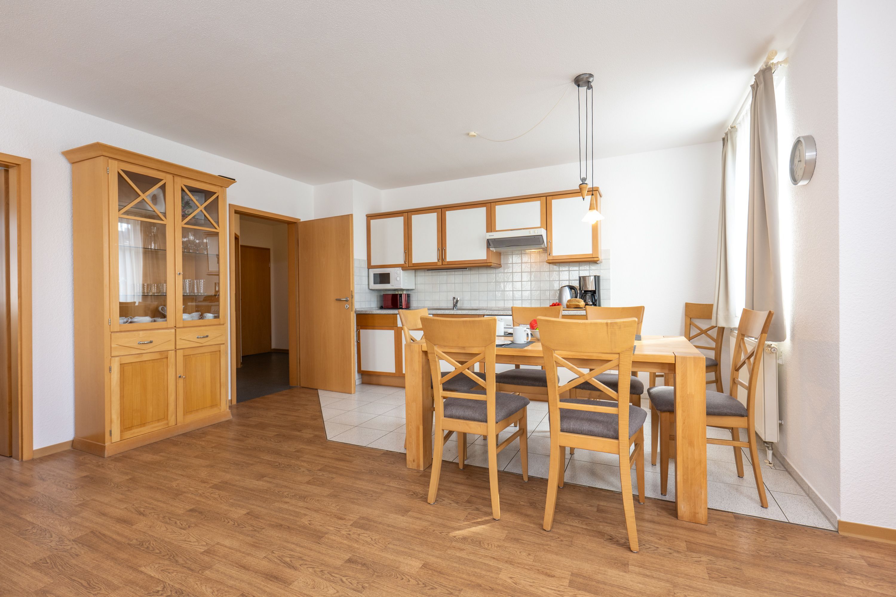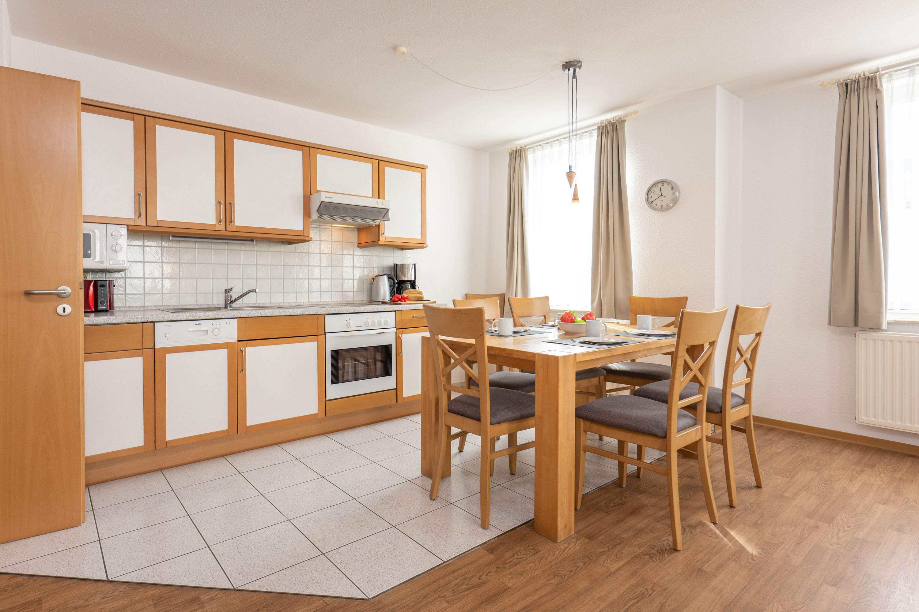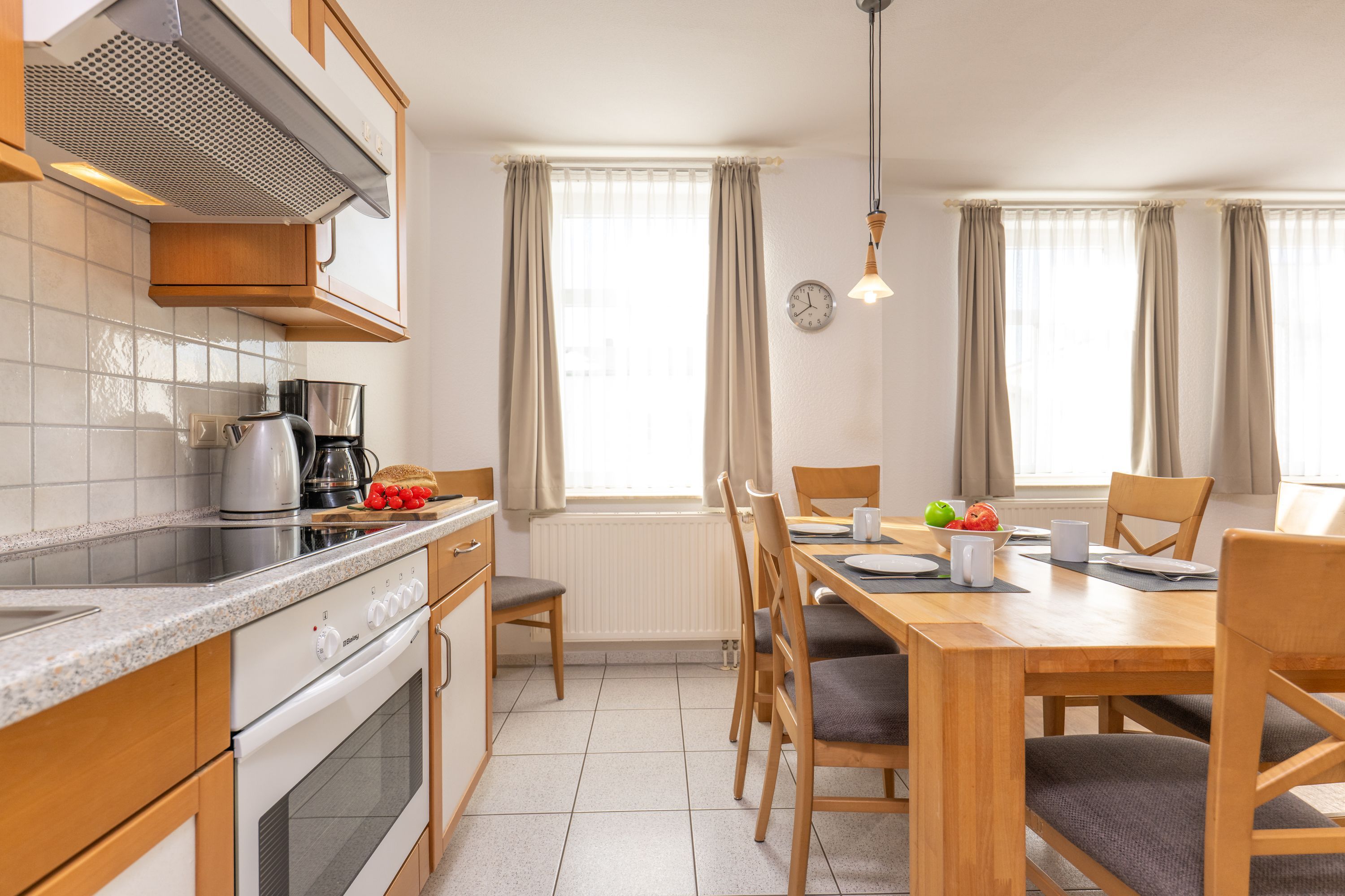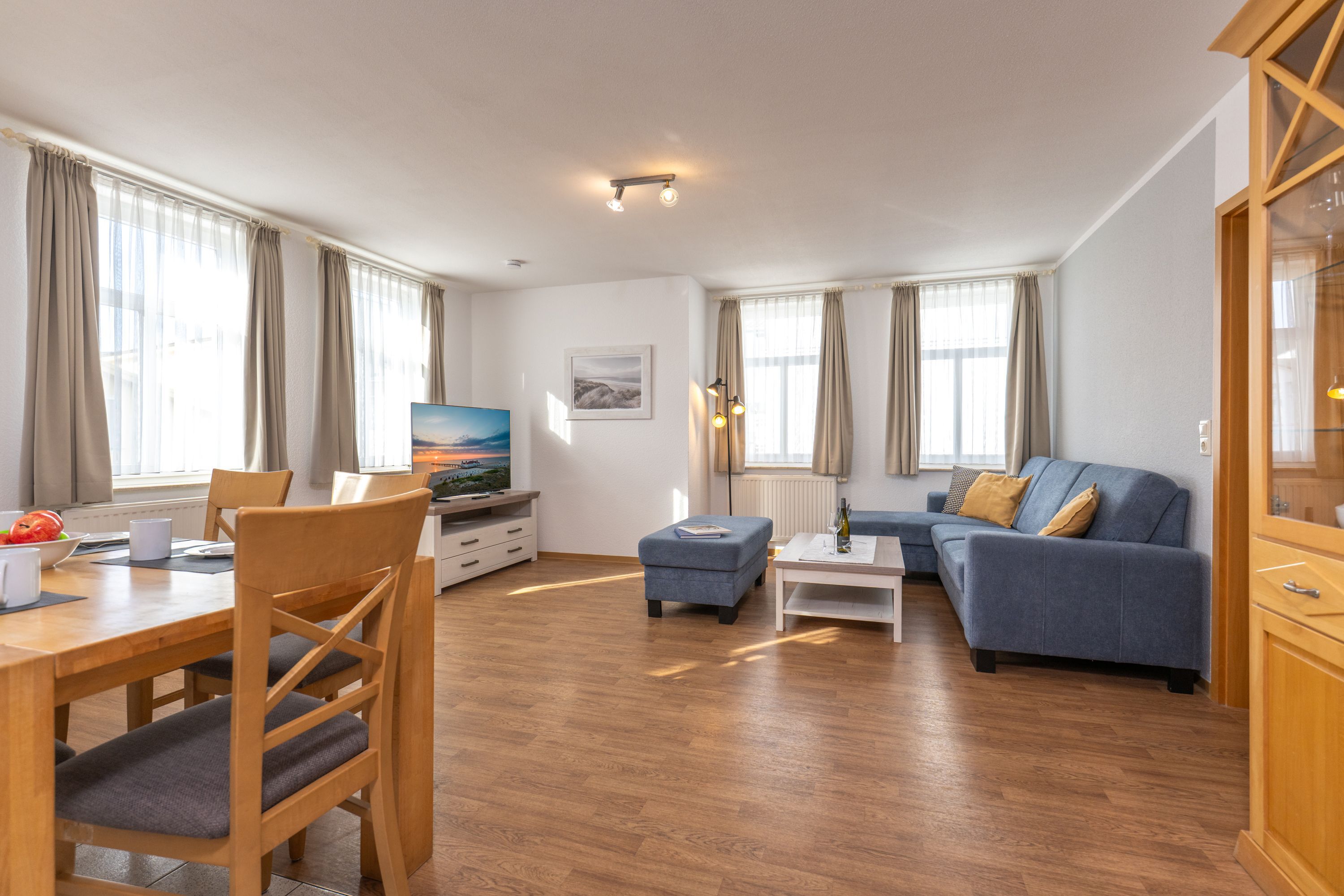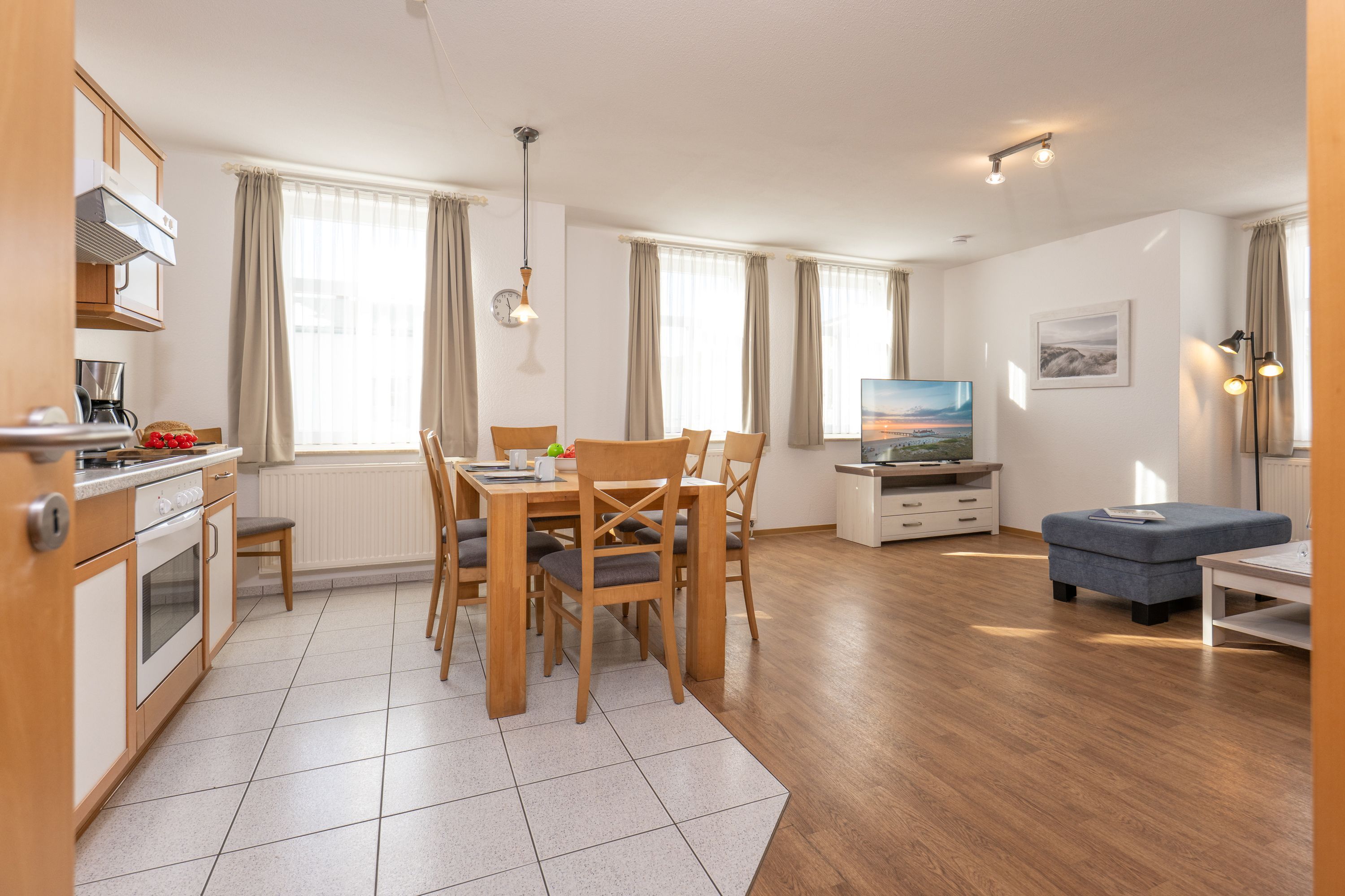 Wohnbereich: gemütliches, helles Wohnzimmer mit großem TV und angrenzendem Essbereich sowie voll ausgestatteter Küchenzeile