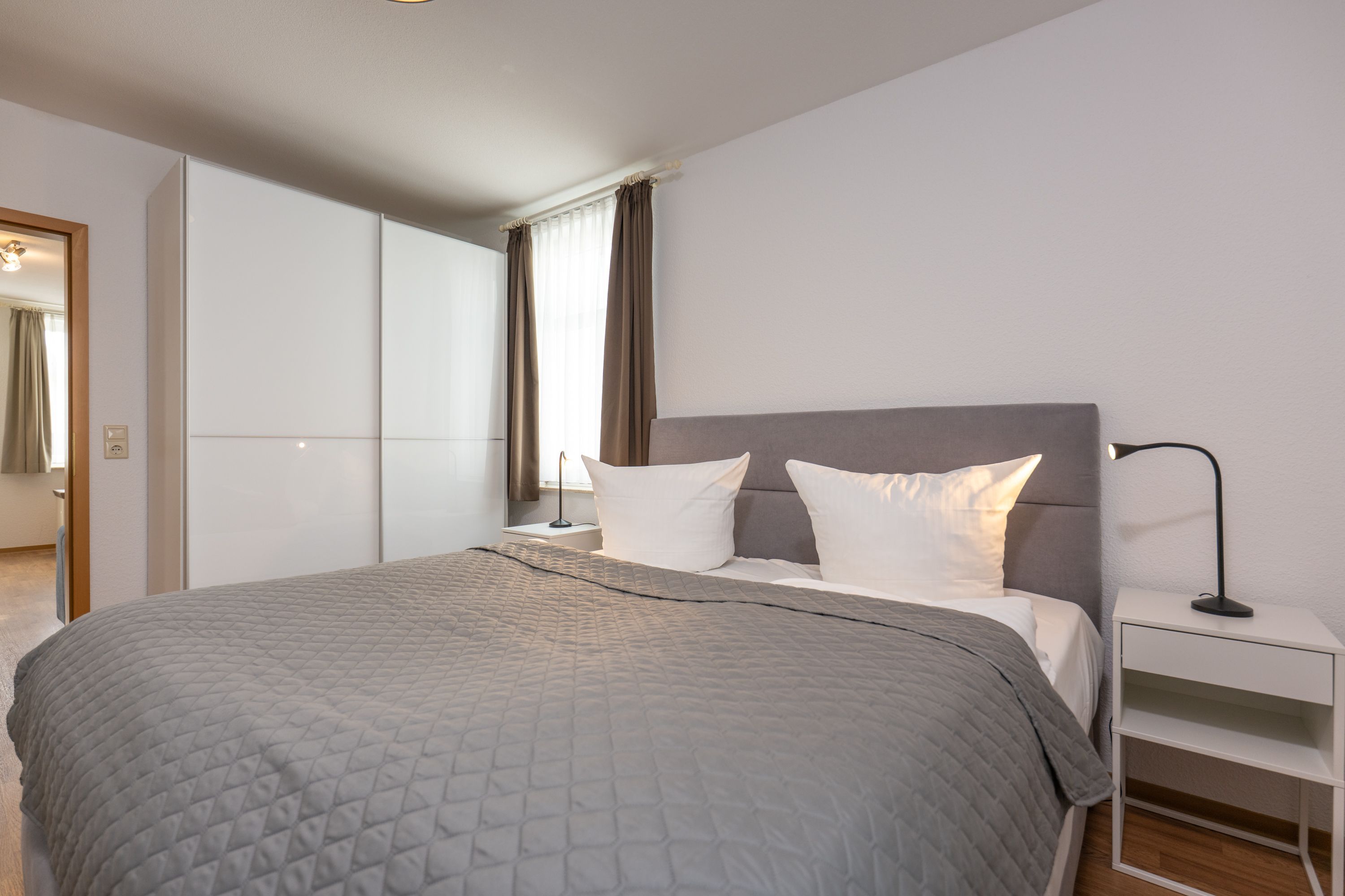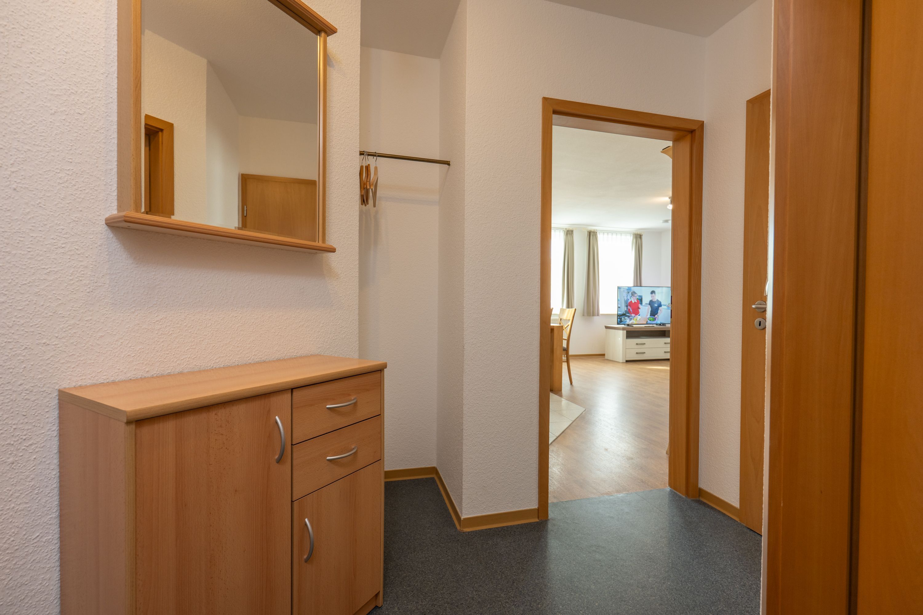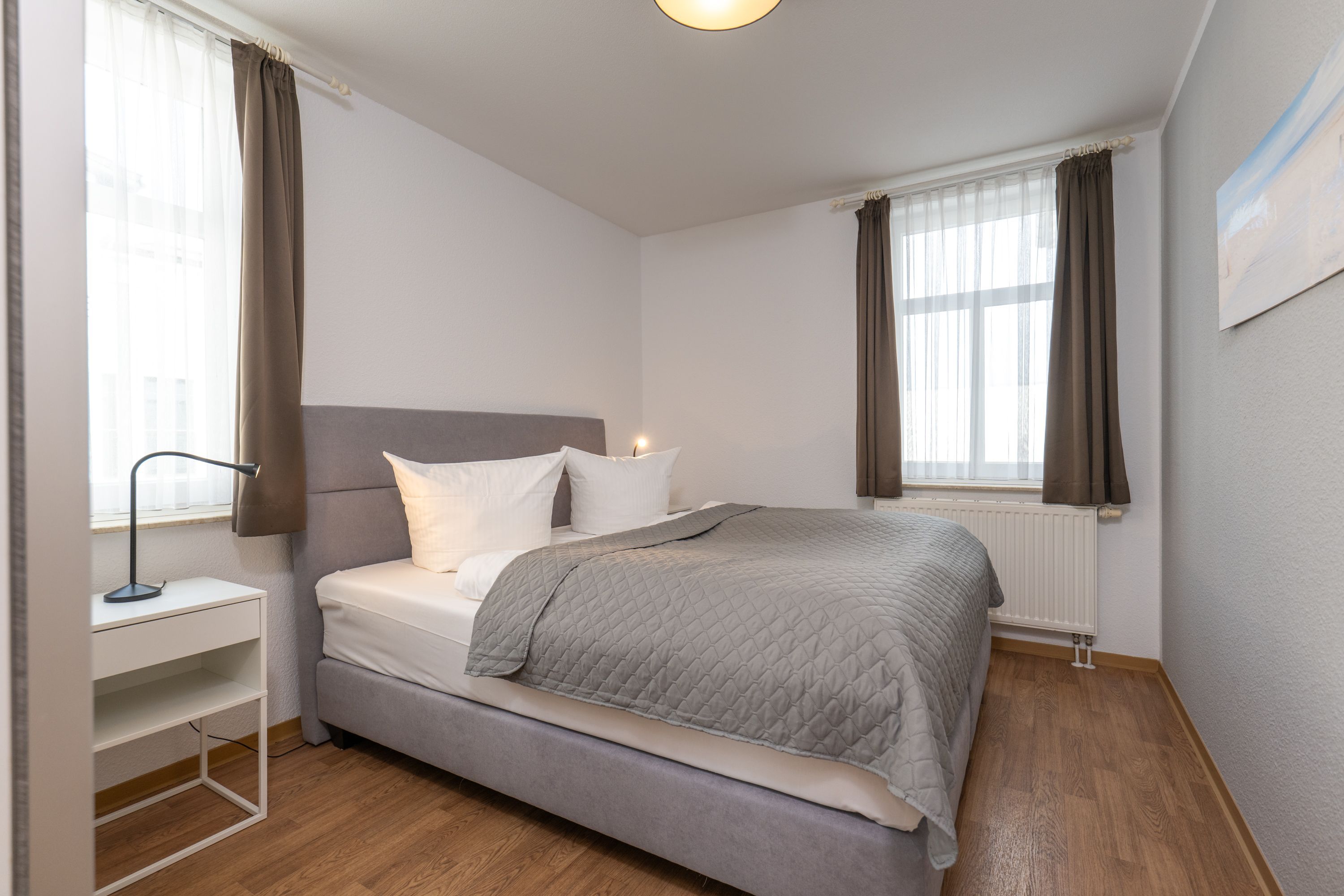 Schlafmöglichkeiten: Hauptschlafzimmer mit zweitem TV, hochwertigem Boxspringbett; zweites Schlafzimmer mit zwei Einzelbetten