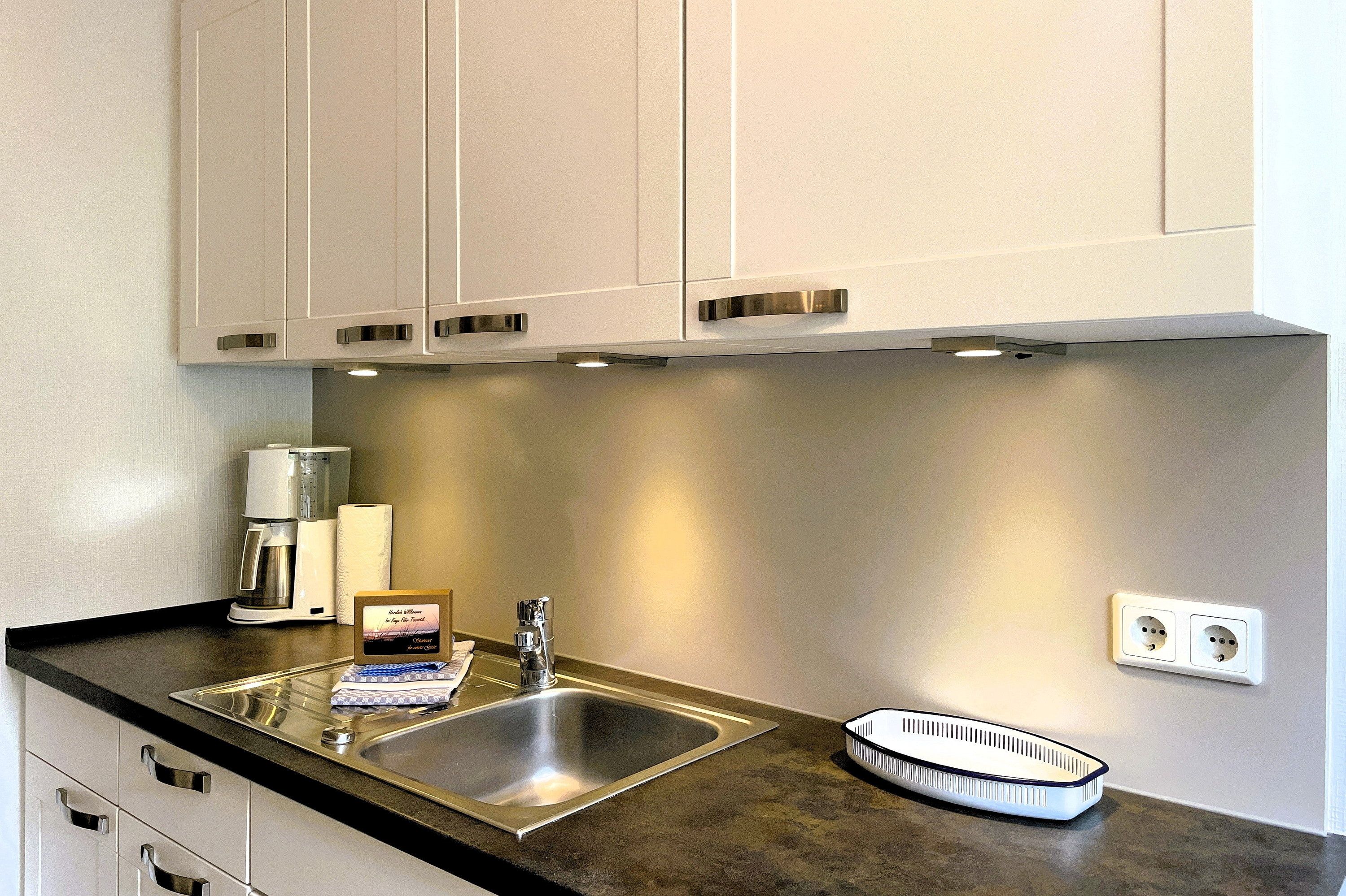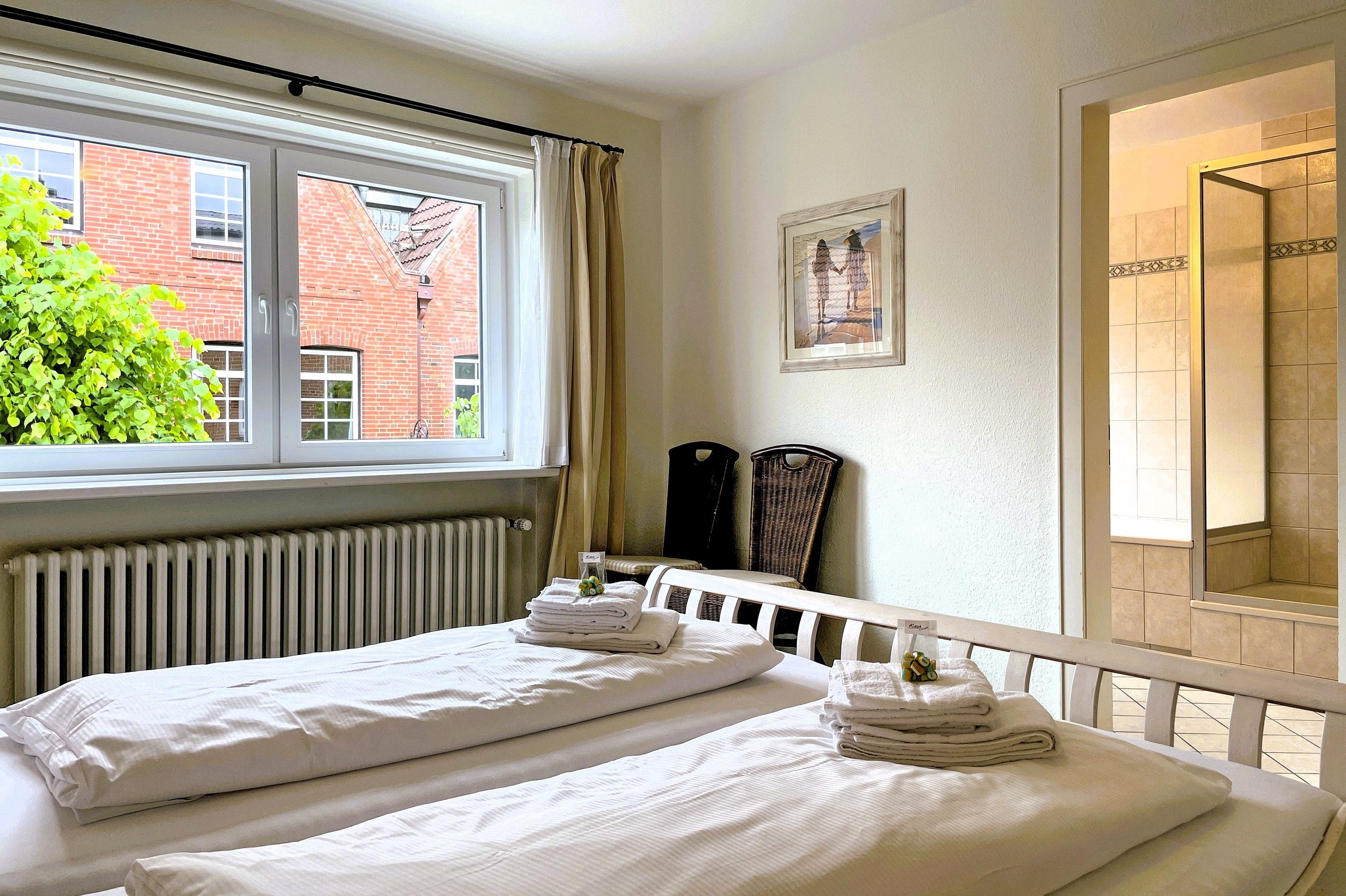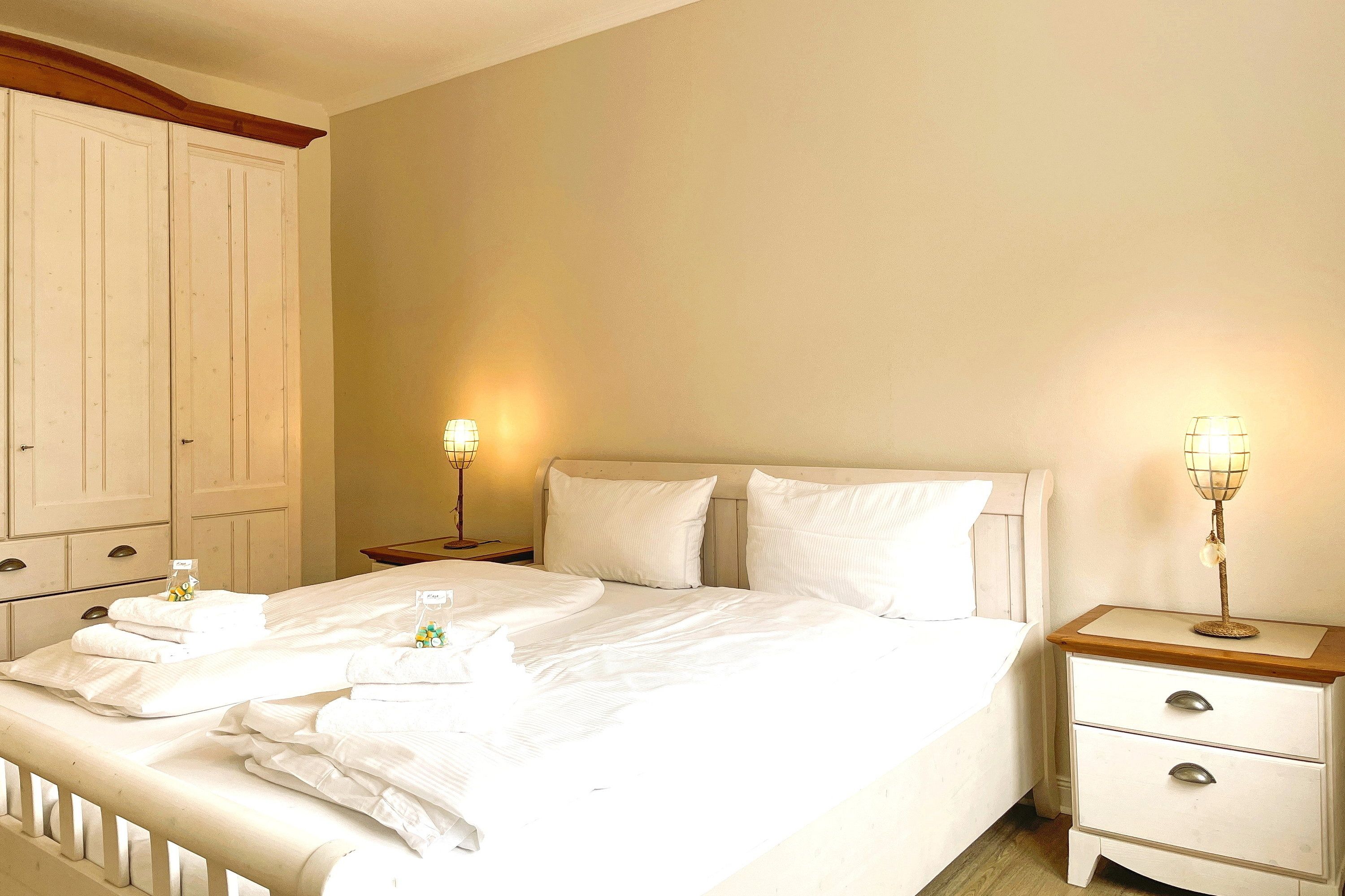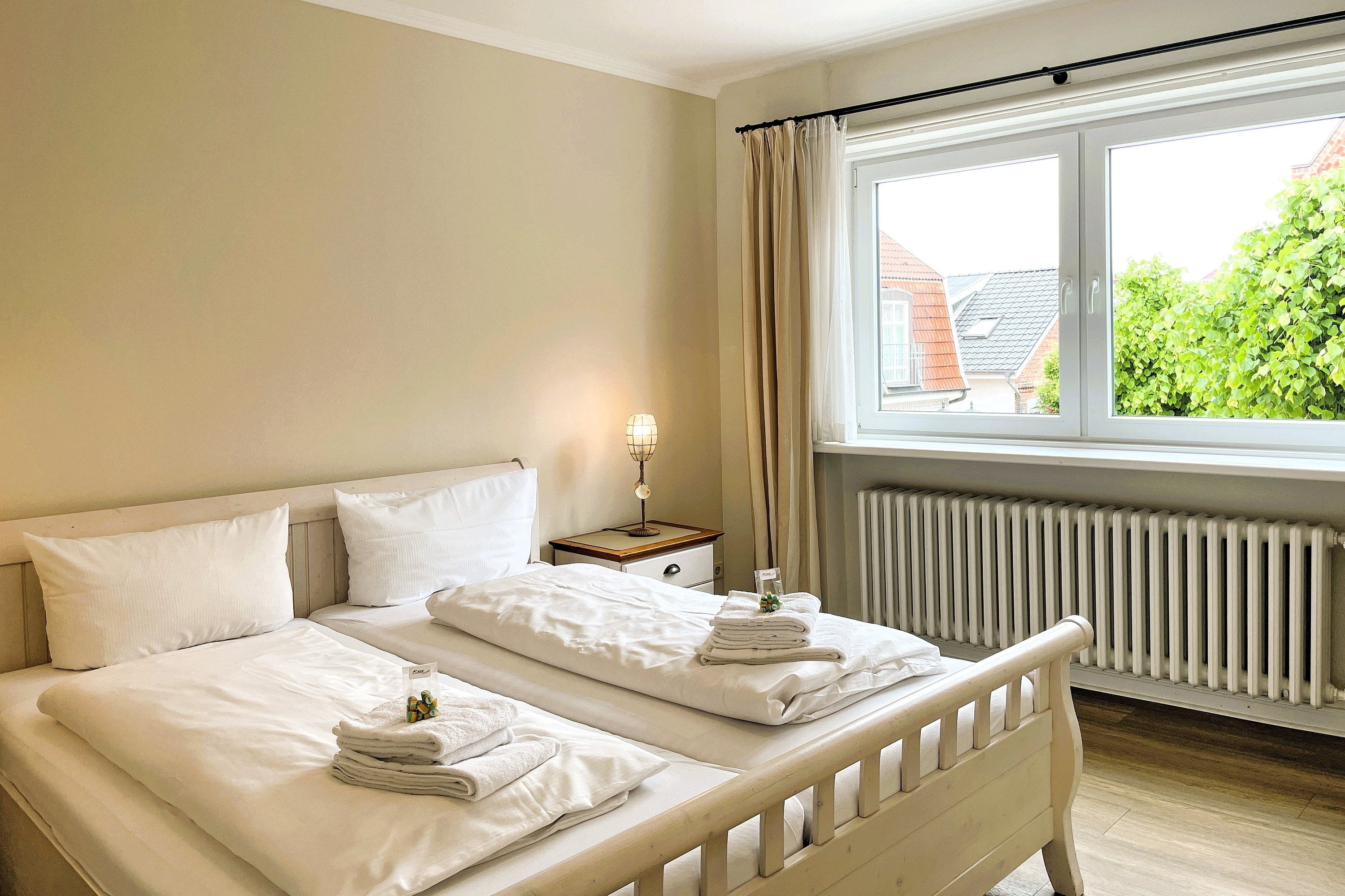 Die Wohnung Austernfischer befindet sich in der ersten Etage eines Hauses mitten in der Wyker Innenstadt. Genießen Sie eine helle und freundliche Wohnung, die sich durch Geradlinigkeit verbunden mit liebevollen Details und hochwertiger Ausstattung auszeichnet. Hier können bis zu 4 Personen (inklusive eventuell benötigtem Kinderbett) herrliche Urlaubstage verbringen. Der Wohnraum mit robusten, weißen Möbeln und gemütlichem farbenfrohen Schlafsofa (140 x200 cm), Flachbild-TV, Stereoanlage und WLAN ist geschmackvoll gestaltet und bietet zugleich einen gemütlichen Essplatz an. Die großzügige, separate und vollausgestattete Küche mit Ceranfeldherd, Backofen, Geschirrspüler und Mikrowelle ist ein Traum für jeden Hobbykoch und zwischendurch kann man sich am zusätzlichen Sitzplatz am Fenster auch eine kleine Auszeit nehmen solange nichts überkocht. Das Schlafzimmer mit Doppelbett und geräumigem Kleiderschrank ist, wie das Wohnzimmer auch, mit weißen Möbeln ausgestattet und die kleinen und feinen Details wie die farbenfrohe Tapete am Kopfteil verleihen der Wohnung Ihre Gemütlichkeit. Das Badezimmer ist großzügig geschnitten und verfügt über eine Badewanne und eine Dusche sowie zwei Waschtischen und bietet genügend Platz. Eine Abstellmöglichkeit für Fahrräder befindet sich im Hof. Ein kleiner Stadtbummel oder der Besuch am Strand ist somit zu jeder Tageszeit möglich und sei es auch nur für wenige Minuten, wenn schon andere Urlaubspläne geschmiedet sind. Ihr Auto können Sie unweit der Wyker Innenstadt auf dem öffentlichen Inselparkplatz abstellen. Erleben Sie das friedliche Wyker Stadt- und Strandleben hautnah und genießen Sie schon vor dem Frühstück den Blick auf die Nordsee beim Brötchen holen..