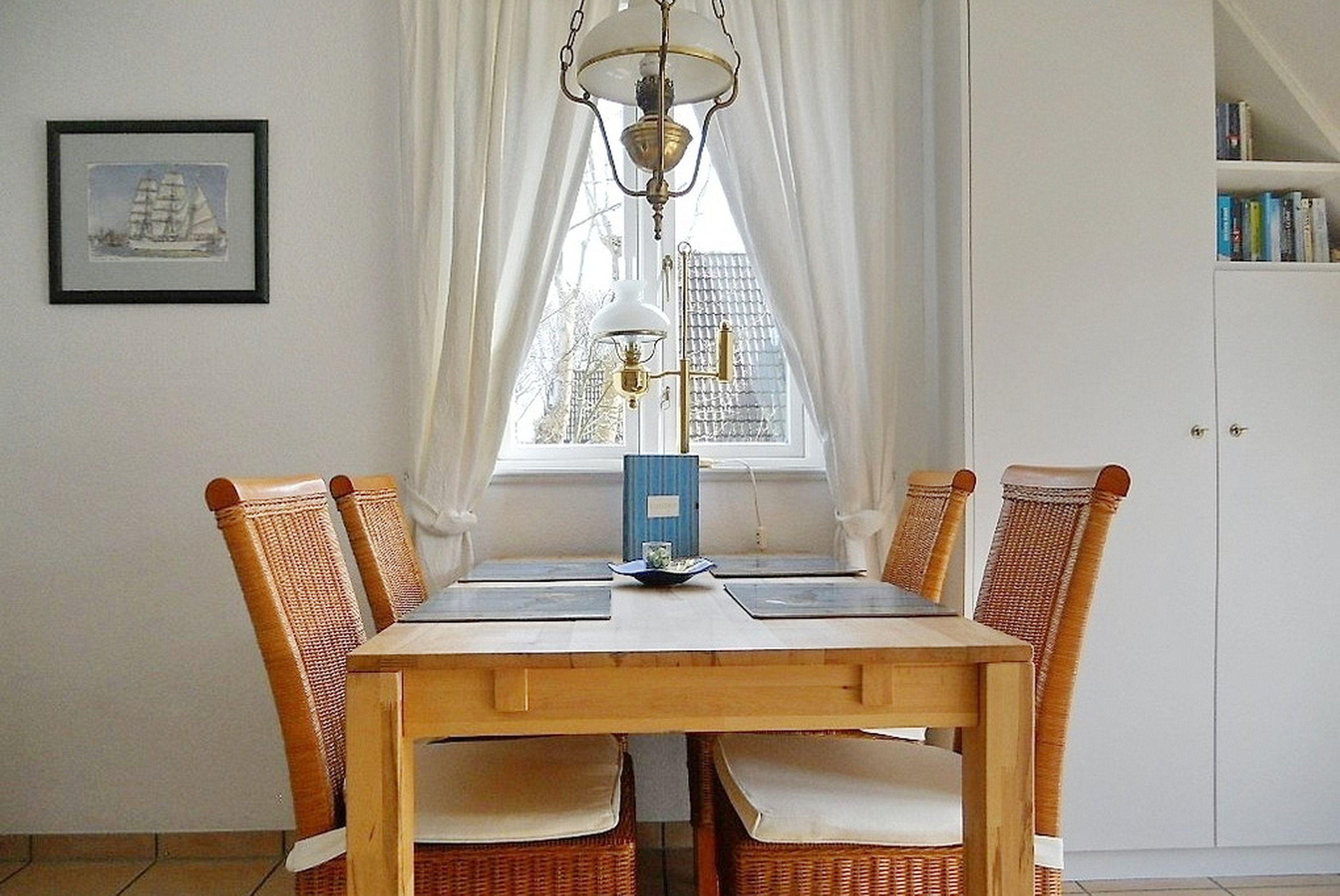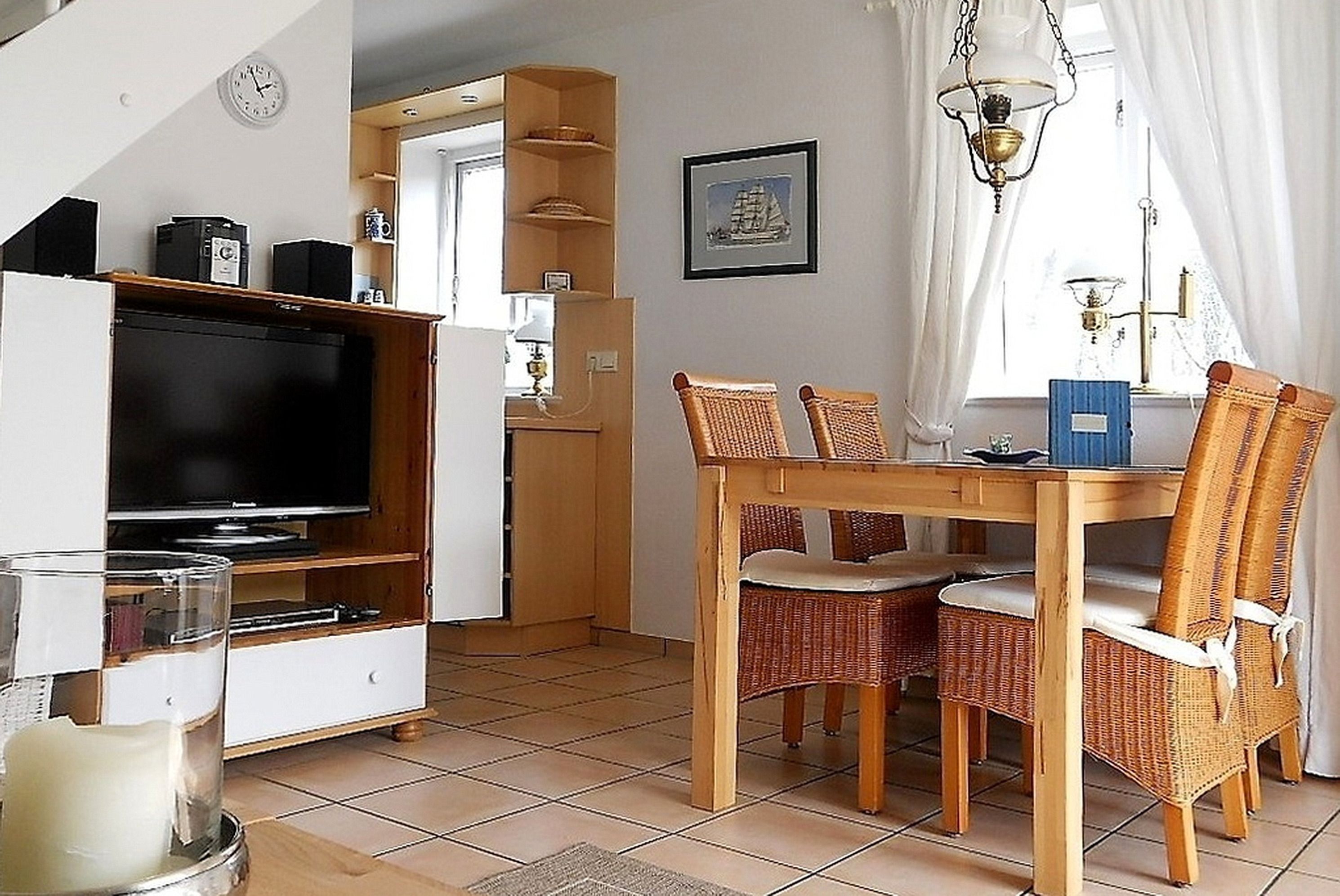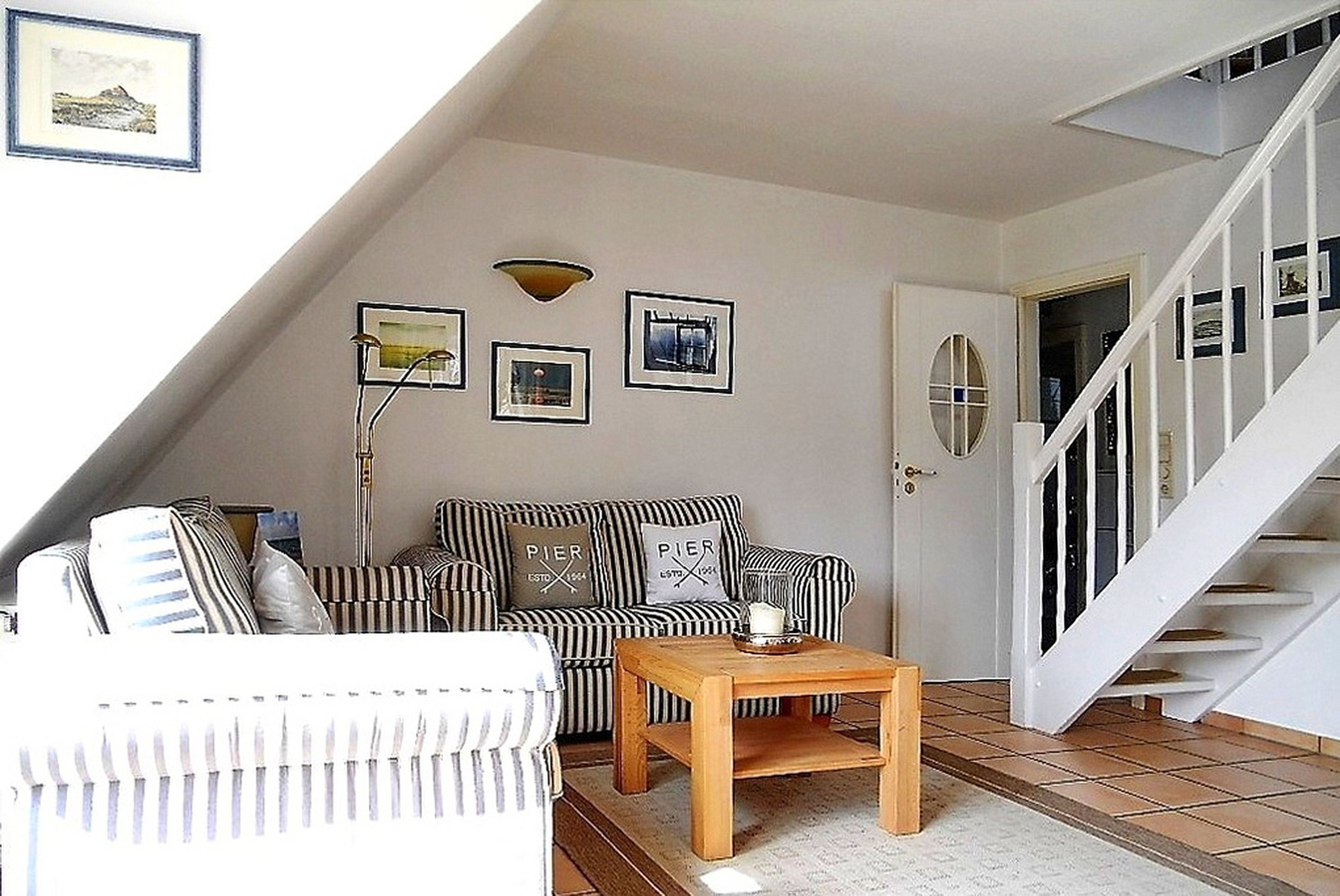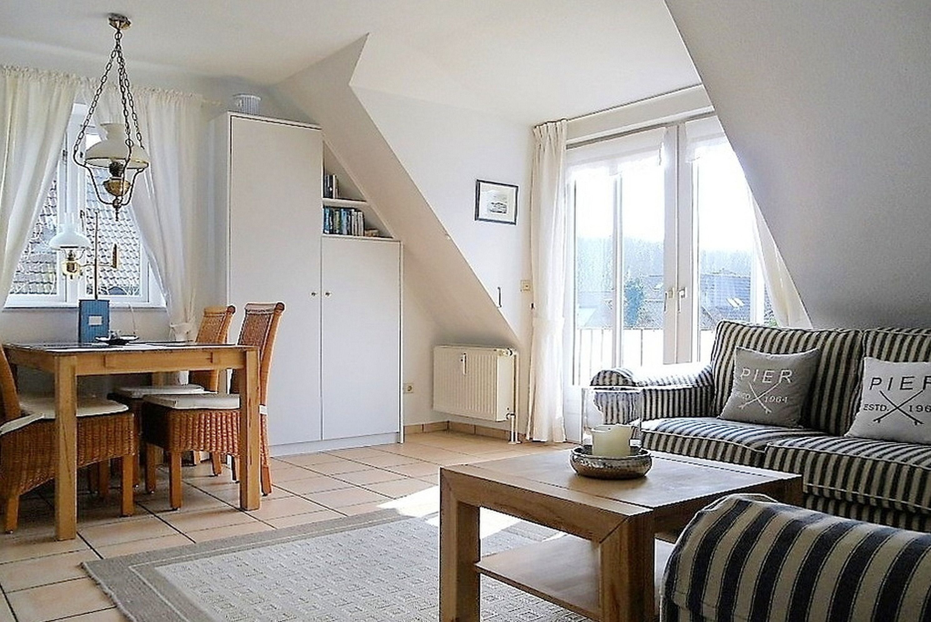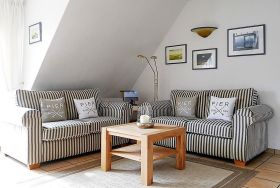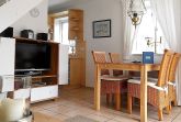 Unsere gemütliche Obergeschosswohnung Friesenperle 6 erstreckt sich über zwei Etagen und bietet 4 Gästen ausreichend Platz erholsame Urlaubstage zu verbringen. Das Bad ist mit Dusche mit flachem Einstieg und Handtuchheizkörper ist, verfügt über einen Doppelwaschtisch und ein Fenster. Der Schlafraum mit Doppelbett (160 x 200 cm) und Dachfenster mit Blick zu den Sternen lädt zum Träumen ein. Der Hauptwohnbereich mit integrierter Küche und Essplatz wirkt einladend und das Wohnzimmer mit zwei hübschen Sofagarnituren, WLAN, Flachbild-TV, DVD-Player, Haustelefon und Stereoanlage eignet sich hervorragend zum Entspannen. Von hier aus gelangen Sie auf den Südbalkon mit Gartenmöbeln (ca. April bis Oktober). Die Küchenzeile mit Ceranfeldherd und Backofen, Geschirrspüler, Kühlschrank mit Gefrierfach, Kaffeemaschine und einer zusätzlichen Senseo Maschine ist vollausgestattet. Im 2. Obergeschoss finden Sie einen weiteren offenen Schlafbereich vor mit zwei Einzelbetten (90 x 200 cm) und einem zweiten Fernseher. Ihr Hund ist hier ebenfalls herzlich Willkommen. Genießen Sie herrliche Urlaubstage in einer Wohnung, die keine Wünsche offen lässt.