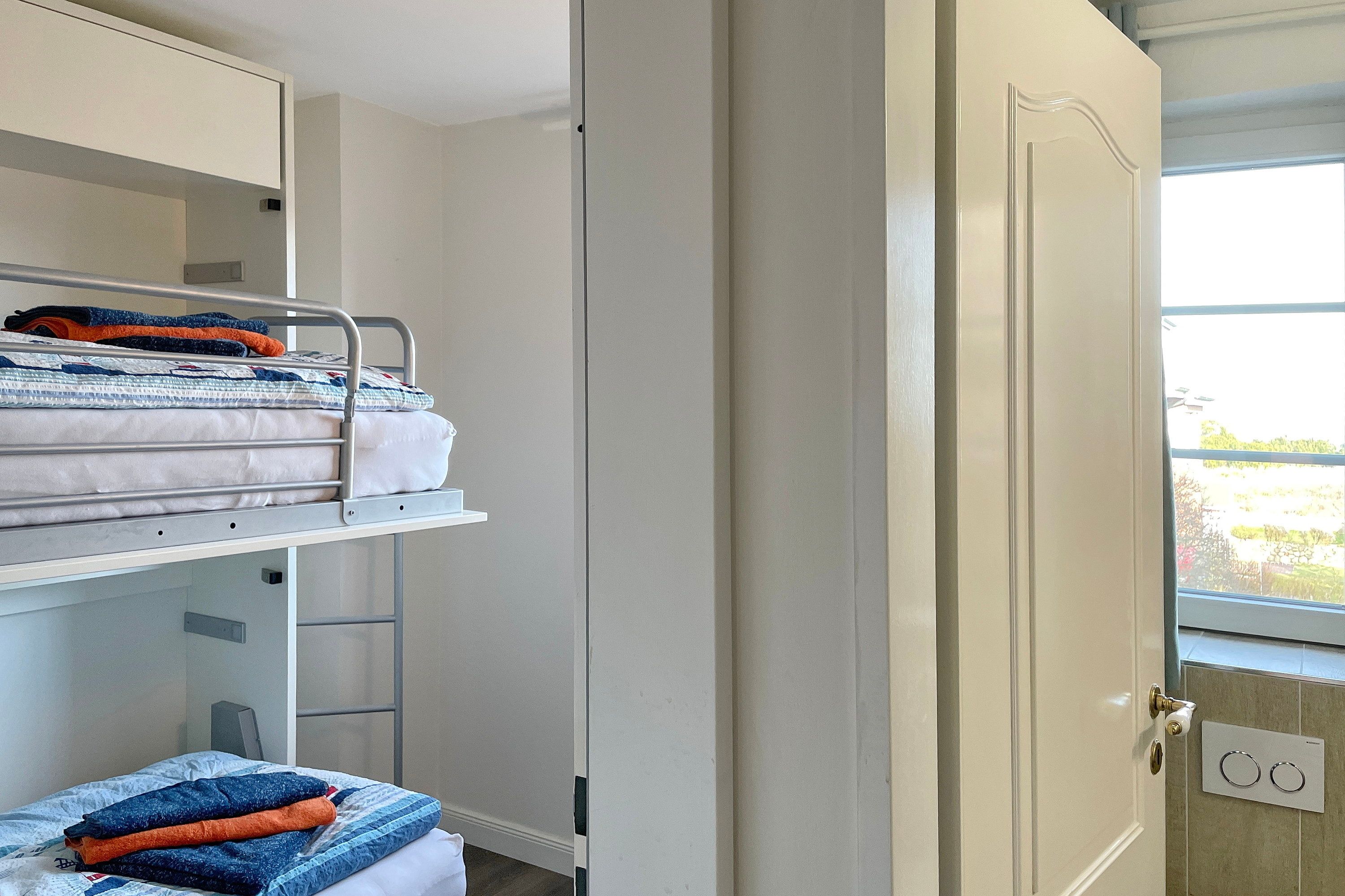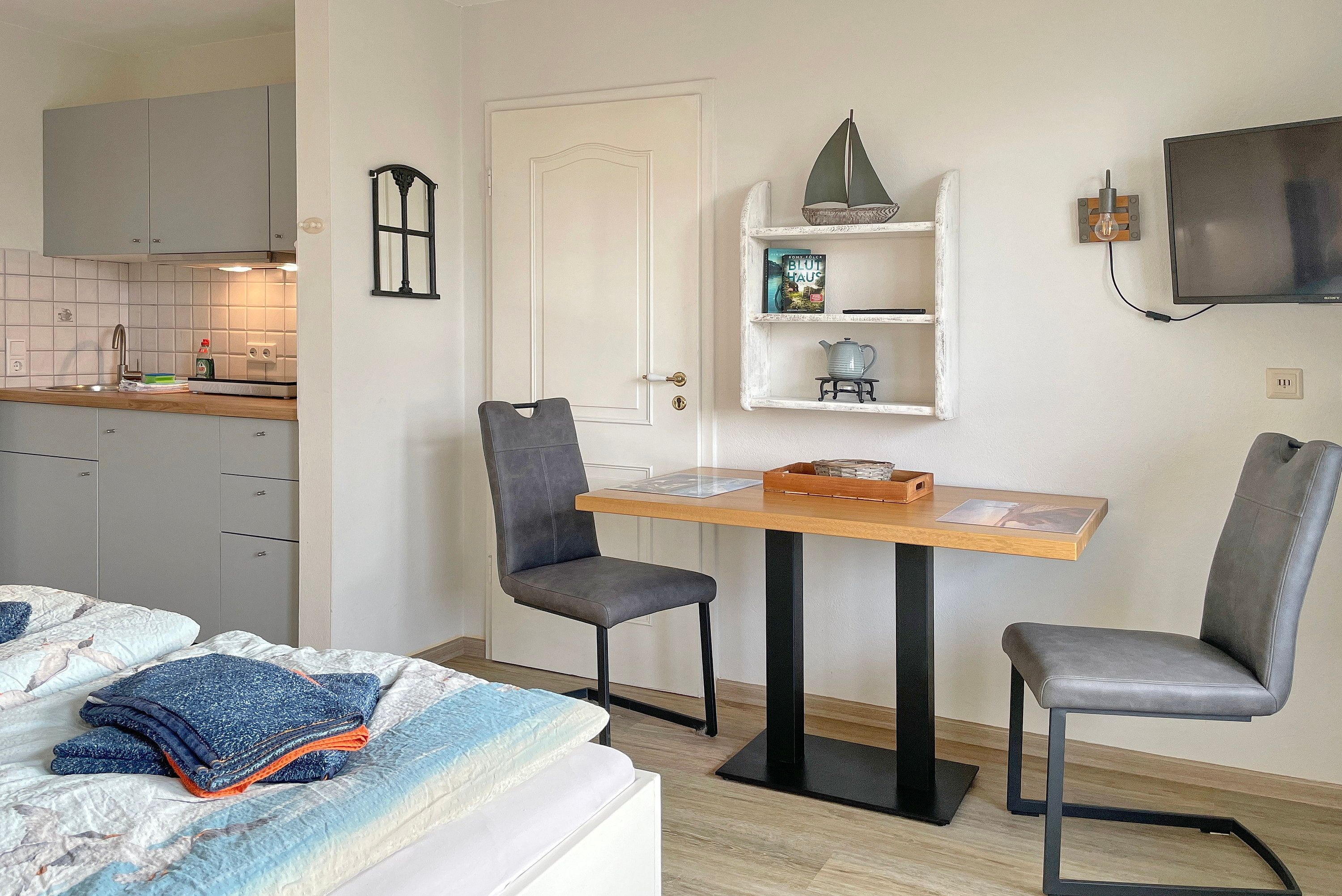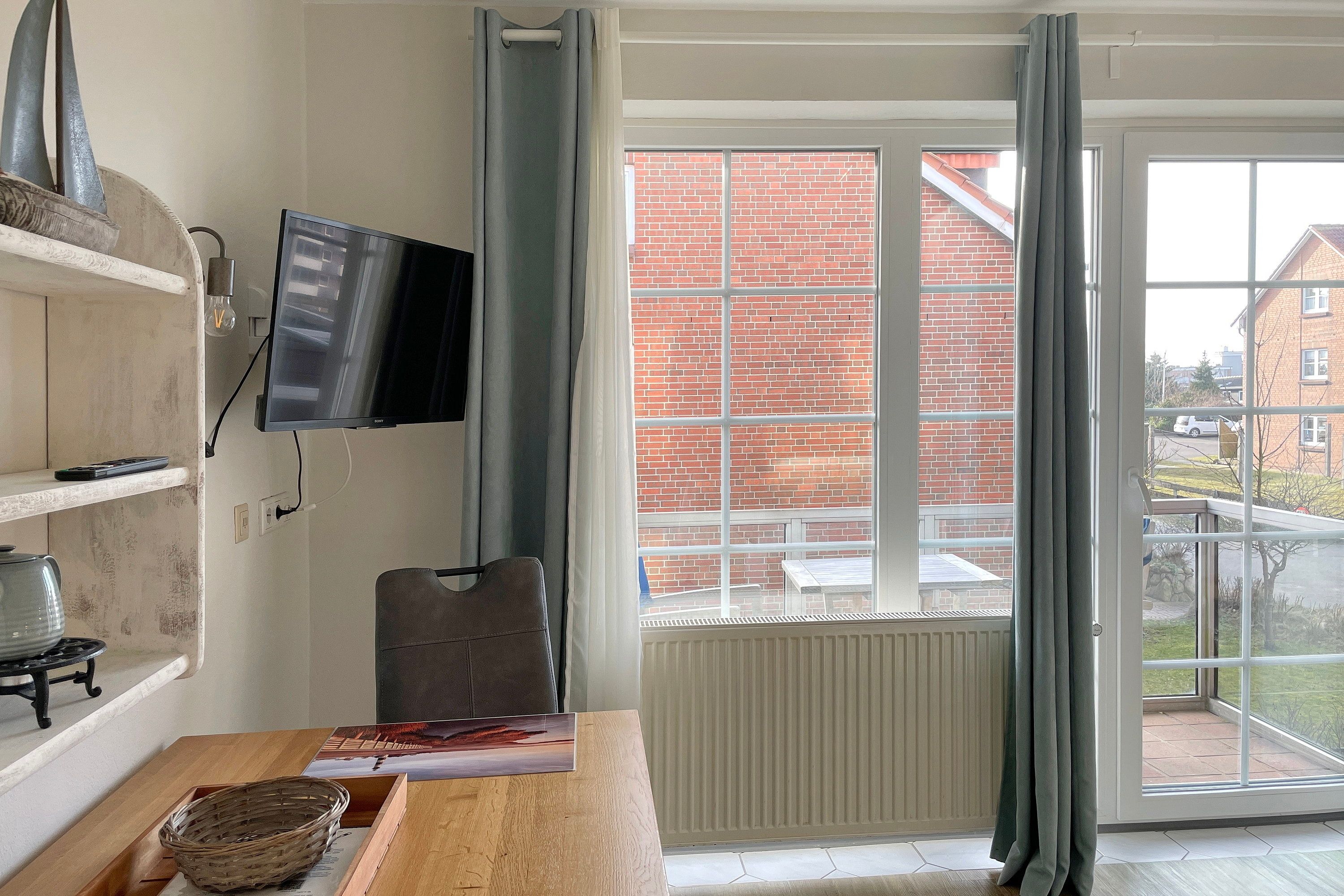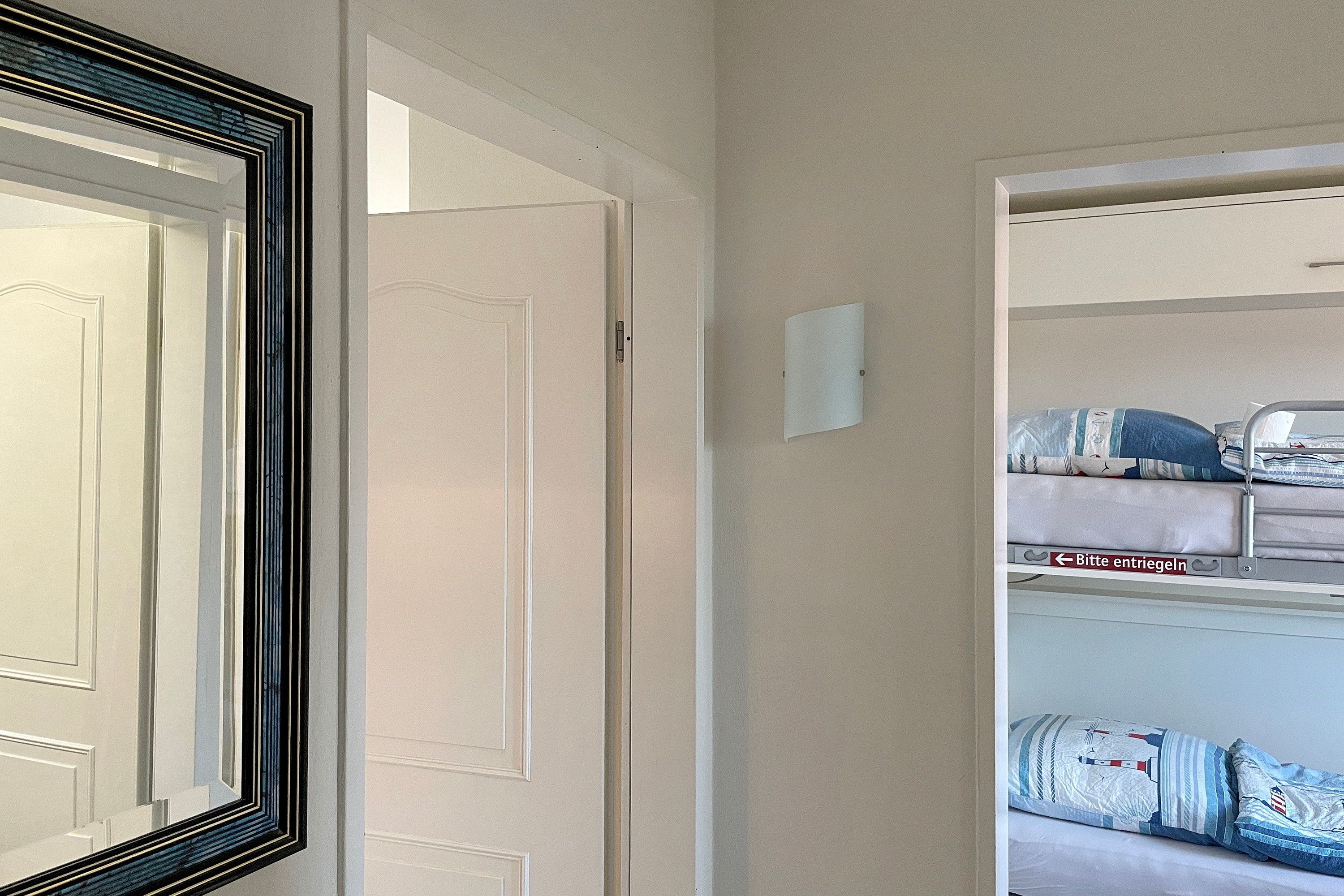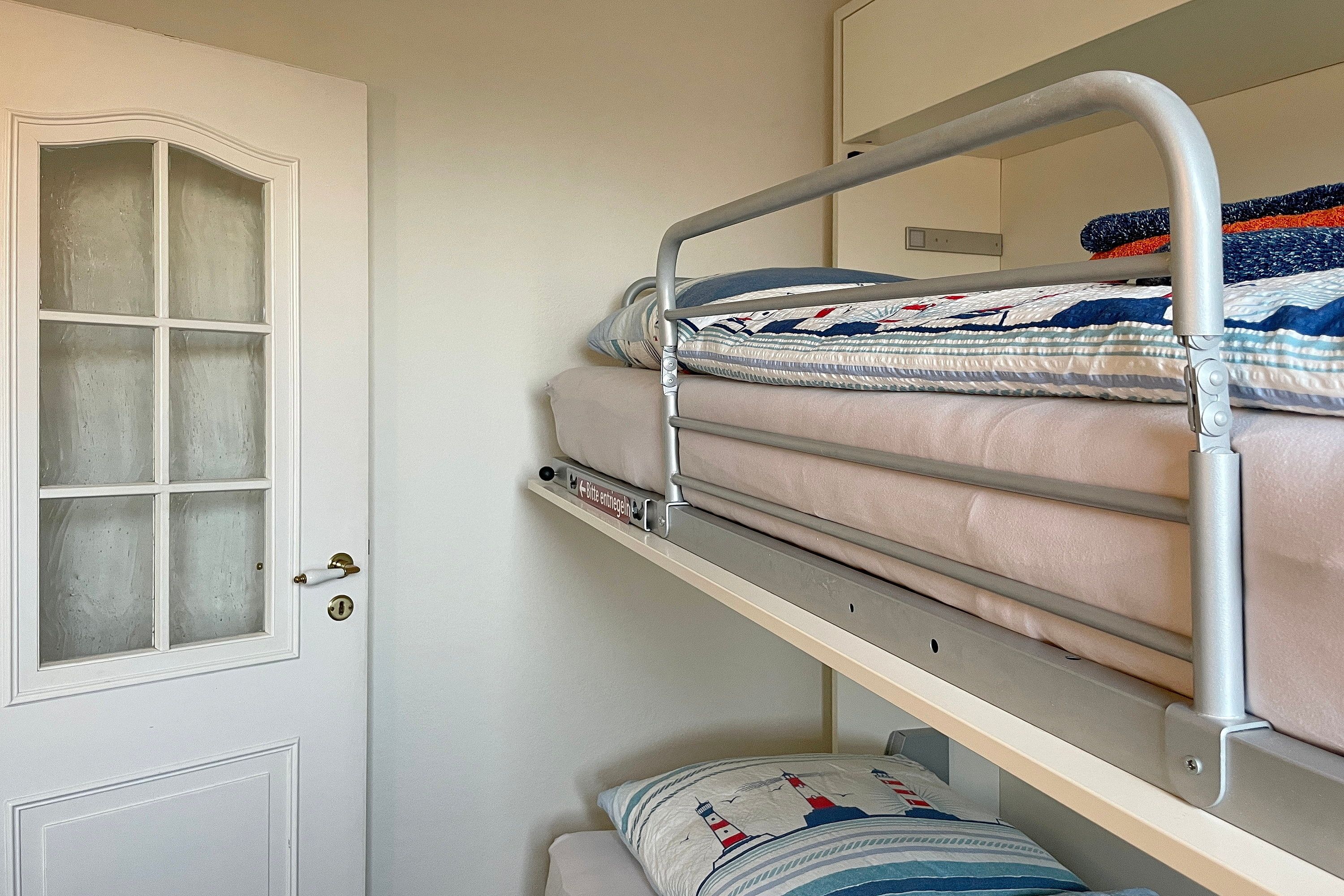 Lust auf einen Tapetenwechsel? Dann schnappen Sie sich Ihre Koffer und steuern Sie unsere gemütliche Ferienwohnung an! Zwei Zimmer stehen Ihnen zur Verfügung - perfekt für eine kleine Familie oder ein Pärchen mit Anhang. Im Wohn-/Schlafzimmer finden Sie alles, was das Herz begehrt: ein kuscheliges Doppelbett für süße Träume, einen Schrank mit genügend Platz und eine Küchenzeile für spontane Kochsessions. Am Esstisch lässt sich's prima schlemmen und plaudern. Nebenan wartet ein Schlafzimmer mit einem Etagenbett, dass einzeln aufgeklappt werden kann und somit auch als Einzelbett fungiert. Hier haben Sie den Blick aufs Meer ebenso wie vom Balkon. Das Bad gleich um die Ecke punktet mit Fenster, Dusche und WC - so können Sie sich gleich schnell fertig machen für einen herrlichen Tag auf Amrum. Der Clou: Vom Wohn-/Schlafzimmer aus geht's raus auf den Balkon. Hier können Sie die Beine hochlegen, die Sonne auf der Nase kitzeln lassen. Richtung Süd-Westen gelegen, verwöhnt er Sie mit reichlich Helligkeit. Im Untergeschoss steht Ihnen ein eigenes Gefrierfach für Ihre Eisvorräte zur Verfügung. Und keine Sorge um schmutzige Wäsche - die gemeinschaftliche Waschmaschine und Trockner können Sie gratis nutzen. Also, worauf warten Sie noch? Packen Sie Ihre sieben Sachen und machen Sie es sich in unserem gemütlichen Feriendomizil bequem. Hier können Sie so richtig die Seele baumeln lassen!