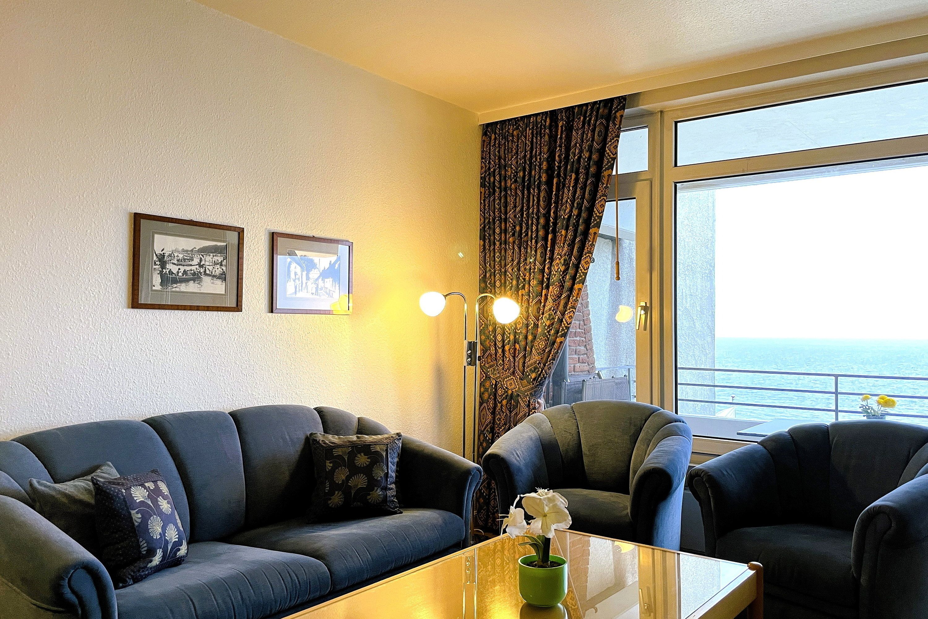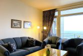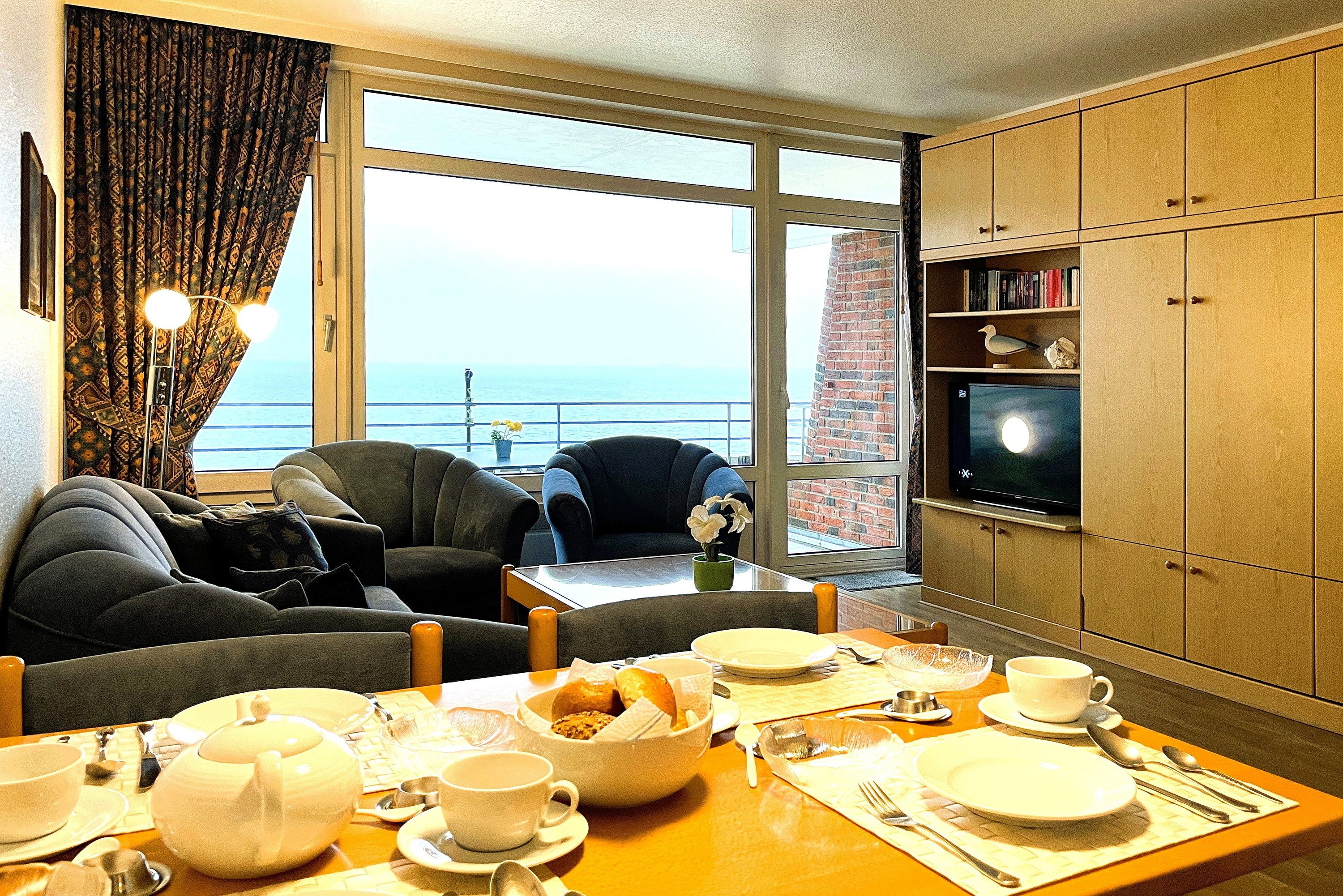 Von der riesigen Fensterfront des Wohnzimmers und dem sonnigen Balkon können Sie den direkten Meerblick genießen, der Sie zu einem ausgiebigen Urlaubsfrühstück einlädt.
