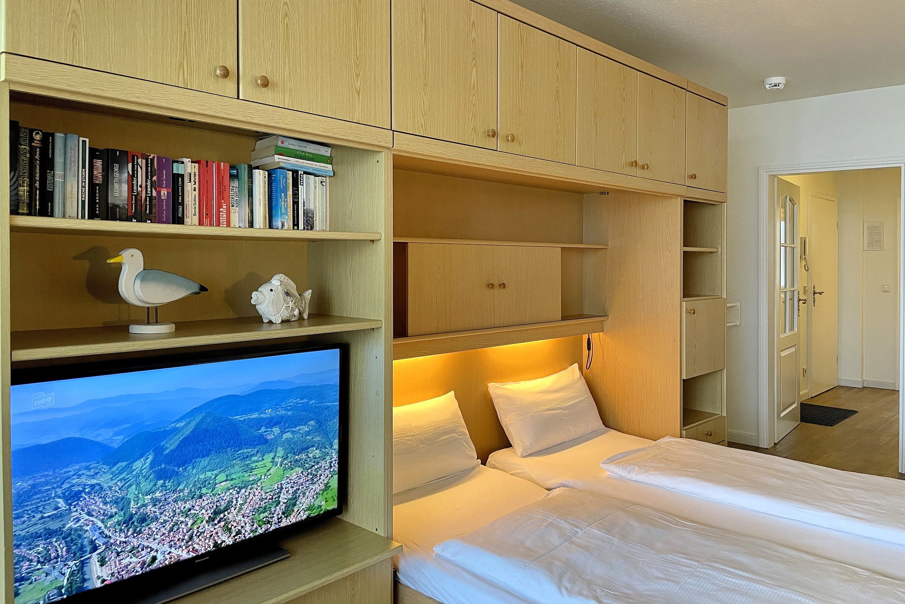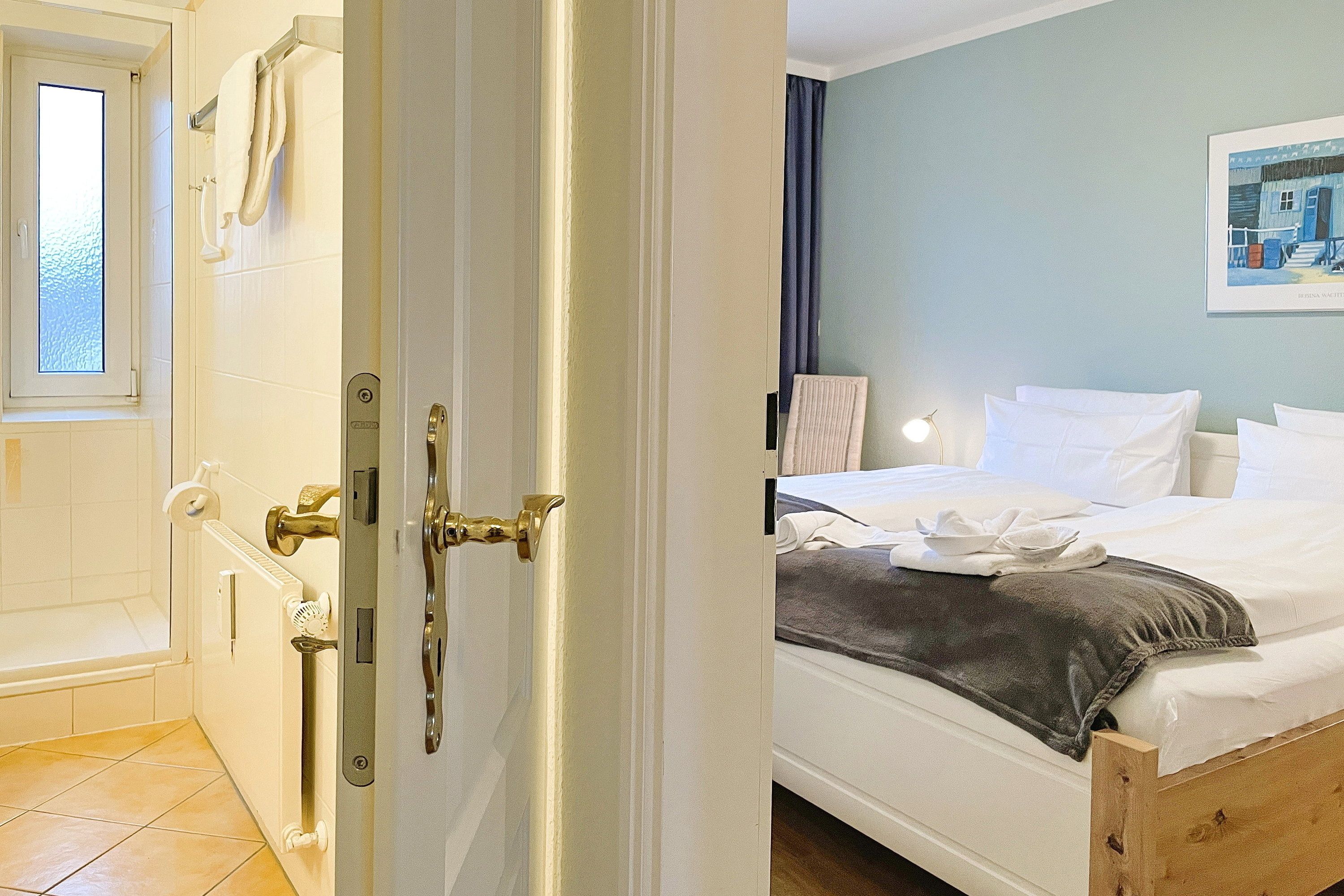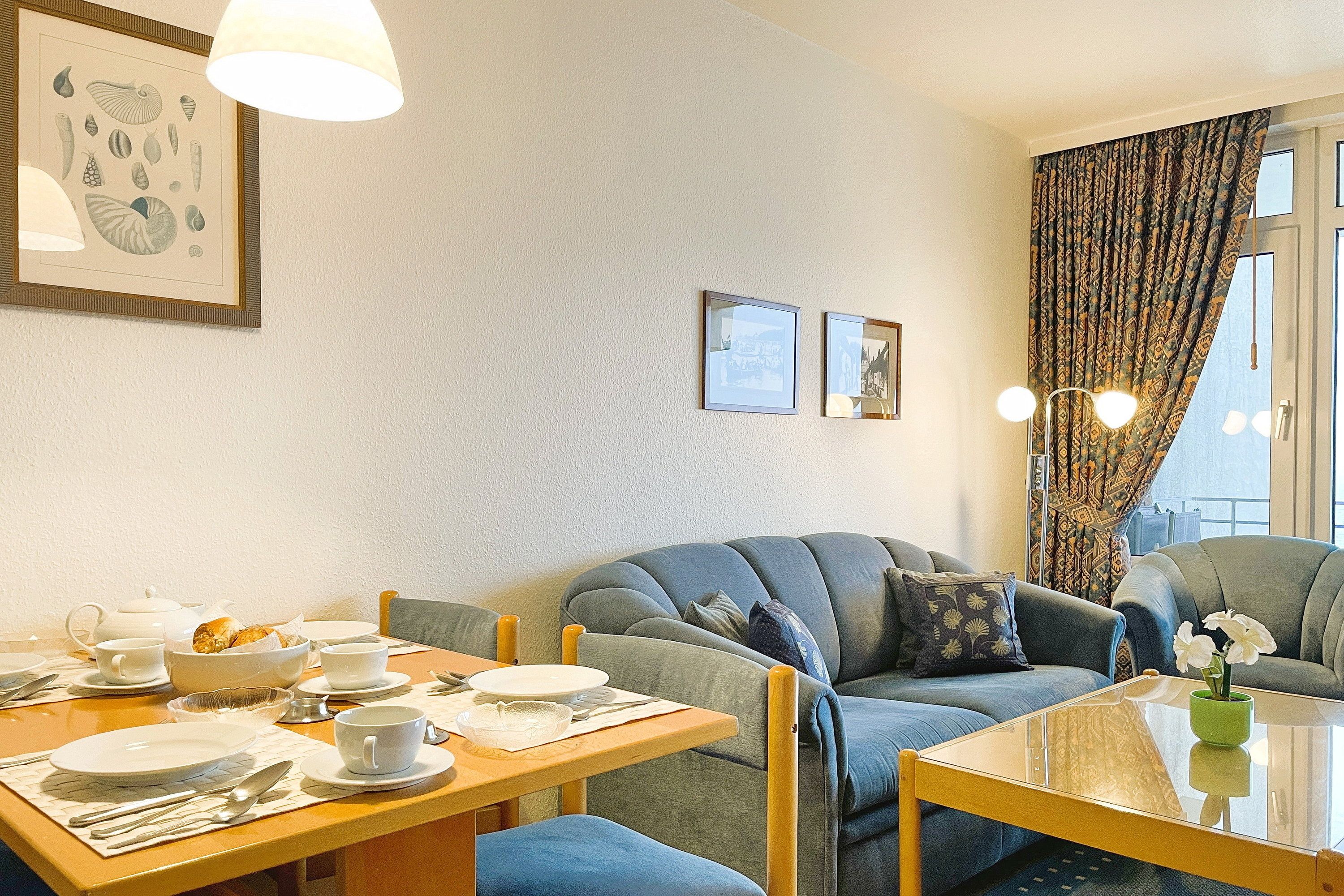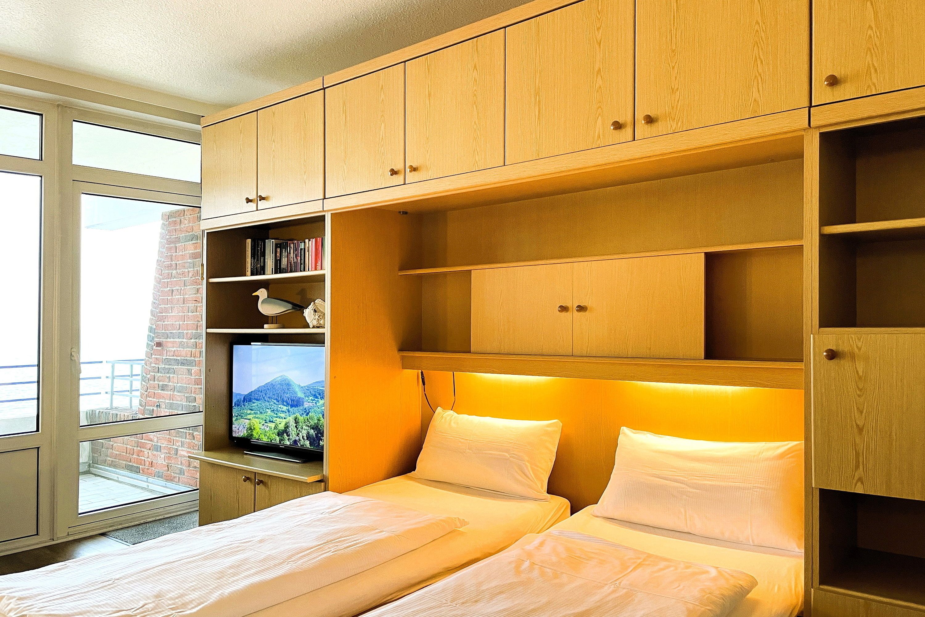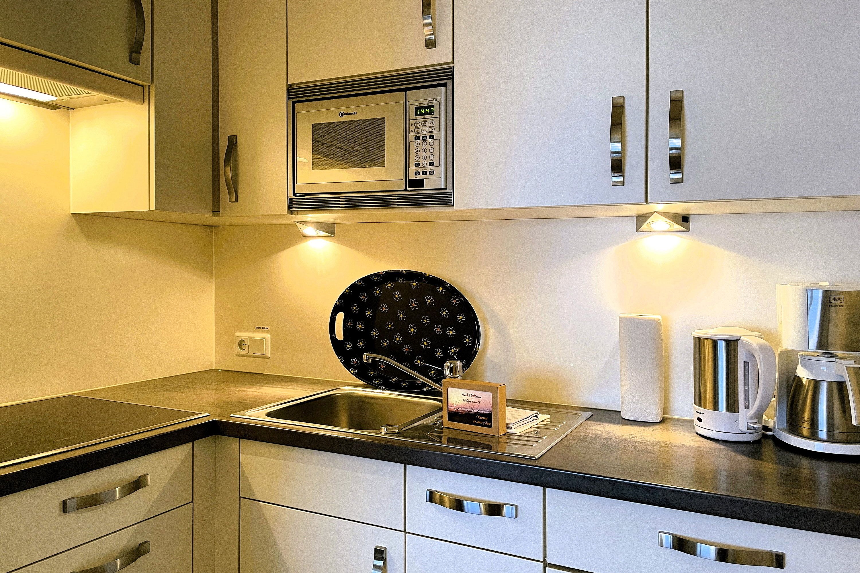 Bestehend aus einem Schlafzimmer mit Doppelbett (180 x 200cm), einem hellen und großen Wohnschlafzimmer mit Schrankbetten (180 x 190cm), einer Küchenzeile und einem gemütlichem Essbereich bietet die Wohnungen bis zu 4 Personen Platz. Ein zusätzliches Babybett kann ebenfalls aufgestellt werden. Die moderne, liebevoll in Stil und Farben abgestimmte Einrichtung erfüllt gehobene Ansprüche und lässt Sie Ihre Urlaubstage mit allem nötigen Komfort so richtig genießen. Die Küche verfügt u.a. über Mikrowelle, Toaster, Kaffeemaschine und Wasserkocher usw...