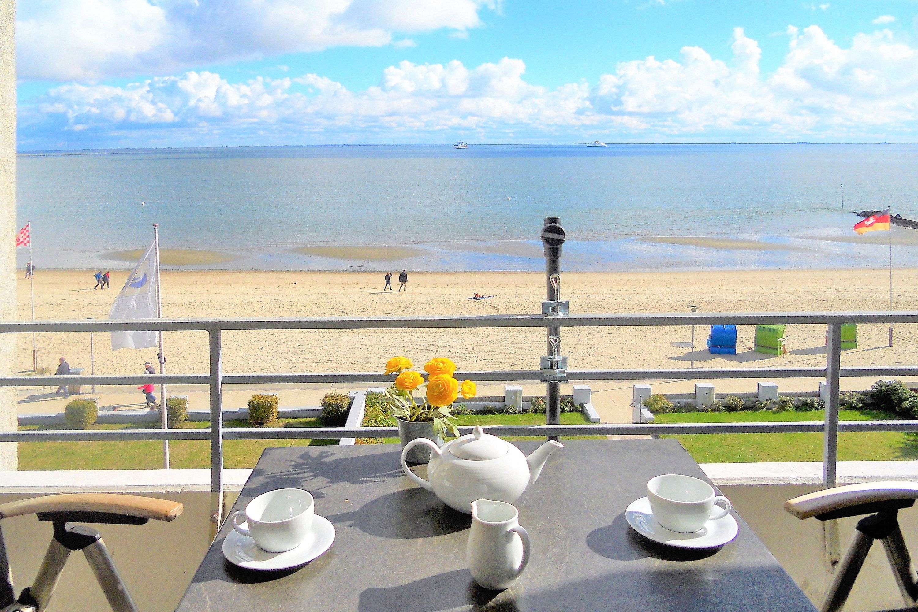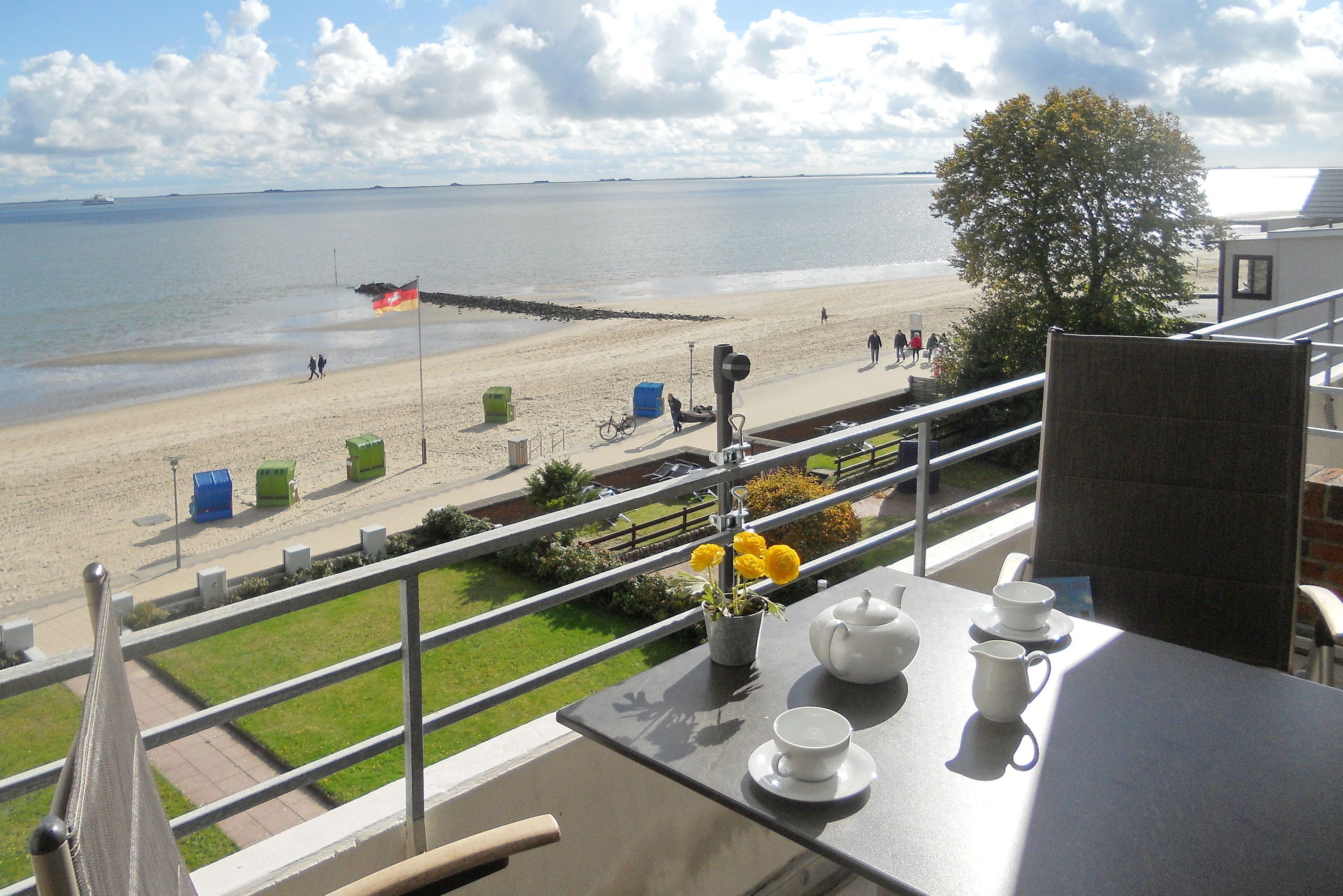 Die Föhrer Nordseebrise und die traumhafte Aussicht auf das Wattenmeer mit seinem wechselnden Schauspiel von Ebbe und Flut können Sie in unseren Wohnungen des Hauses Klaar Kiming am Sandwall in Wyk bereits nach dem Aufstehen vom Balkon aus genießen..