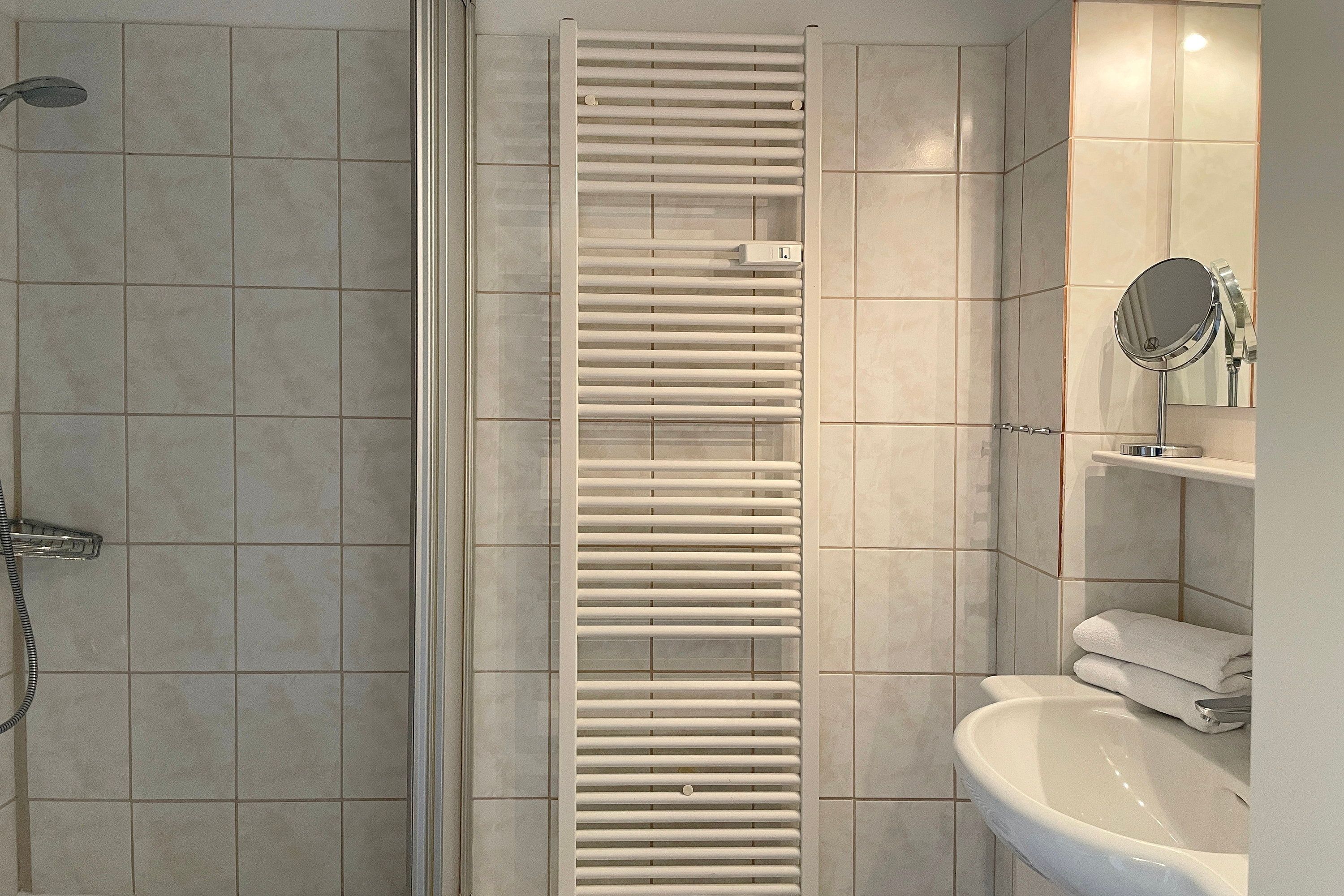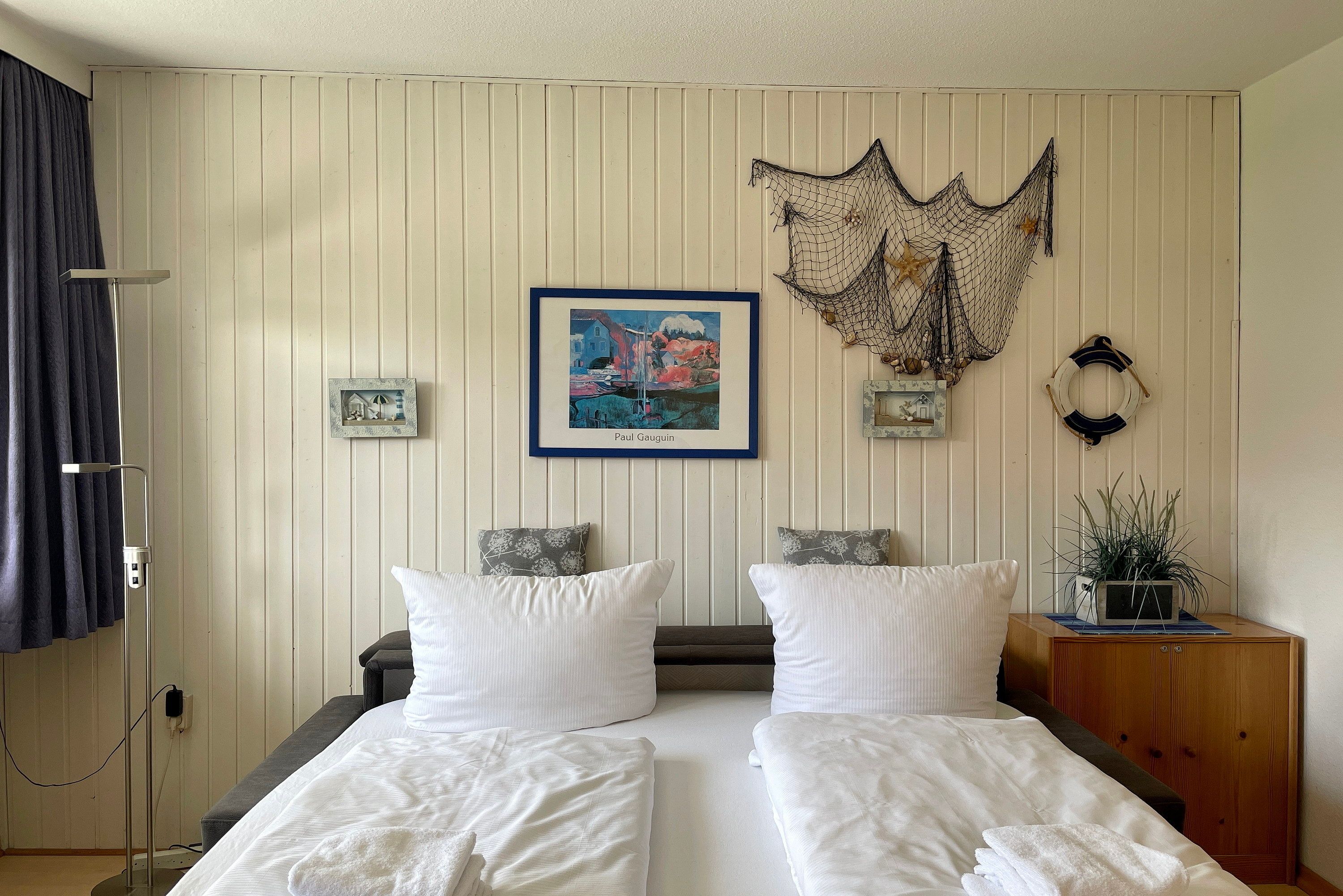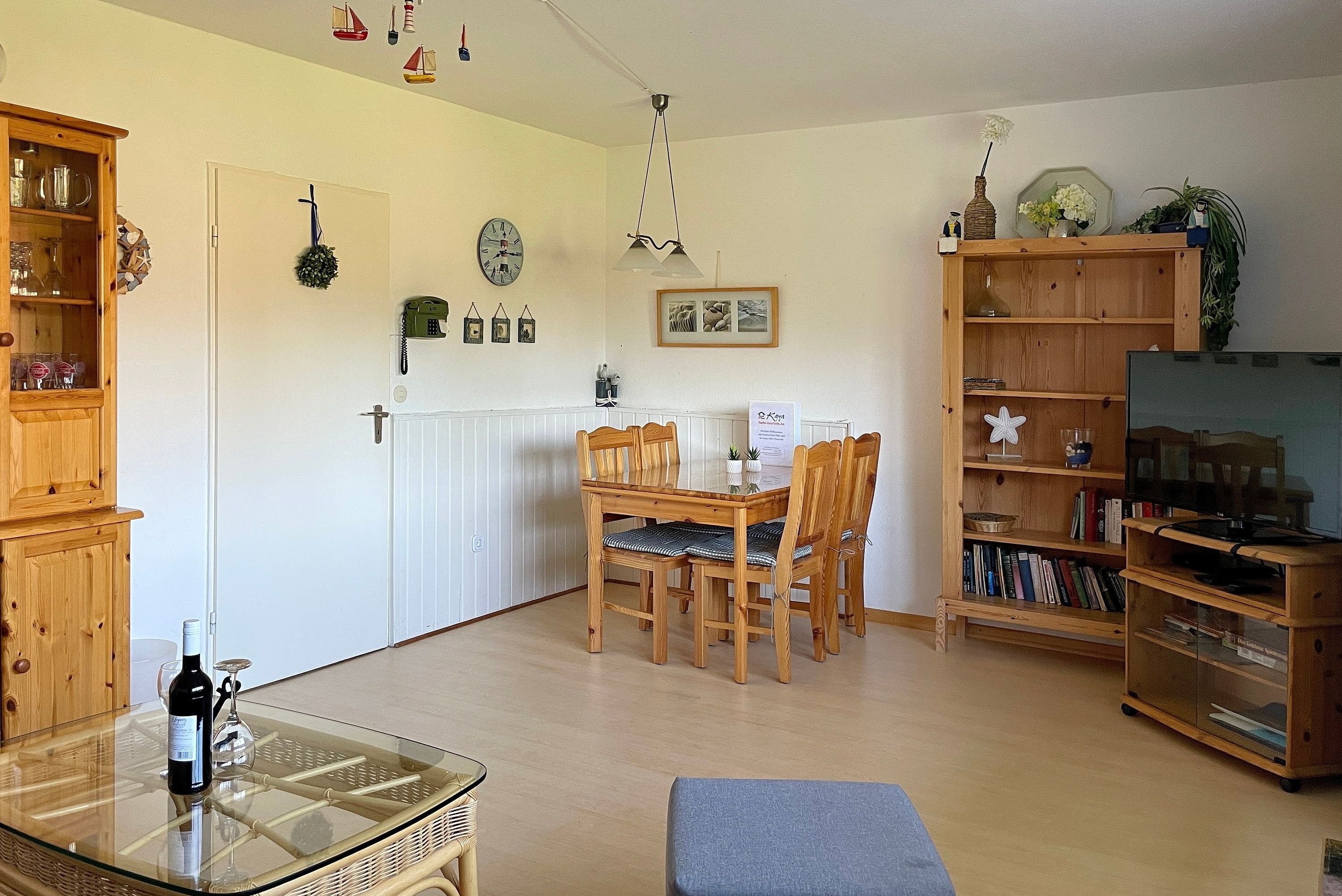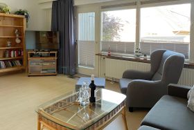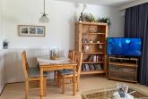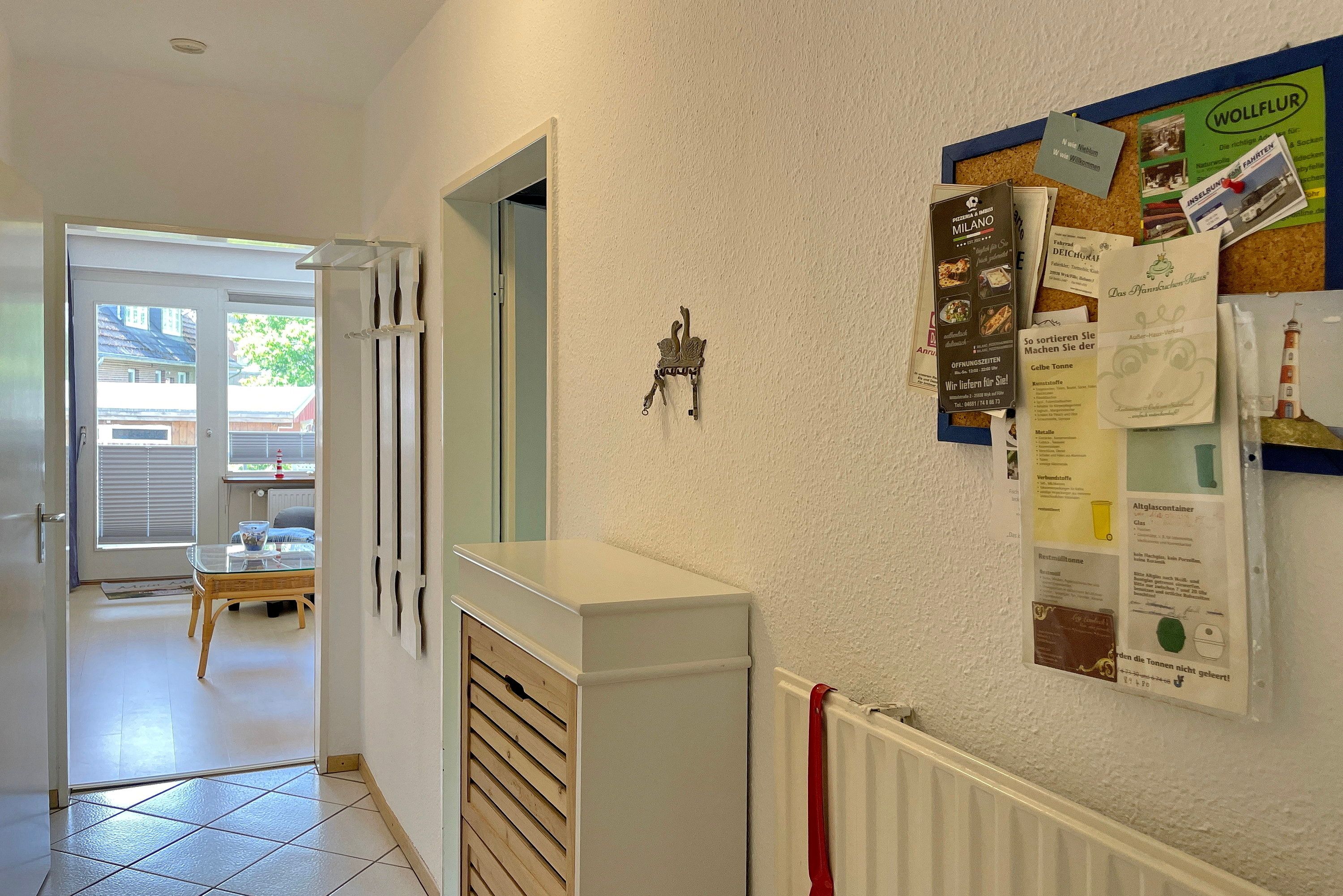 Am Rande von Wyk befindet sich das Matthias-Petersen- Haus mit 30 Wohneinheiten. Die Erdgeschosswohnung Nummer 1 lädt 2-4 Personen zu herrlichen Urlaubstagen ein. Abgehend vom Flur erreichen Sie alle Zimmer. Der helle Wohn- Essbereich mit WLAN, Flachbild-TV, DVD- und Video-Player und einer kleinen Auswahl an Büchern wirkt durch viele maritime Accessoires behaglich und gemütlich. Das neue Schlafsofa mit Bettkasten (1,70 x 190 cm) bietet eine Schlafgelegenheit für eine 3. und 4. Person. Vom Wohnzimmer gelangen Sie auf den überdachten, windgeschützten Balkon und können den Tag gemütlich ausklingen lassen. Das helle Bad mit Dusche und Handtuchheizkörper ist funktional ebenso wie die separate, offene Küche mit Geschirrspüler, Backofen, Kühlschrank mit Gefrierfach, Wasserkocher, Kaffeemaschine und Toaster. Das separate Schlafzimmer mit geräumigem Kleiderschrank, Doppelbett (180x200cm)und Fenster sorgt für erholsame Träume. Genießen Sie entspannte Urlaubstage! Das Haus selbst verfügt über einen gemeinschaftlich nutzbaren Parkplatz und eine große Liegewiese mit Grillhütte und Grill. Fahrradständer stehen zur Verfügung. Im Untergeschoss des Hauses, das Sie mit einem Aufzug oder per Treppe erreichen können, befinden sich neben der Waschküche mit Waschmaschine, Trockner (gegen Gebühr) und Wäscheleine auch ein Angebot an Beschäftigungsmöglichkeiten. So können Sie kostenfrei ein Workout im kleinen Fitnessraum machen. Für Entspannung sorgt die gemeinschaftliche Sauna ( gegen Gebühr), bei der Sie Ihre Wunschzeit in einer Liste reservieren können. Der Bäcker und die Bushaltestelle befinden sich in fußläufiger Entfernung und der Südstrand lockt mit schönen Aussichten.