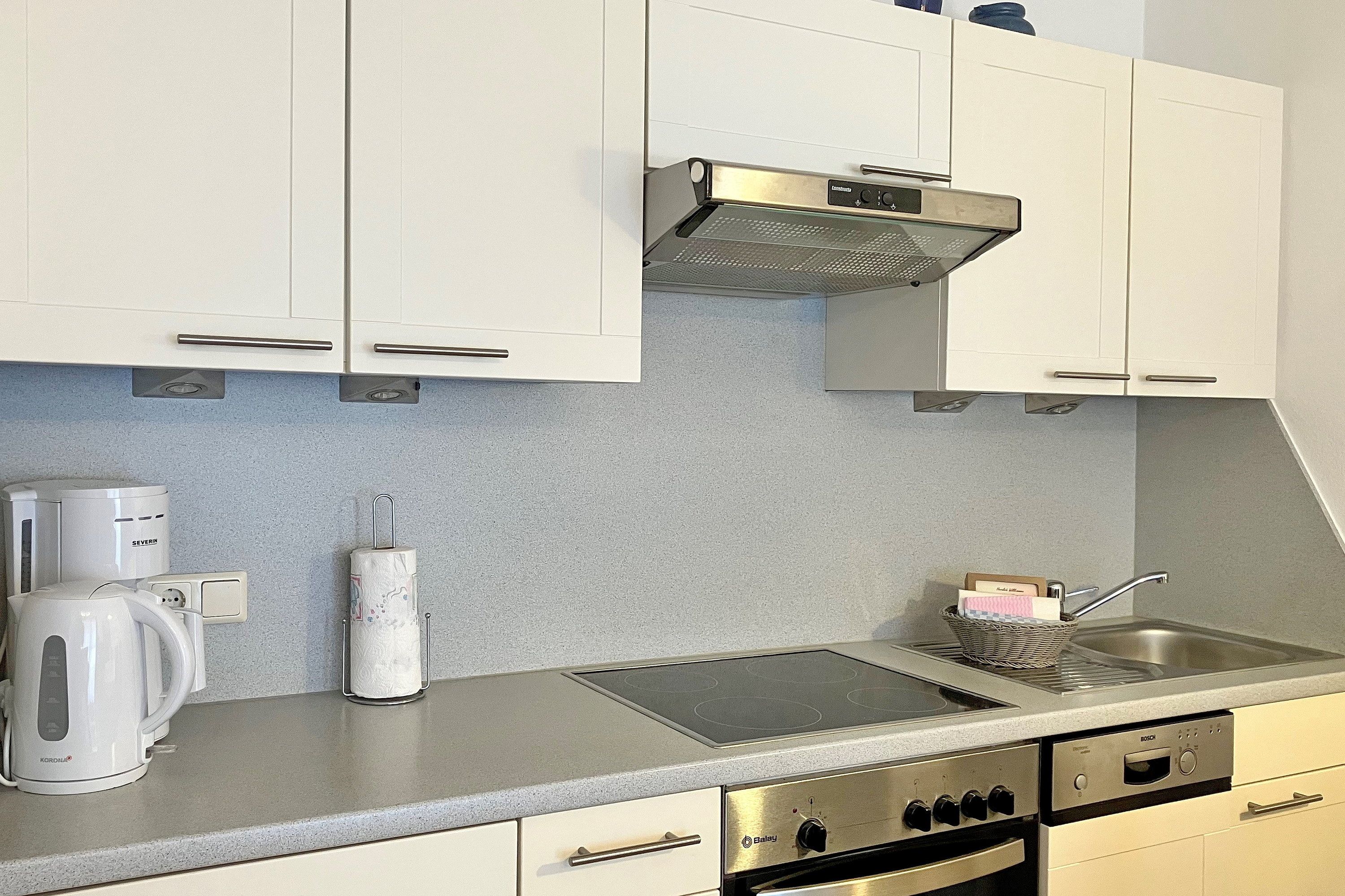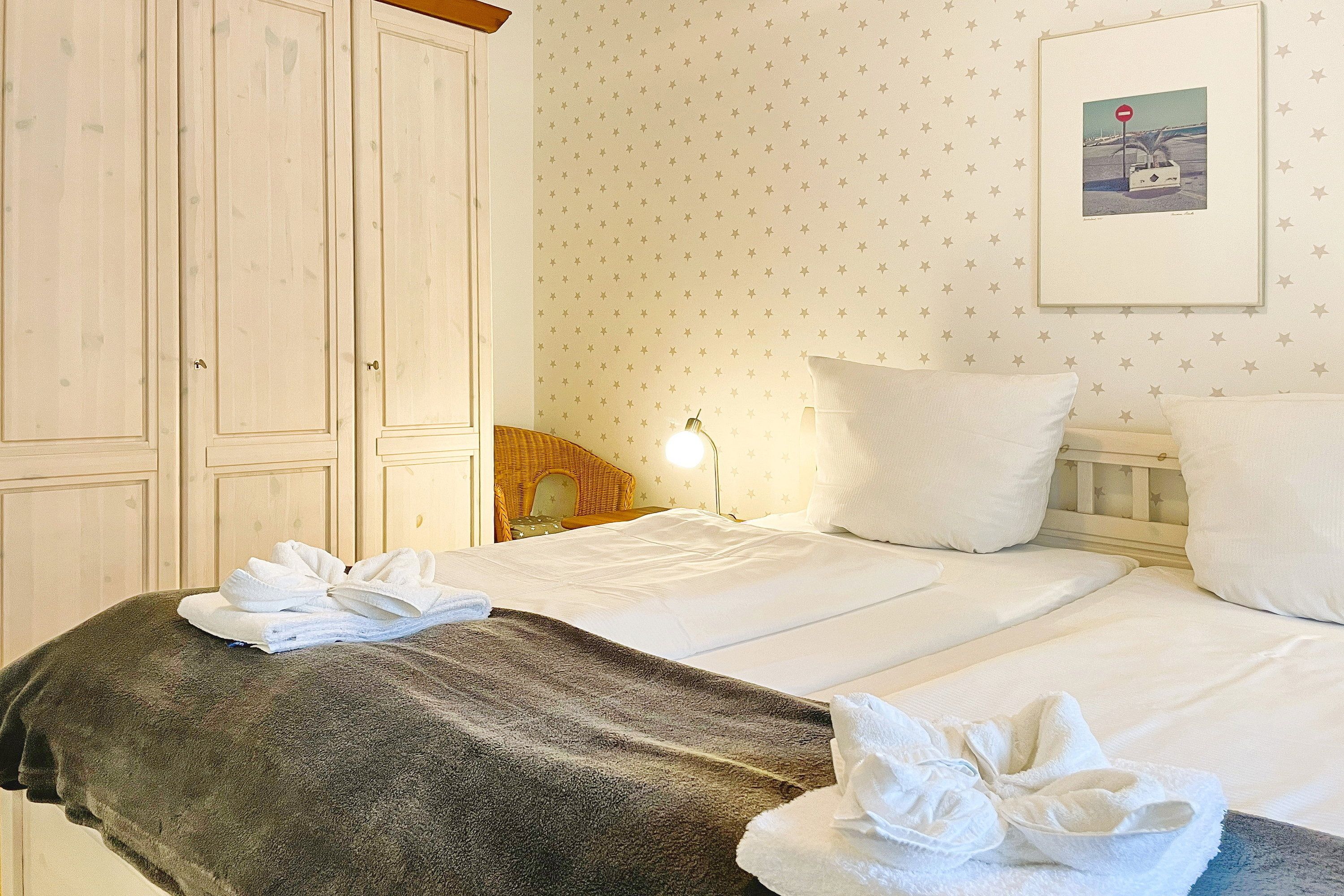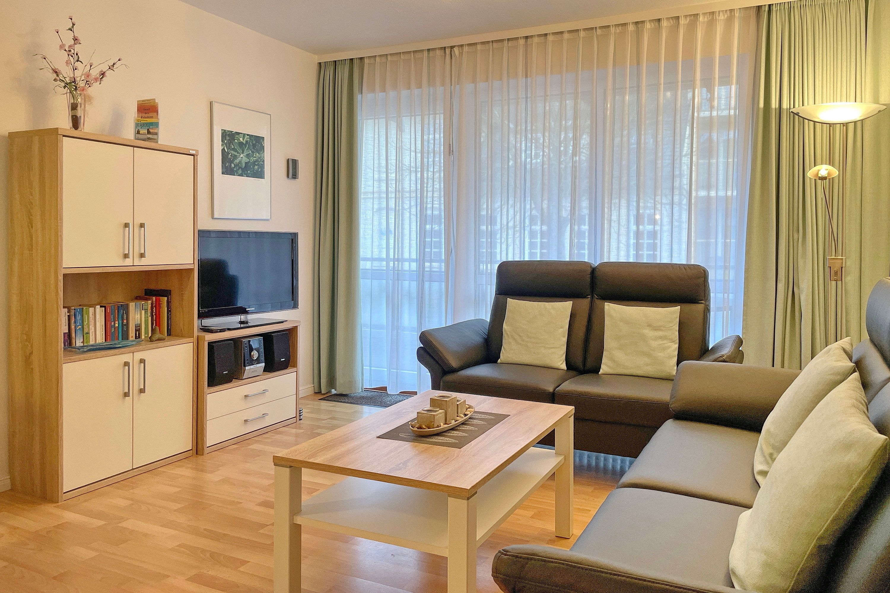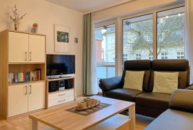 Die Ferienhausanlage Seeadler befindet sich in der verkehrsberuhigten Zone am Sandwall nur wenige Meter von Cafés, Restaurants, den kleinen Föhrer Geschäften und natürlich dem Strand und dem Meer entfernt. Unsere Wohnung Seeadler 04 ist mit seiner zentralen Lage und seiner guten Aufteilung eine beliebte Ferienwohnung, die wir Ihnen gerne empfehlen. Im ersten Obergeschoss gelegen, eignet sich die Ferienwohnung mit ca. 60 qm ideal für 2 bis 4 Personen. Das geräumige Wohnzimmer mit bequemer Sitzgarnitur, WLAN, Smart-TV, Spiele- und Bücherauswahl, Stereoanlage und hochwertiger Essecke ist hell und freundlich. Die Möbel sind harmonisch aufeinander abgestimmt und Sie können sich sogleich wohlfühlen. Die integrierte Einbauküche ist mit Geschirrspüler, Kühlschrank mit Gefrierfach, Ceranfeldherd mit Backofen, Dunstabzugshaube und Kaffeemaschine, Eierkocher sowie Wasserkocher gut ausgestattet und lädt zum Kochen ein. Ihren Süd-Ostbalkon mit Balkonmöbeln erreichen Sie direkt vom Wohnzimmer. Des Weiteren verfügt die Wohnung über ein hellgefliestes Bad mit Fenster und Dusche mit niedrigem Einstieg und über zwei Schlafräume. Das Elternschlafzimmer verfügt über ein Doppelbett und einen dreitürigen Kleiderschrank. Kinder werden sich im liebevoll gestaltenten Kinderzimmer mit zwei Einzelbetten, CD-Player und einer Bücherauswahl sicher sehr wohl fühlen. Im großzügigen Flurbereich steht ein weiterer Schrank zur Nutzung bereit sowie eine hübsche Garderobe.