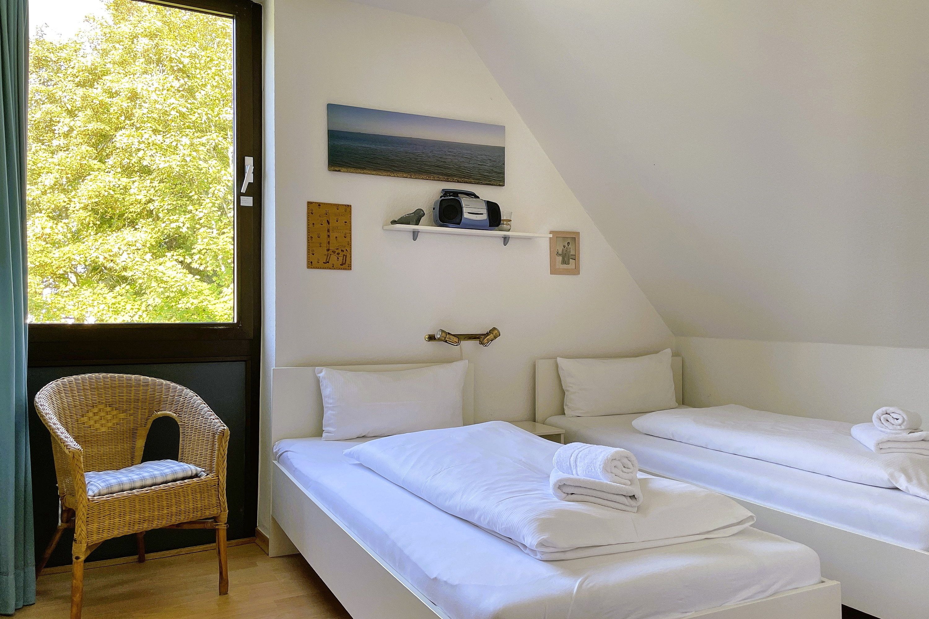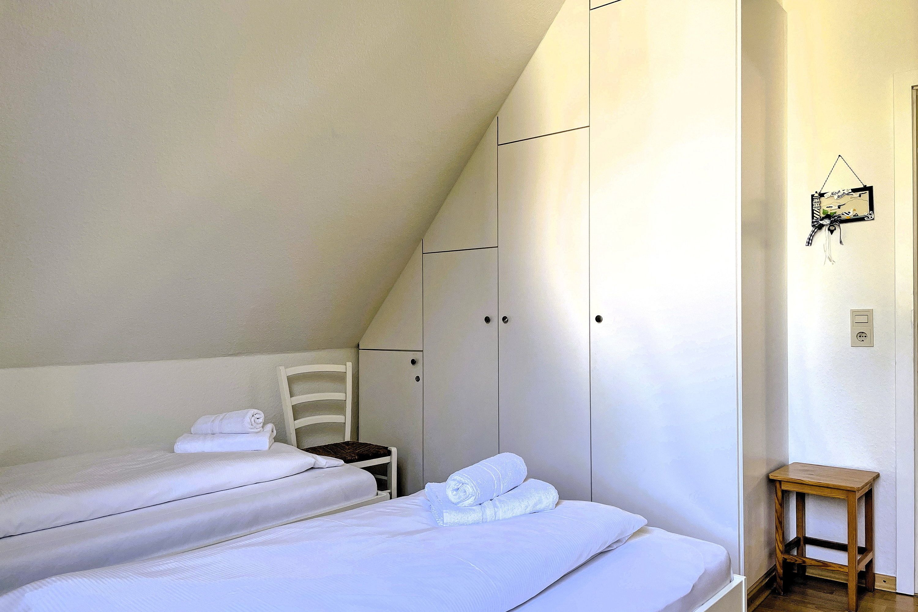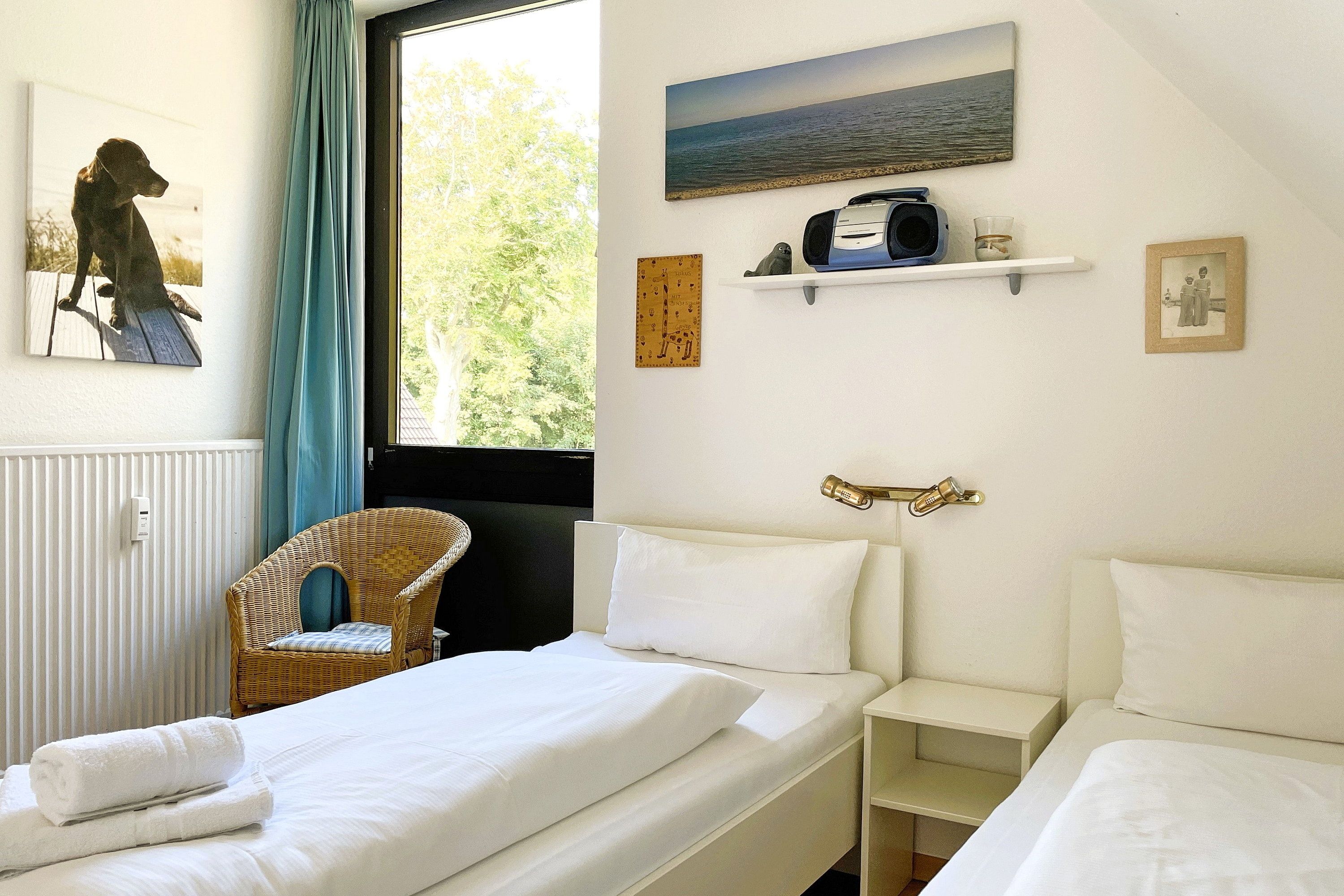 In der Gmelinstraße direkt am Südstrand befindet sich die gepflegte Ferienwohnungsanlage Südstranddomizil nur wenige Schritte vom Nordsee-Kurpark entfernt. Unsere Wohnung Südstranddomizil (60 qm) liegt im ersten Obergeschoss des Hauses und eignet sich für bis zu 4 Personen. Vom Flur aus gelangen Sie in das erste Schlafzimmer mit zwei Einzelbetten und Kleiderschrank, das hellgeflieste Bad mit Fenster und Badewanne sowie in das Wohnzimmer. Der lichtdurchflutete Wohnbereich mit offener Balkenlage, gemütlicher Essecke und einladender Couchgarnitur mit Radio, WLAN und Flachbild-TV lädt zum Verweilen ein. Im Wohnzimmer integriert befindet sich auch die gut ausgestattete Küchenzeile mit Ceranfeldherd und Backofen, Mikrowelle, Kühlschrank, Geschirrspüler, Kaffeemaschine und Wasserkocher. Von hier gelangen Sie auf den Balkon, der zum Sonnenbaden einlädt. Über dem Wohnbereich befindet sich eine offene Schlafgalerie mit einem Doppelbett. Wählen Sie selbst, ob Sie den Vorhang vor dem Gelände zuziehen möchten (siehe Fotos). Gerade bei jungen Familien ist die Anlage sehr beliebt, da die Häuser nachhinten versetzt zur Straße angeordnet sind und sich zwischen der Wohnanlage und der Straße noch der Parkplatz erstreckt. Der gemeinschaftlich nutzbare Außenbereich bietet die Möglichkeit Fahrräder abzustellen und Kinder können sich auf der Wiese unbeschwert austoben. Ein Bäcker, Restaurants wie die Schlemmerkate, der Chinese oder das beliebte Pfannkuchenhaus, ein Lebensmittelladen, die Bushaltestelle und natürlich der schöne Südstrand und das Meer sind fußläufig erreichbar, wobei Sie doch ein wenig Abseits des trubeligen Zentrums Ihren Urlaub genießen können. Waschmaschine und Trockner stehen im Keller gegen eine geringe Gebühr zur gemeinschaftlichen Nutzung zur Verfügung.