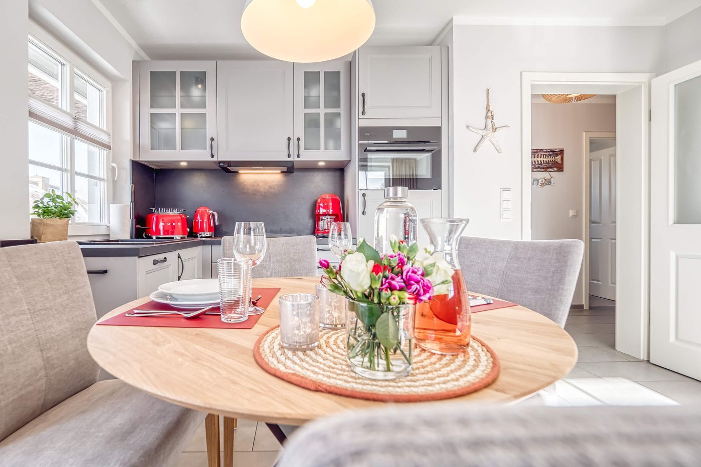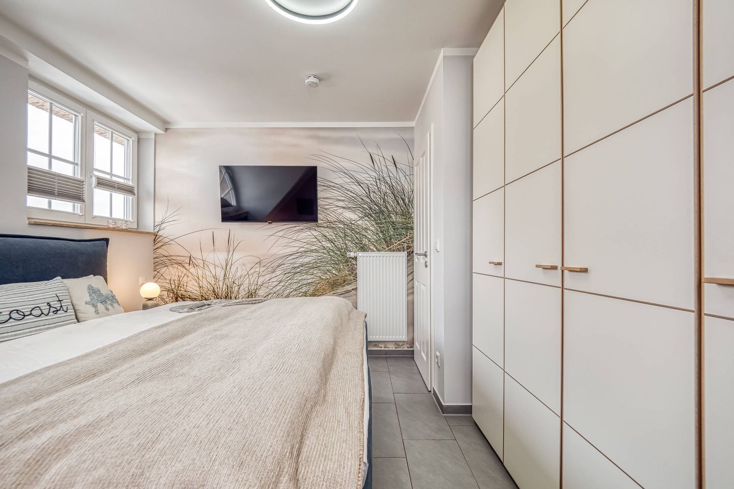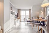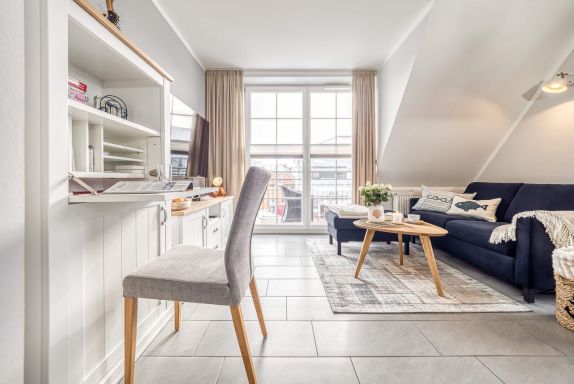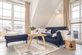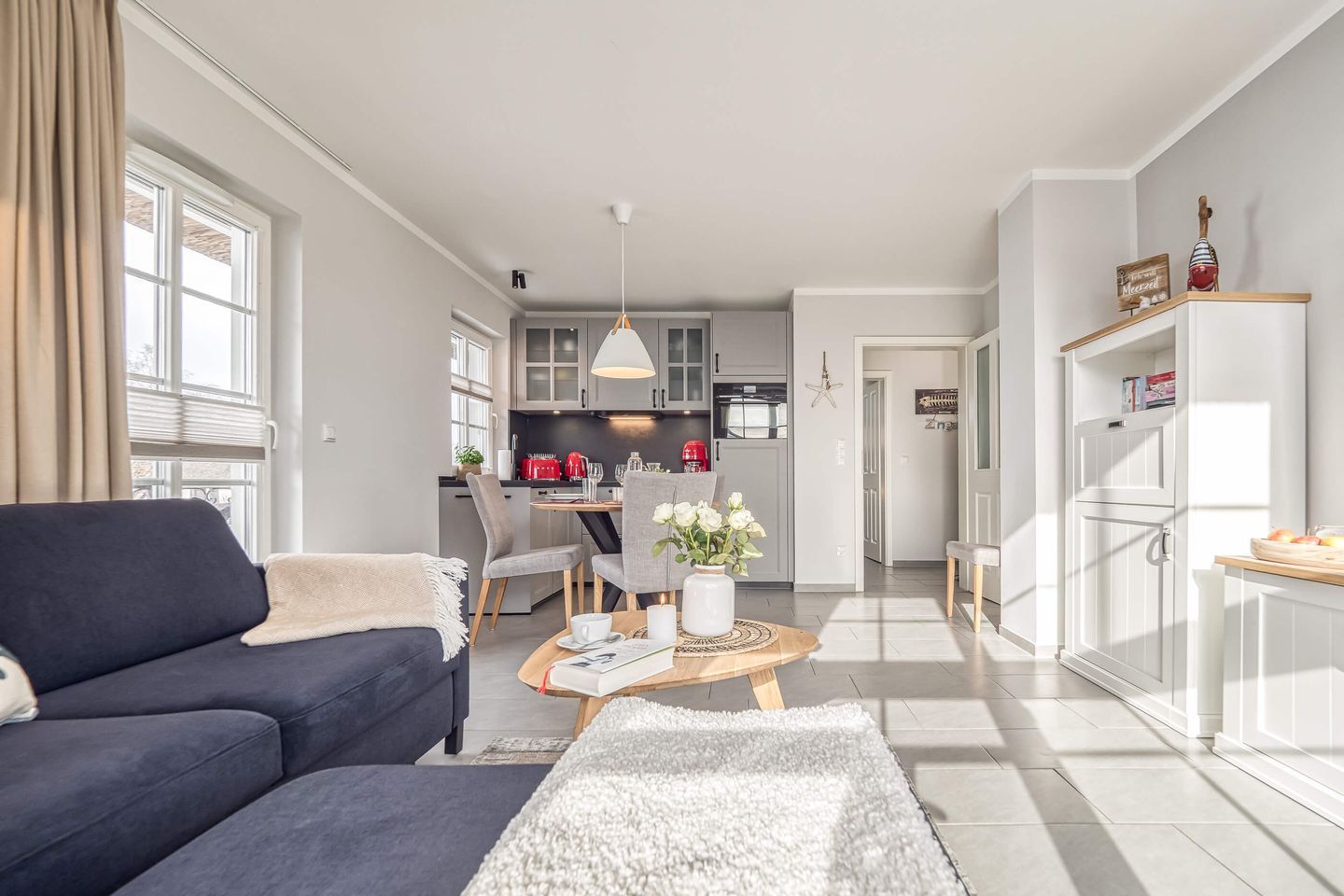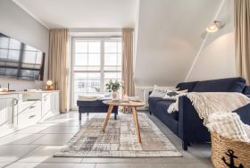 Die neu eingerichtete 50 m² Wohnung präsentiert sich im modernen maritimen Stil. Das lichtdurchflutete, helle Wohnzimmer lädt mit seiner bequemen Couch nebst großem Hocker zum Entspannen ein. Ein großer 55-Zoll-Fernseher, ein stilvolles Sideboard sowie ein praktischer Sekretär fügen sich harmonisch ein und schaffen eine warme, einladende Atmosphäre. Hochwertige Materialien und ein durchdachtes Design sorgen für ein sofortiges Wohlgefühl.
