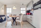 Der Essbereich bietet einen großen Esstisch mit vier komfortablen Stühlen. Die angrenzende Küche ist mit hochwertigen Küchengeräten ausgestattet und lässt keine Wünsche offen - ideal für gemütliche Kochabende.