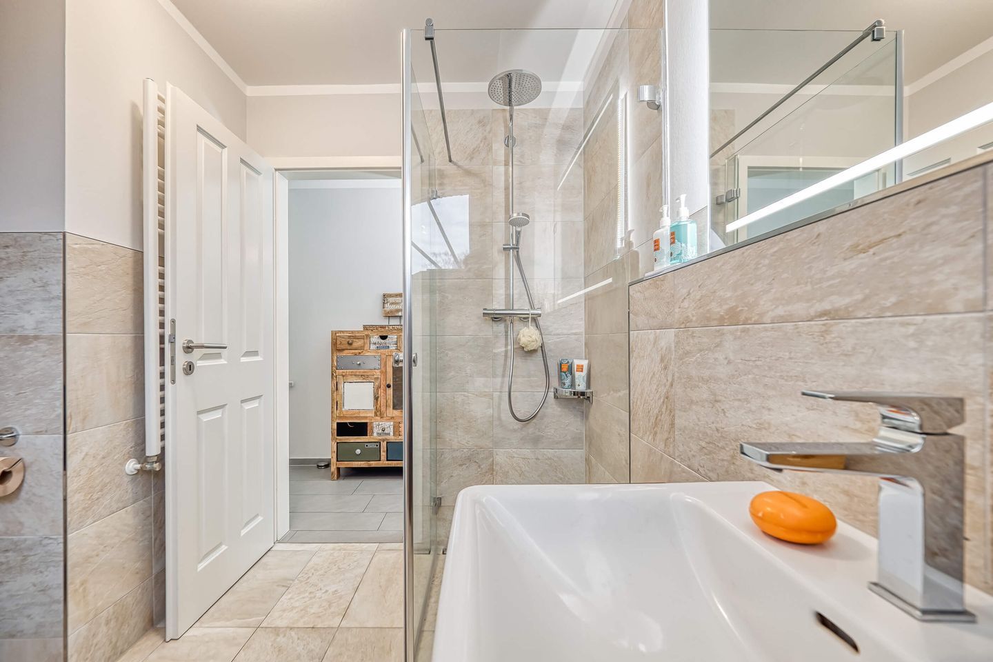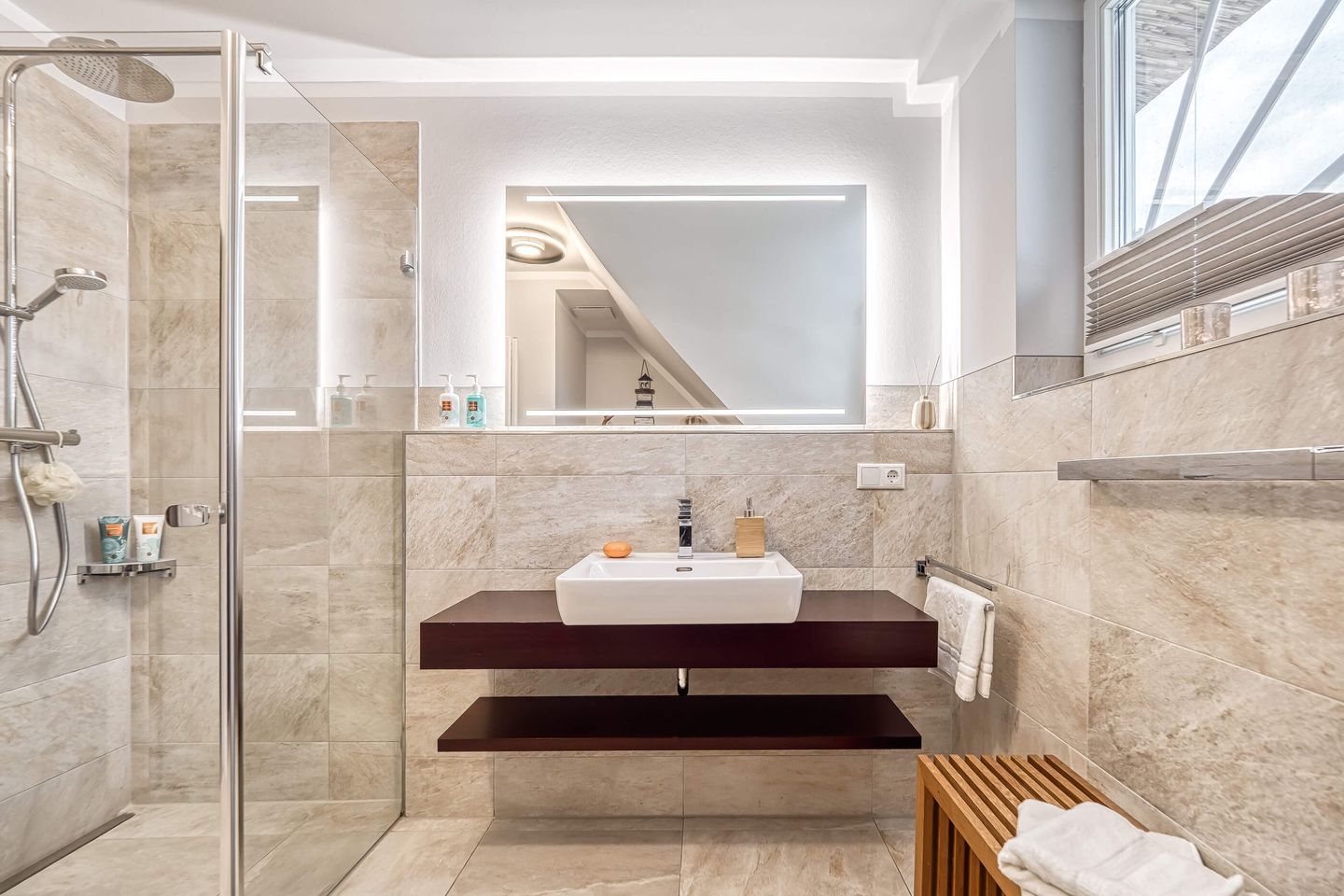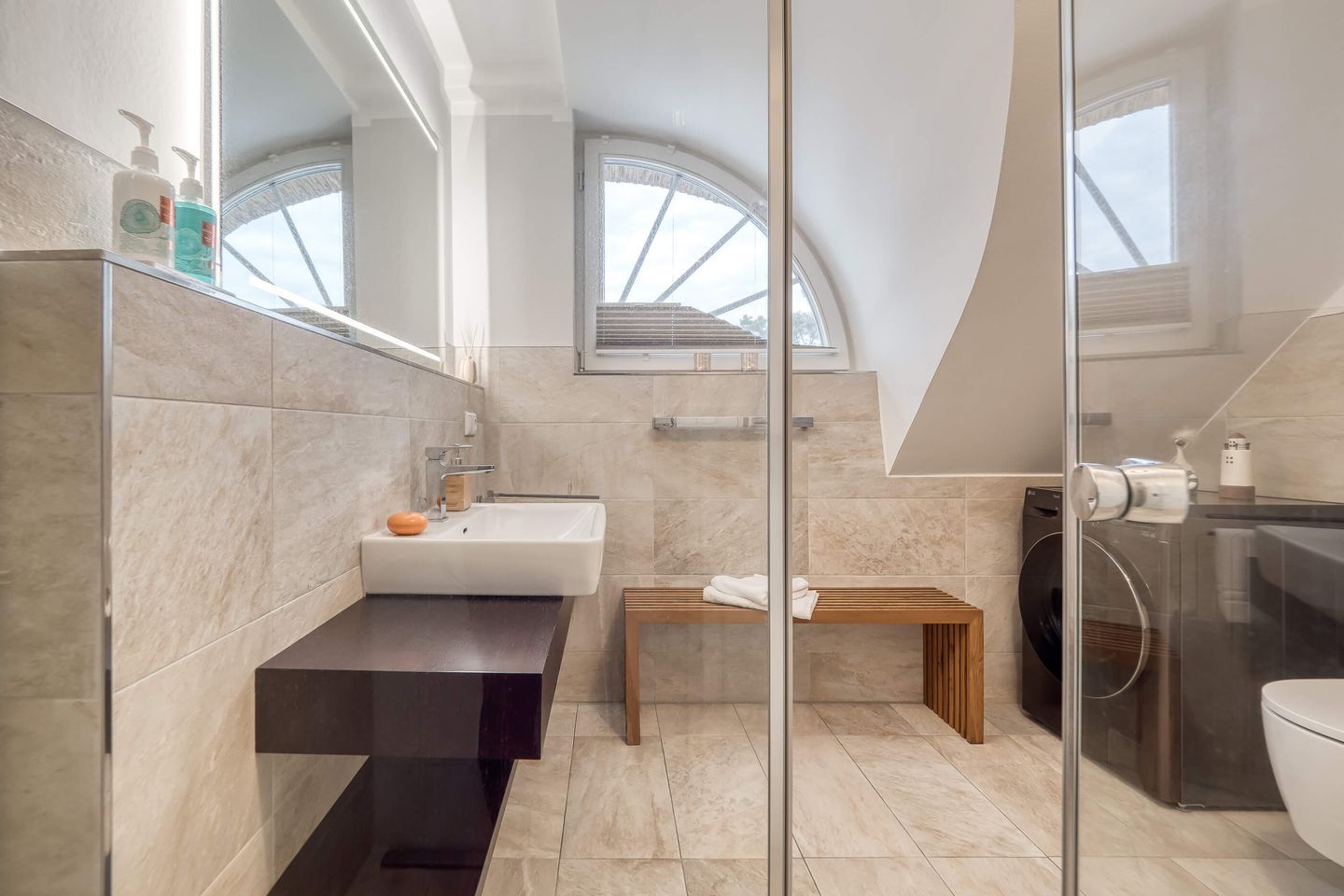 Das Badezimmer überzeugt mit einer großen Regenwasserdusche. Die integrierte Waschmaschine macht den Aufenthalt unkompliziert, besonders nach langen Strandtagen.
