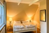 Zwei Schlafzimmer mit komfortablen Doppelbetten, eines davon ausgestattet mit TV. Der Zugang zur Schlafgalerie im Dachgeschoss erfolgt über eine innenliegende Treppe innerhalb eines der Schlafzimmer.
