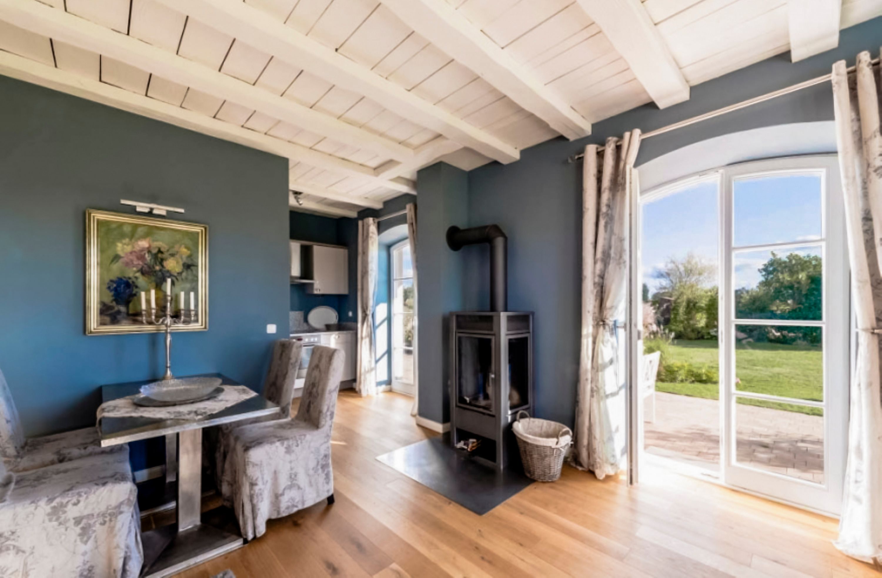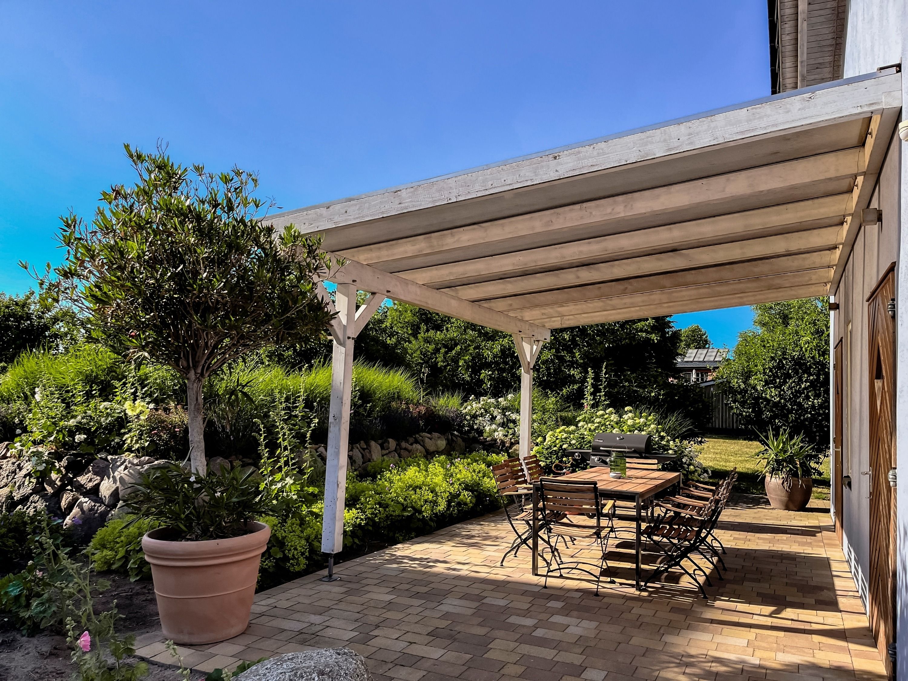 Vom Wohnbereich gelangen Sie auf eine private Terrasse. Hier können Sie den Blick über das gepflegte Anwesen und die angrenzenden Wiesen und Felder schweifen lassen – der perfekte Ort für Momente der Ruhe und Erholung.