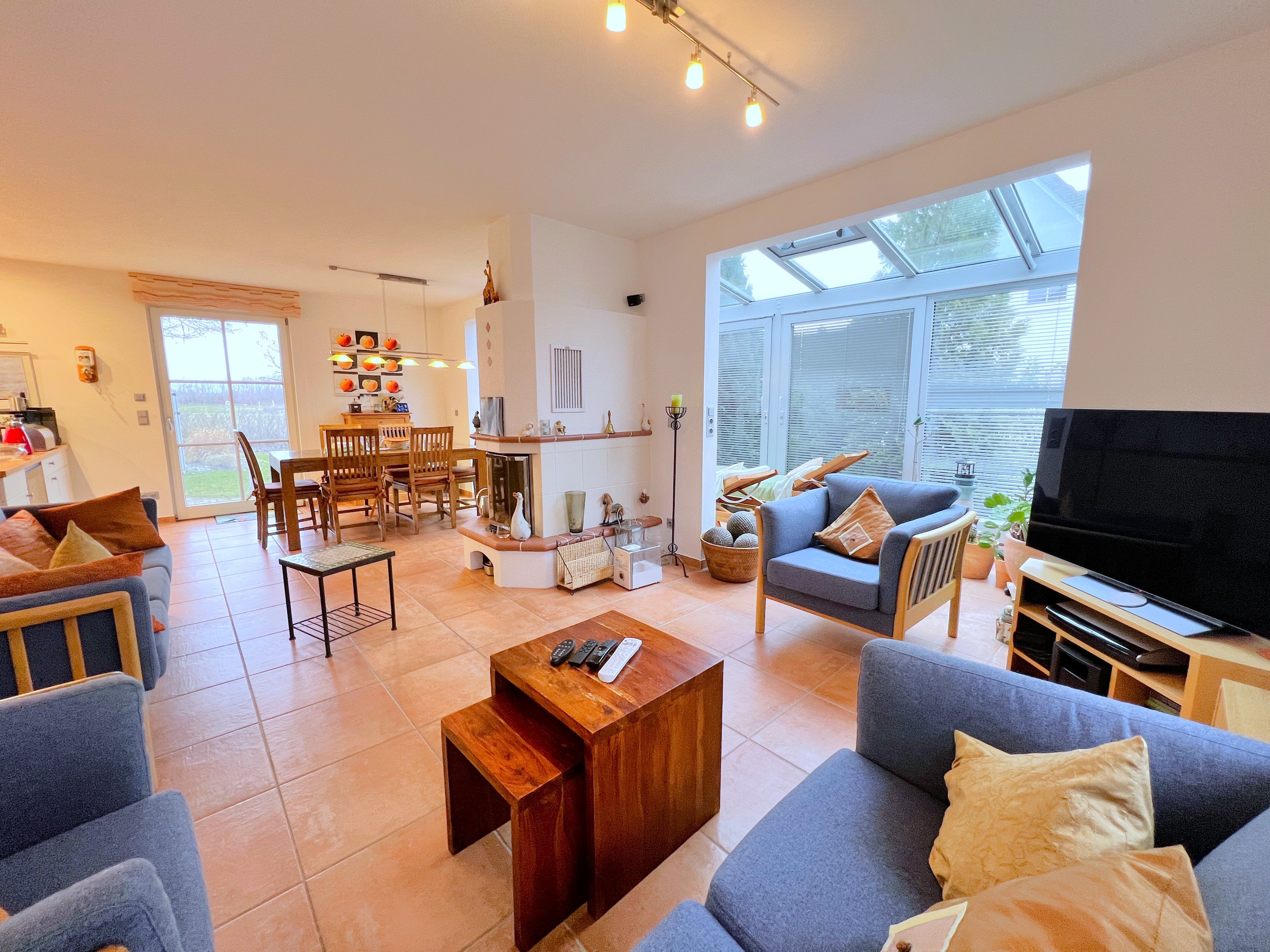 Im Erdgeschoss erwartet Sie ein offen gestalteter Wohn- und Küchenbereich mit viel Platz zum gemeinsamen Kochen und Entspannen. Ein Gaskamin sorgt für eine angenehme Atmosphäre. Ergänzt wird das Raumangebot durch einen ca. 15 m² großen Wintergarten, einen Fitnessraum sowie eine kleine Büroecke. Zusätzlich steht im Erdgeschoss ein Gäste-WC mit Waschbecken zur Verfügung.