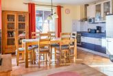 Vom Wohn- und Esszimmer aus gelangen Sie direkt auf die große, möblierte Terrasse mit angrenzendem Grundstück – perfekt für gemütliche Stunden im Freien.