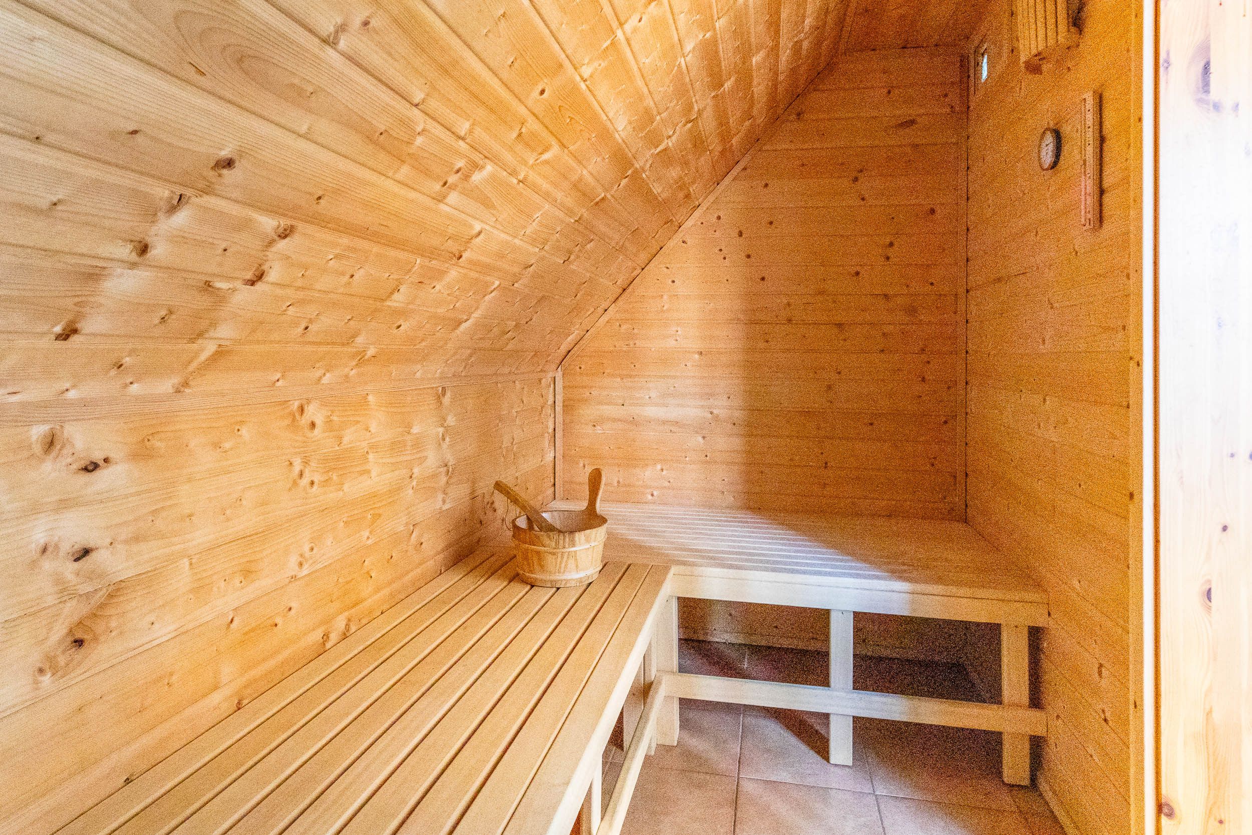 Das Obergeschoss verfügt über ein komfortables Schlafzimmer mit großem Kleiderschrank. Außerdem befindet sich hier das großzügige Duschbad, ausgestattet mit Dusche, Waschbecken, WC, Föhn, Waschmaschine und einer eigenen Sauna im Haus – ideal für entspannte Wellnessmomente. Auch hier sorgt eine Fußbodenheizung für wohlige Wärme. Ein weiteres Schlafzimmer liegt im Spitzboden und ist mit zwei Einzelbetten sowie einem Kinderbett ausgestattet – ein gemütlicher Rückzugsort, besonders für die kleinen Gäste.