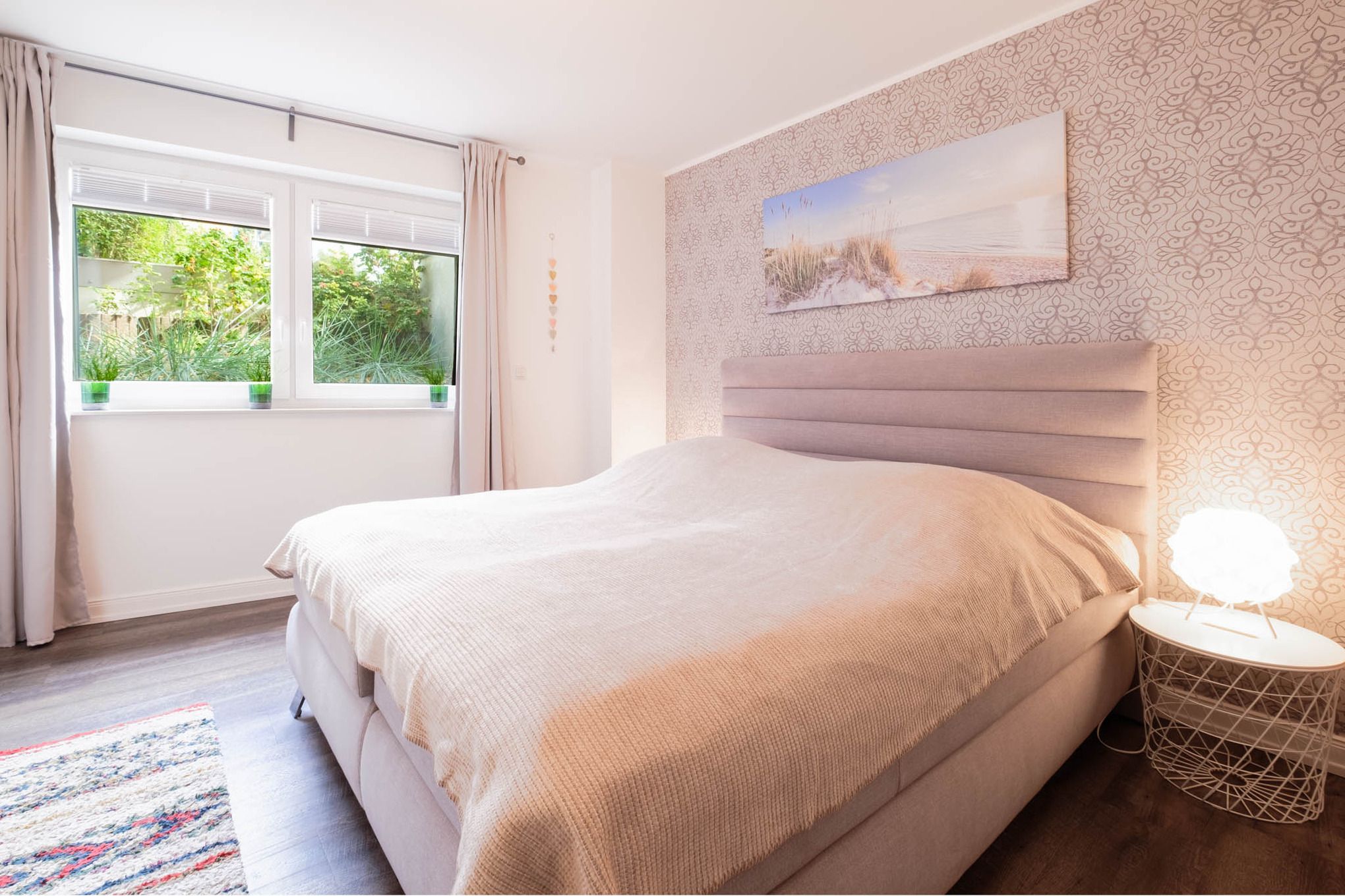 Im Untergeschoss dieses Ostseedomizils finden Sie die zwei Schlafzimmer mit jeweils einem Boxspringbett (1,80m x 2,00m), Schrank sowie zusätzlichem TV vor.