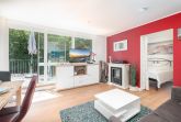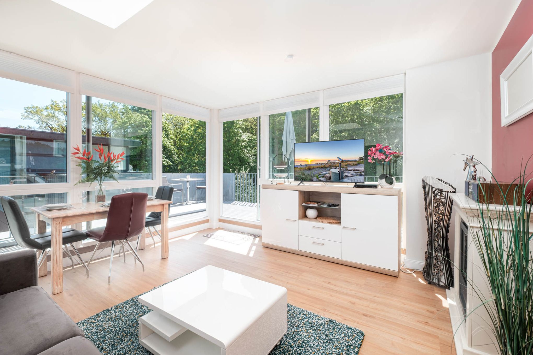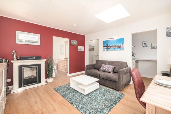 In der 3. Etage erwartet Sie dieses traumhafte Penthouse Traumsonne für 3 Personen mit Dachterrasse und seitlichem Meerblick. Die Timmendorfer Strand Ferienwohnung ist sehr modern und liebevoll ausgestattet. Das Wohnzimmer ist mit einer bequemen und komfortablen Schlafcouch, Flatscreen-TV, Stereo-Anlage, Elektro-Kamin und einem großzügigen Essbereich eingerichtet. Die angrenzende Küche verfügt über Ceranfeld, Backofen und Wasserkocher - einen Geschirrspüler gibt es nicht.