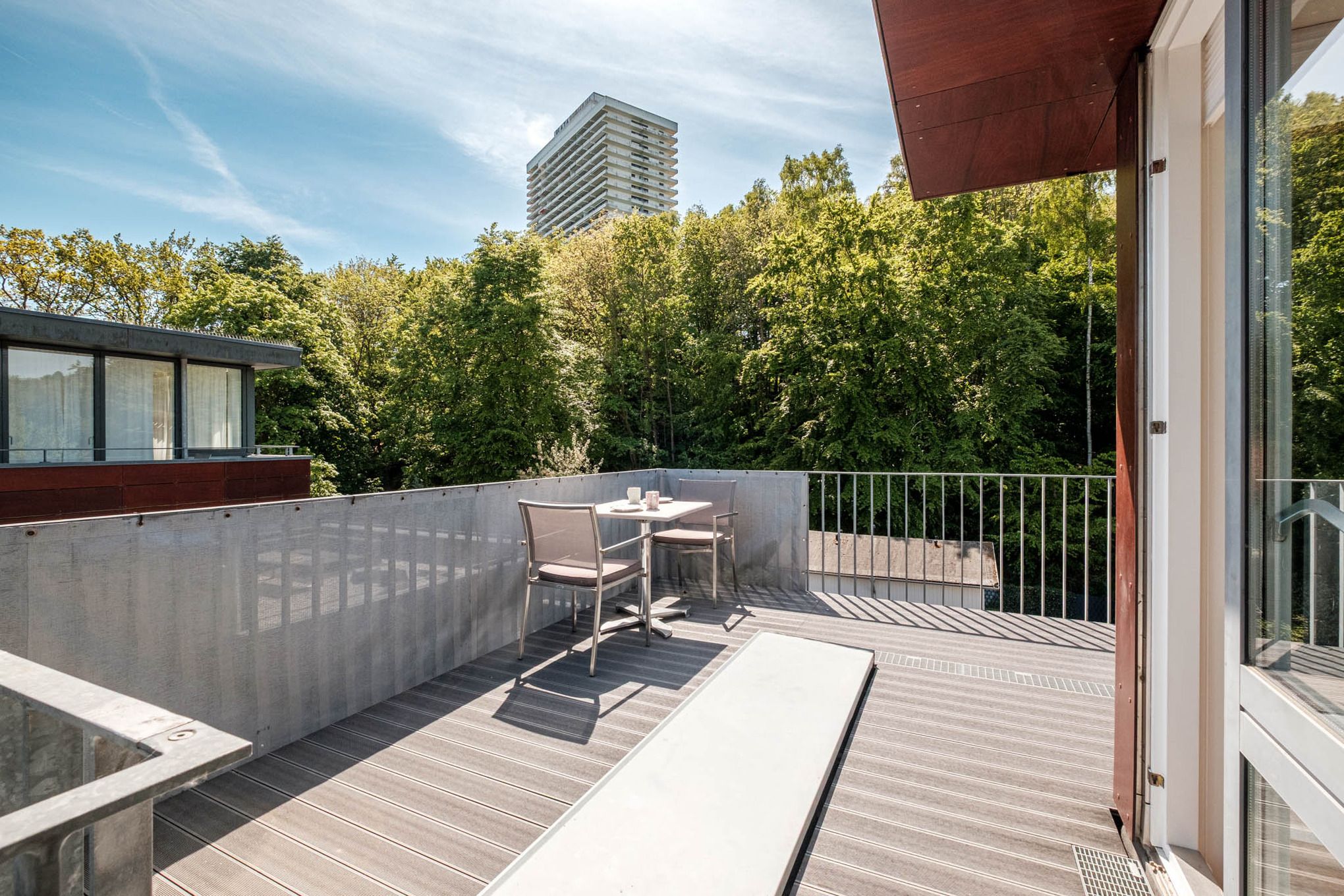 Die umlaufende Dachterrasse mit Sitzbereich und dem seitlichen Meerblick rundet dieses wunderschöne Urlaubsdomizil in Timmendorfer Strand an der Ostsee ab.