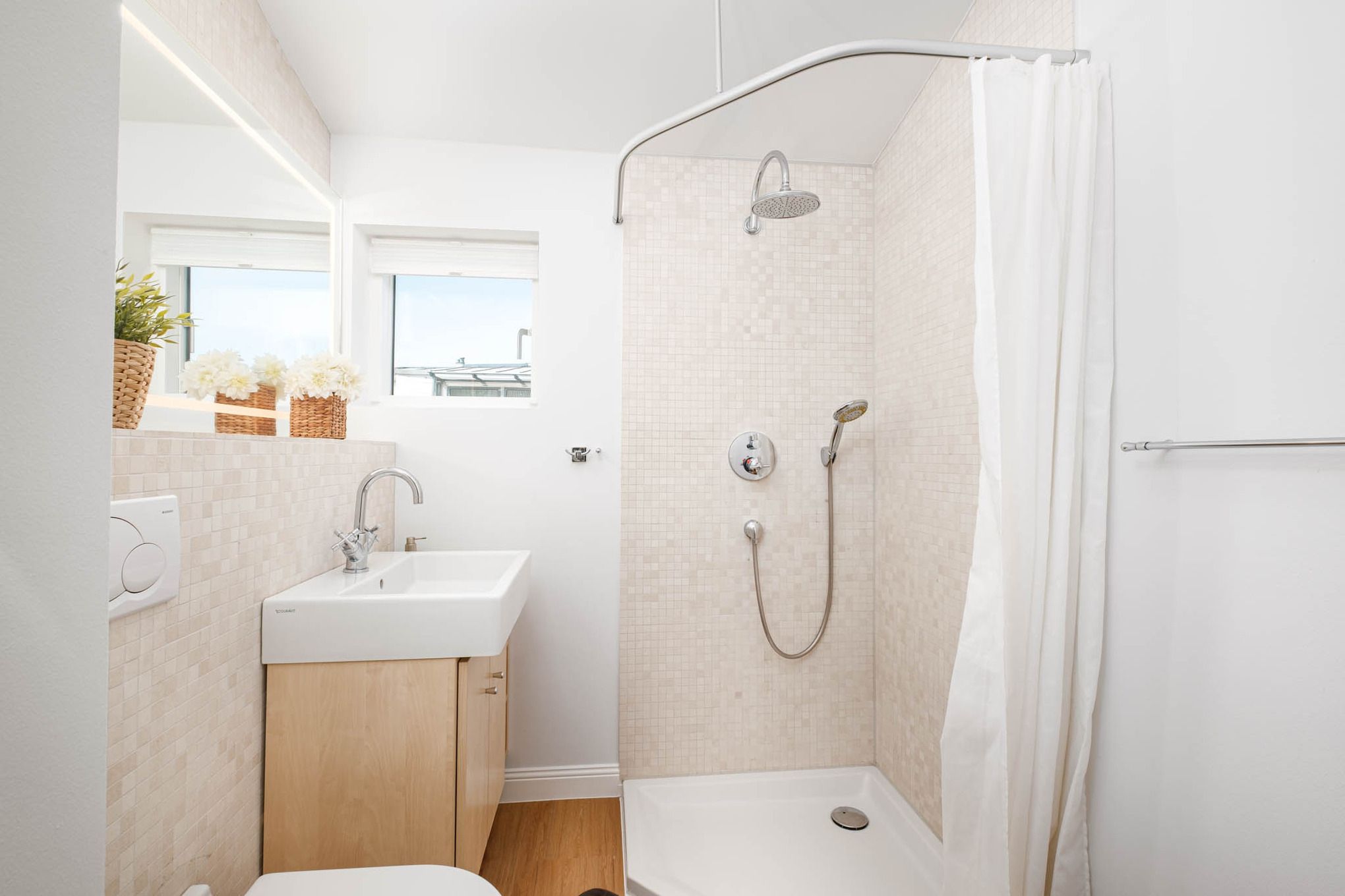 Das Schlafzimmer verfügt über ein großes Doppelbett (160x200cm) mit Allergiker Matratzen. Zwischen Wohn- und Schlafzimmer befindet sich nur ein Vorhang, keine Tür. Um Ihnen einen erholsamen Schlaf zu garantieren, lassen sich die Schlafräume der Ferienwohnung verdunkeln. Das Badezimmer erwartet Sie mit einem modernen Waschtisch und einer Dusche.