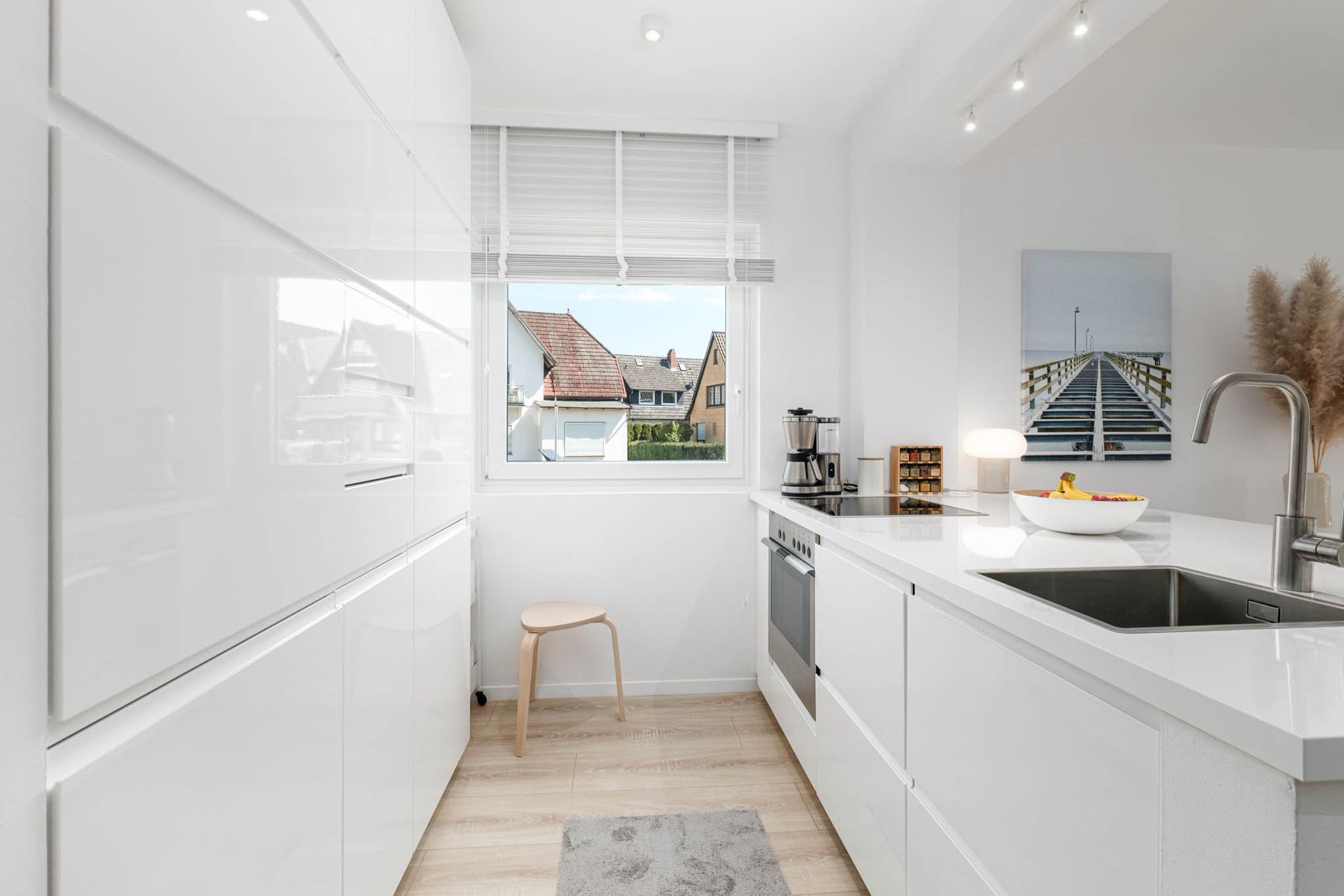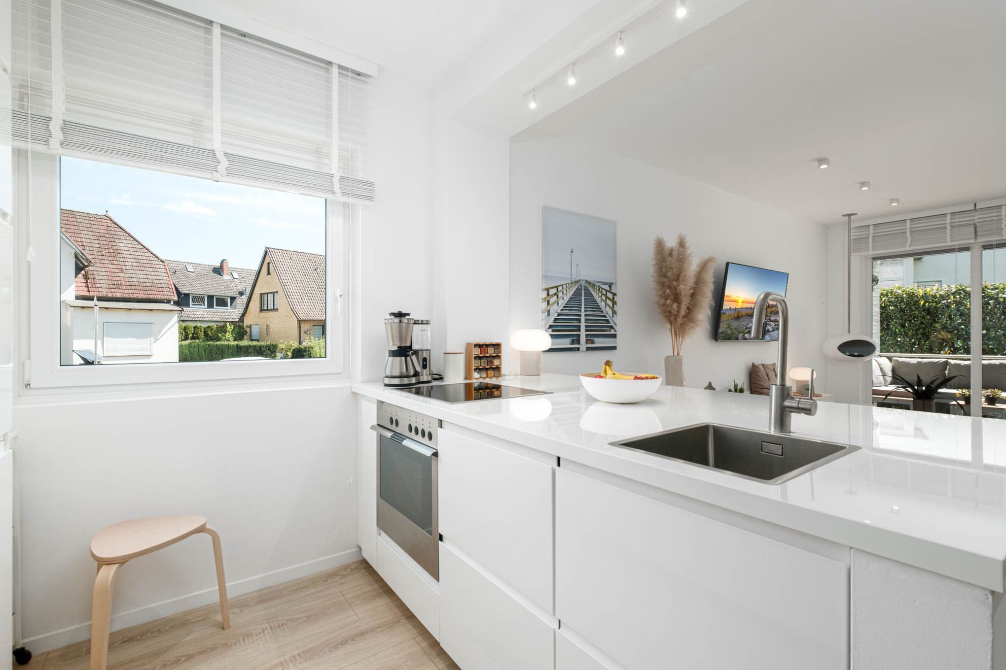 In der umfassend ausgestatteten offenen Wohnküche stehen Ihnen unter anderem ein Cerankochfeld, ein Backofen, eine Mikrowelle, eine Geschirrspülmaschine sowie ein Kühlschrank mit Gefrierfach zur Verfügung. Im hochwertig eingerichteten Wohnzimmer steht Ihnen neben einem komfortablen Sofa ein großer Fernseher mit Magenta TV, sowie Zugang zu Disney + und Netflix zur Verfügung.