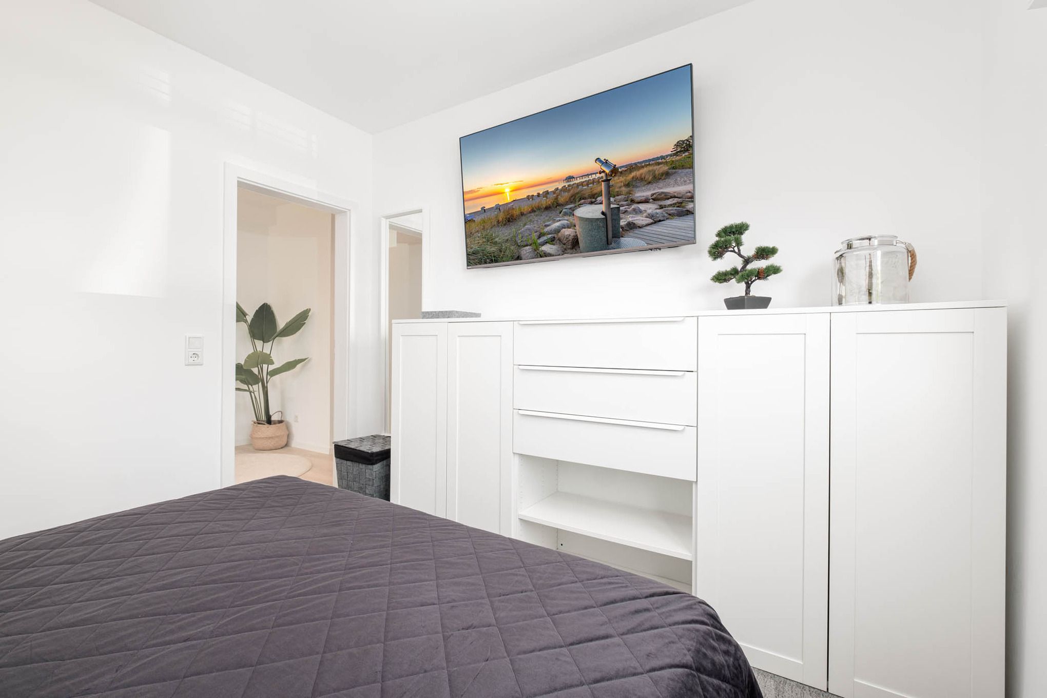 Es steht Ihnen ein separates Schlafzimmer mit einem Boxspringbett (180x200 cm) mit durchgehender Matratze zur Verfügung. Ein Highboard mit integrierter Kleiderstange sorgt für ausreichend Stauraum für Ihre Urlaubsgarderobe. Hier finden Sie den zweiten Fernseher, bei dem Ihnen ebenfalls Magenta TV, sowie Disney + und Netflix zur Verfügung steht.
