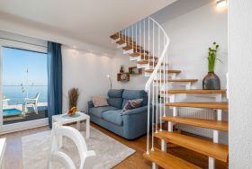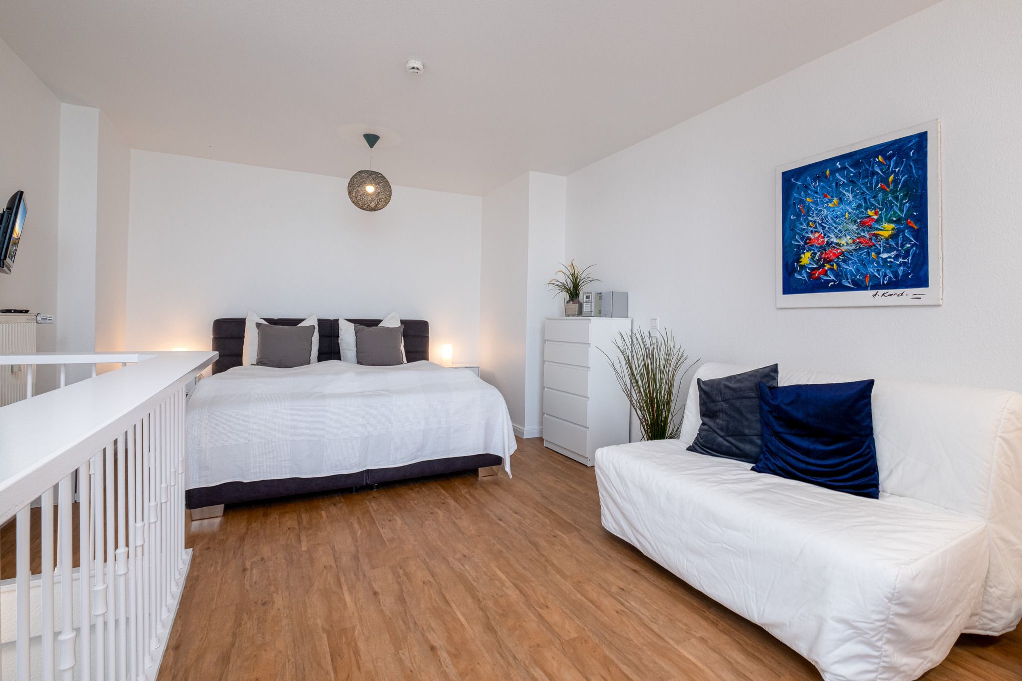 Über die Treppe im Wohnzimmer erreichen Sie den offenen Maisonettebereich mit dem Schlafzimmer. Das Schlafzimmer verfügt über ein komfortables Boxspringbett mit direktem Meerblick (180x200cm und durchgängige Liegefläche durch Topper) sowie eine bequeme Schlafcouch (140x190cm). Hier steht Ihnen darüber hinaus ein zweiter TV zur Verfügung.