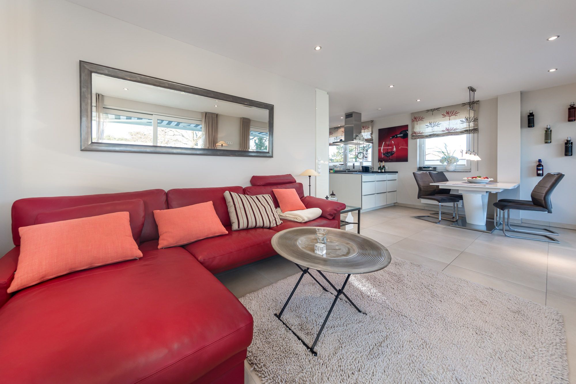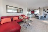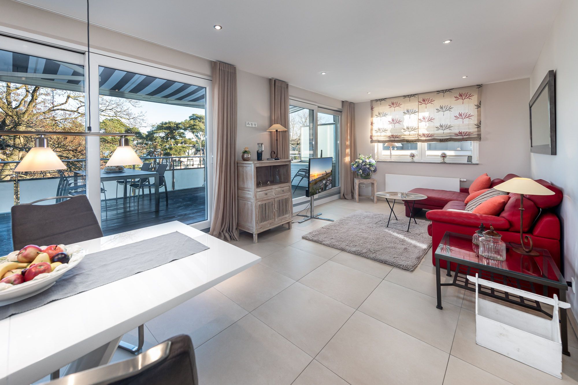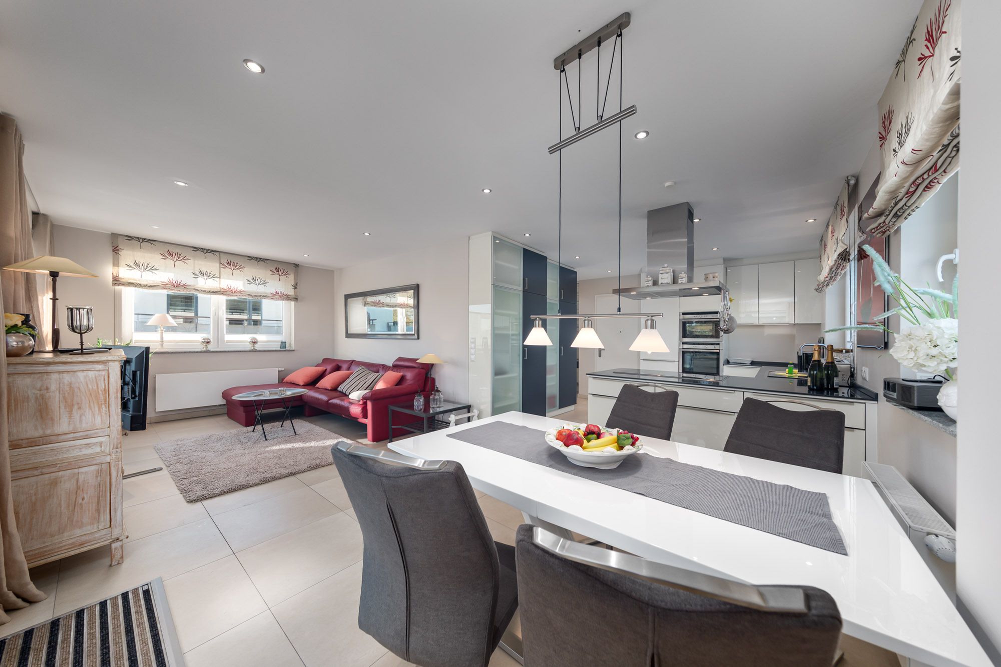 Das Penthouse The View verfügt über ein modernes Wohnzimmer mit Couchgarnitur, Flatscreen-TV und CD-Player, sowie einen hochwertigen Essbereich. Die große Küche ist mit einem Induktionskochfeld, Backofen, Geschirrspüler und Dampfgarer ausgestattet. Darüber hinaus finden Sie eine Filter Kaffeemaschine, einen Toaster wie auch einen Wasserkocher vor. Zusätzlich befindet sich ein Gäste-WC mit Dusche in diesem Bereich der Ferienwohnung Timmendorfer Strand.