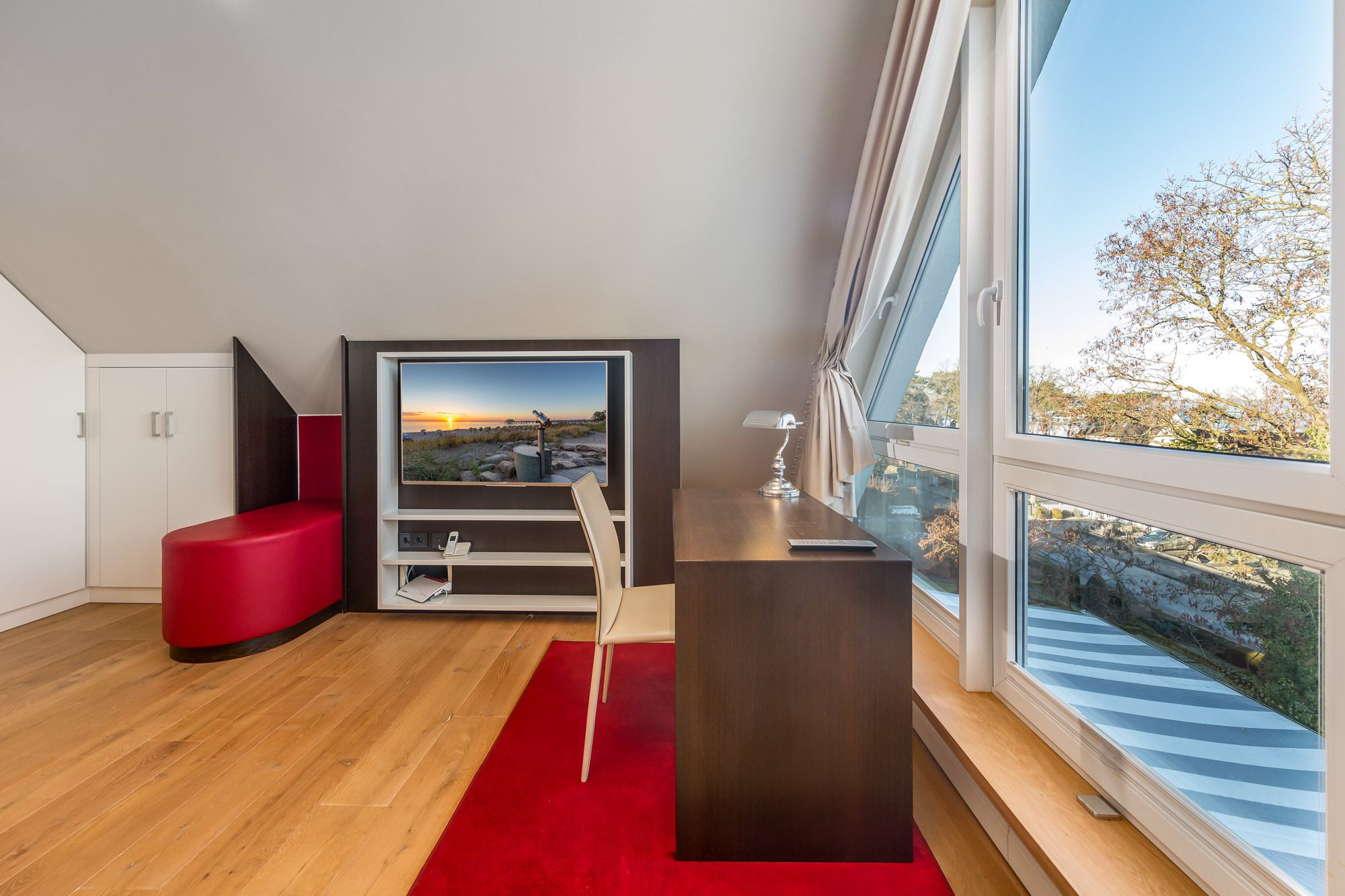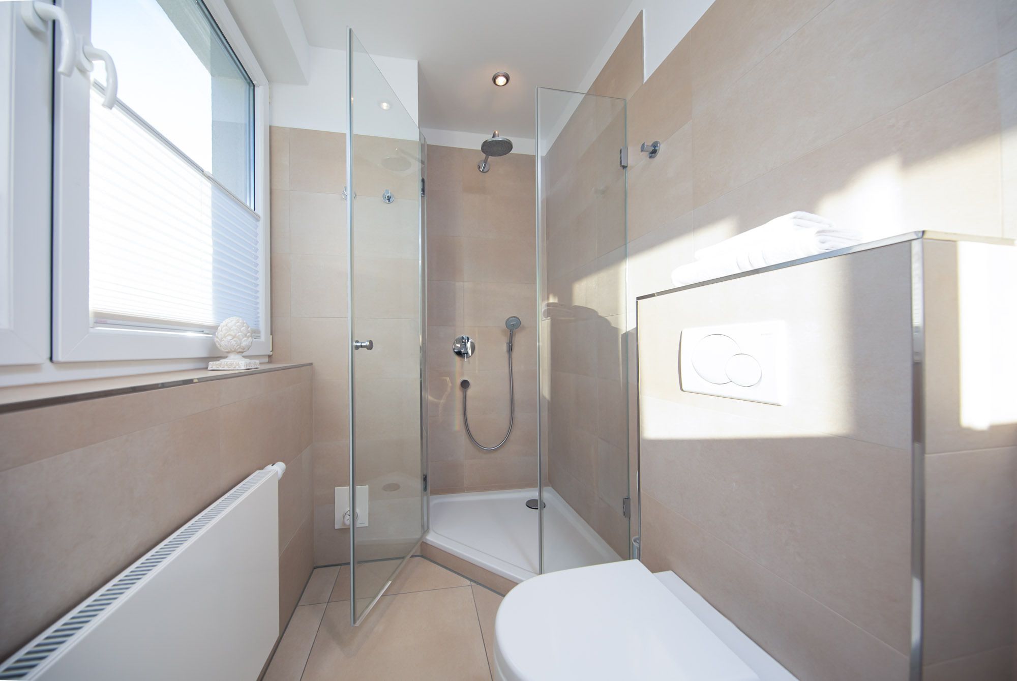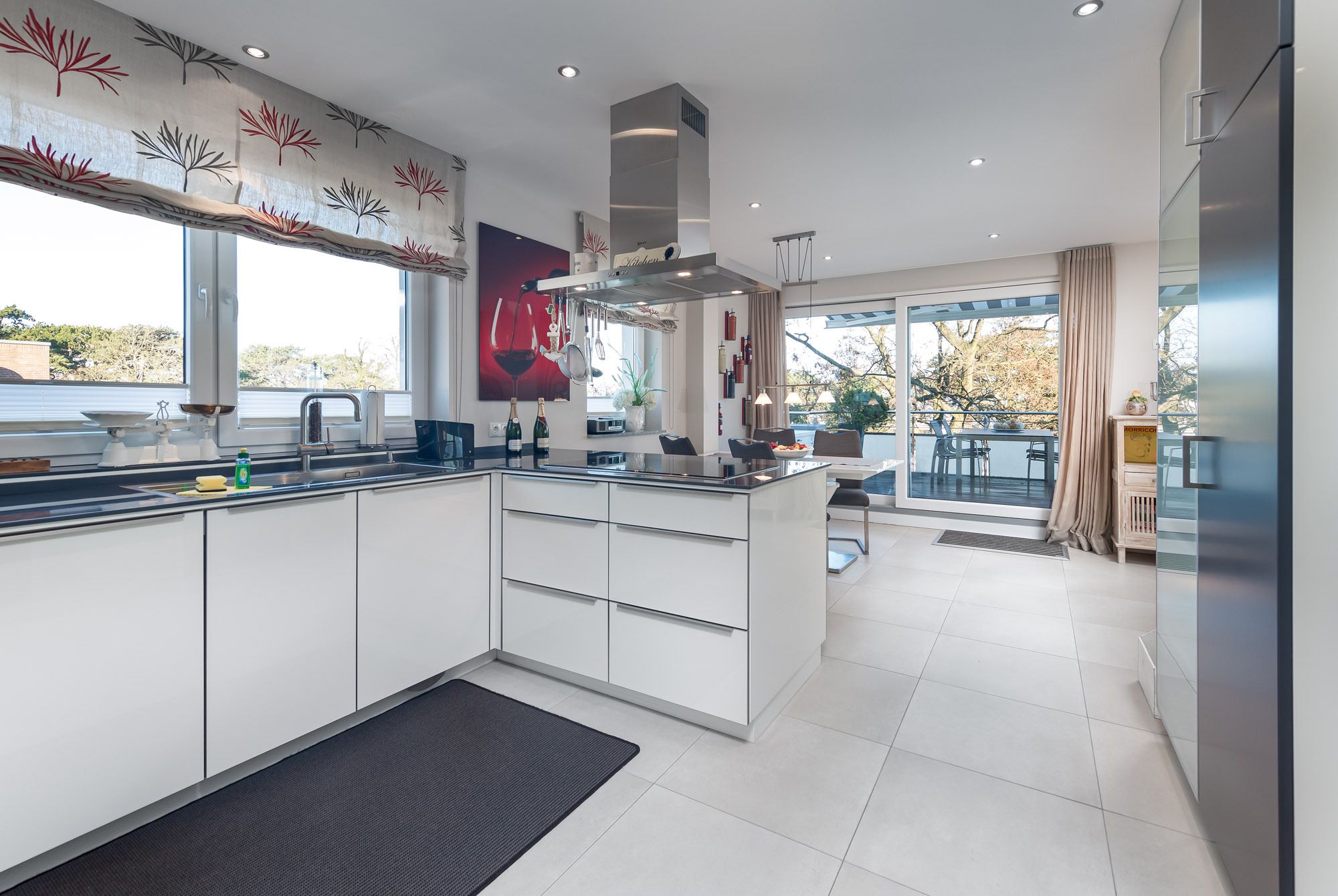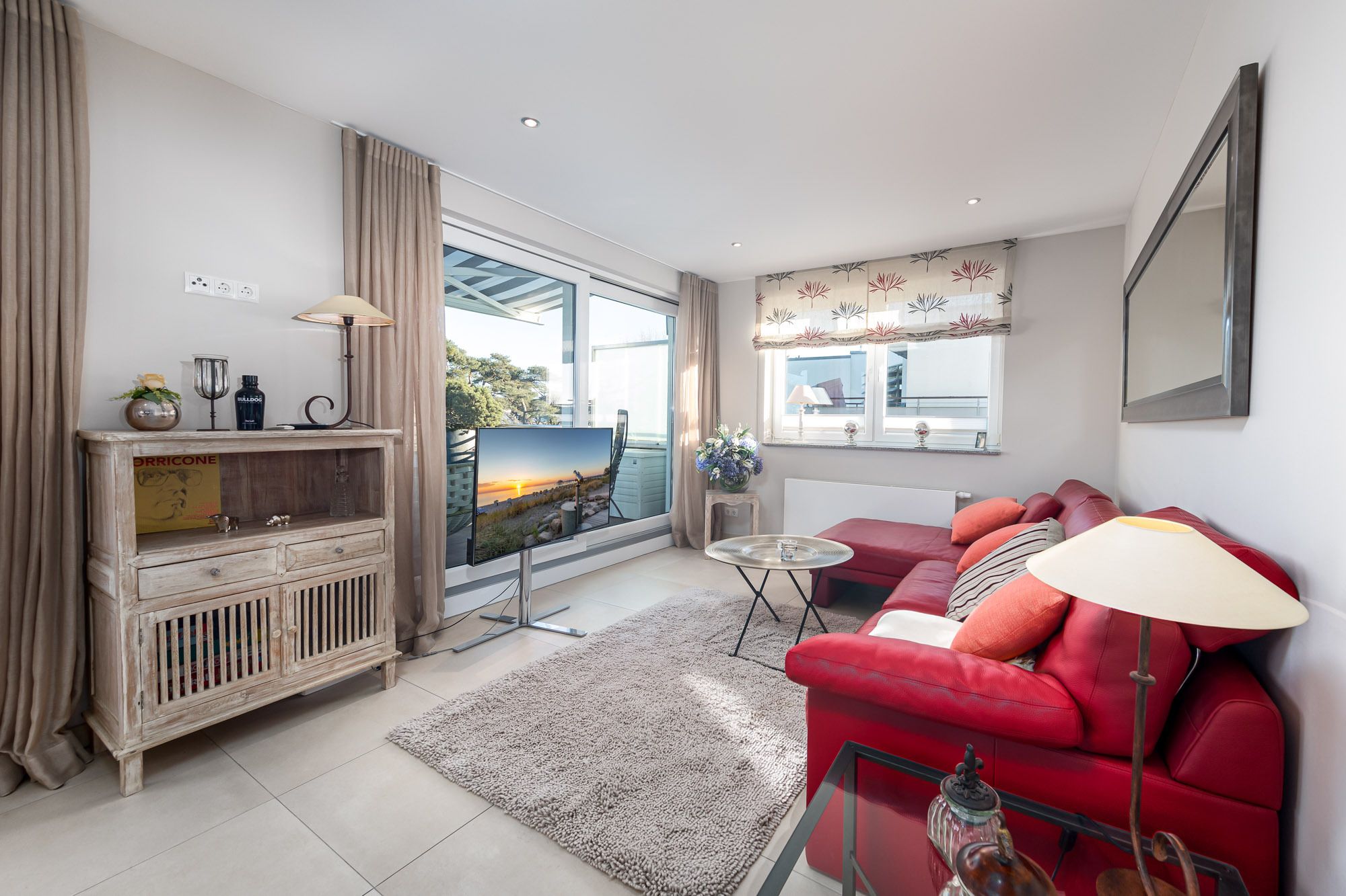 Das Penthouse The View verfügt über ein modernes Wohnzimmer mit Couchgarnitur, Flatscreen-TV und CD-Player, sowie einen hochwertigen Essbereich. Die große Küche ist mit einem Induktionskochfeld, Backofen, Geschirrspüler und Dampfgarer ausgestattet. Darüber hinaus finden Sie eine Filter Kaffeemaschine, einen Toaster wie auch einen Wasserkocher vor. Zusätzlich befindet sich ein Gäste-WC mit Dusche in diesem Bereich der Ferienwohnung Timmendorfer Strand.