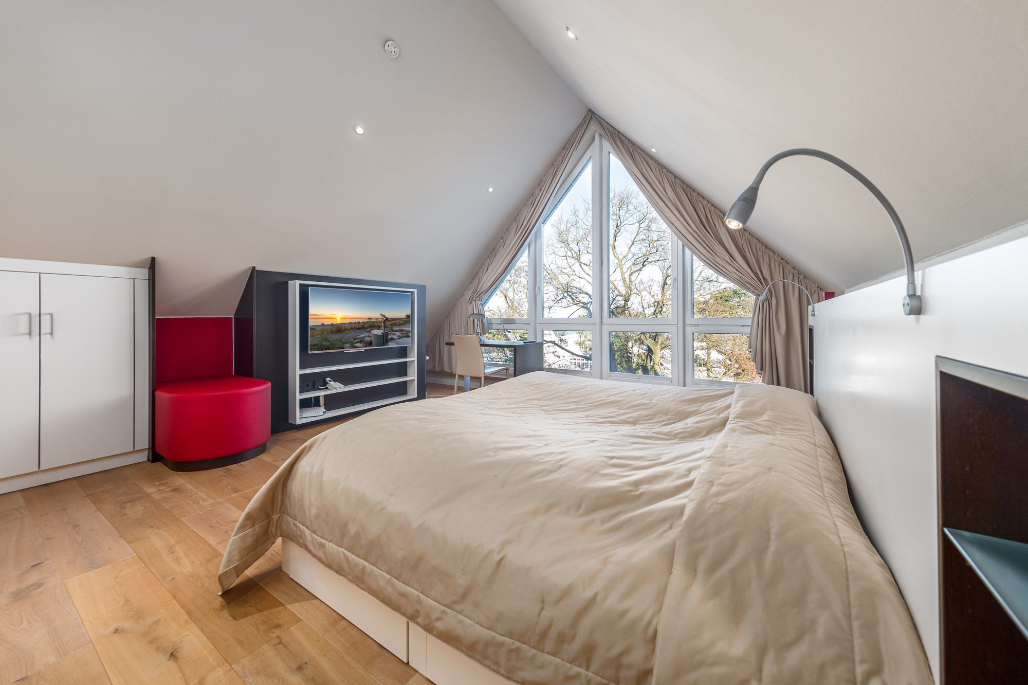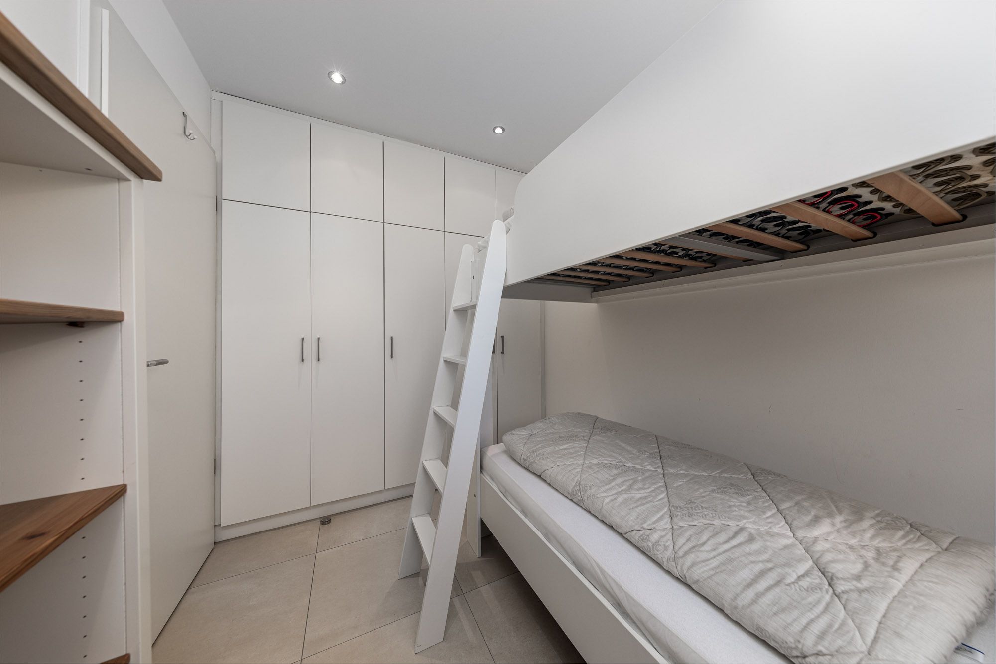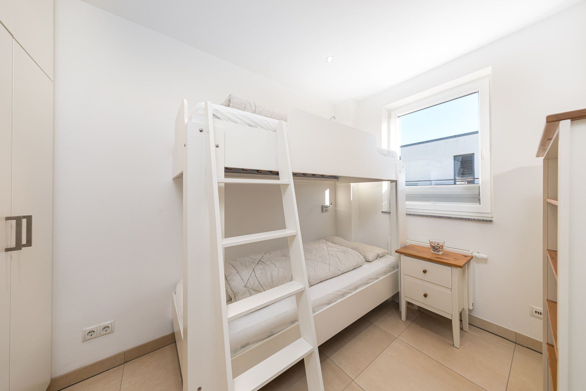 Das separate Schlafzimmer mit Doppelbett (200x200cm) und 2. Flatscreen-TV befindet sich auf der 2. Ebene der Timmendorfer Strand Ferienwohnung (über eine Treppe erreichbar), das 2. Schlafzimmer verfügt über ein Etagenbett mit zwei Matratzen (90x200cm) und liegt auf der unteren Ebene. Um Ihnen einen erholsamen Schlaf zu garantieren, lassen sich die Schlafräume der Ferienwohnung verdunkeln. Das großzügige Badezimmer ist mit einer Regenwald-Dusche ausgestattet und befindet sich ebenfalls auf der 2. Ebene.
