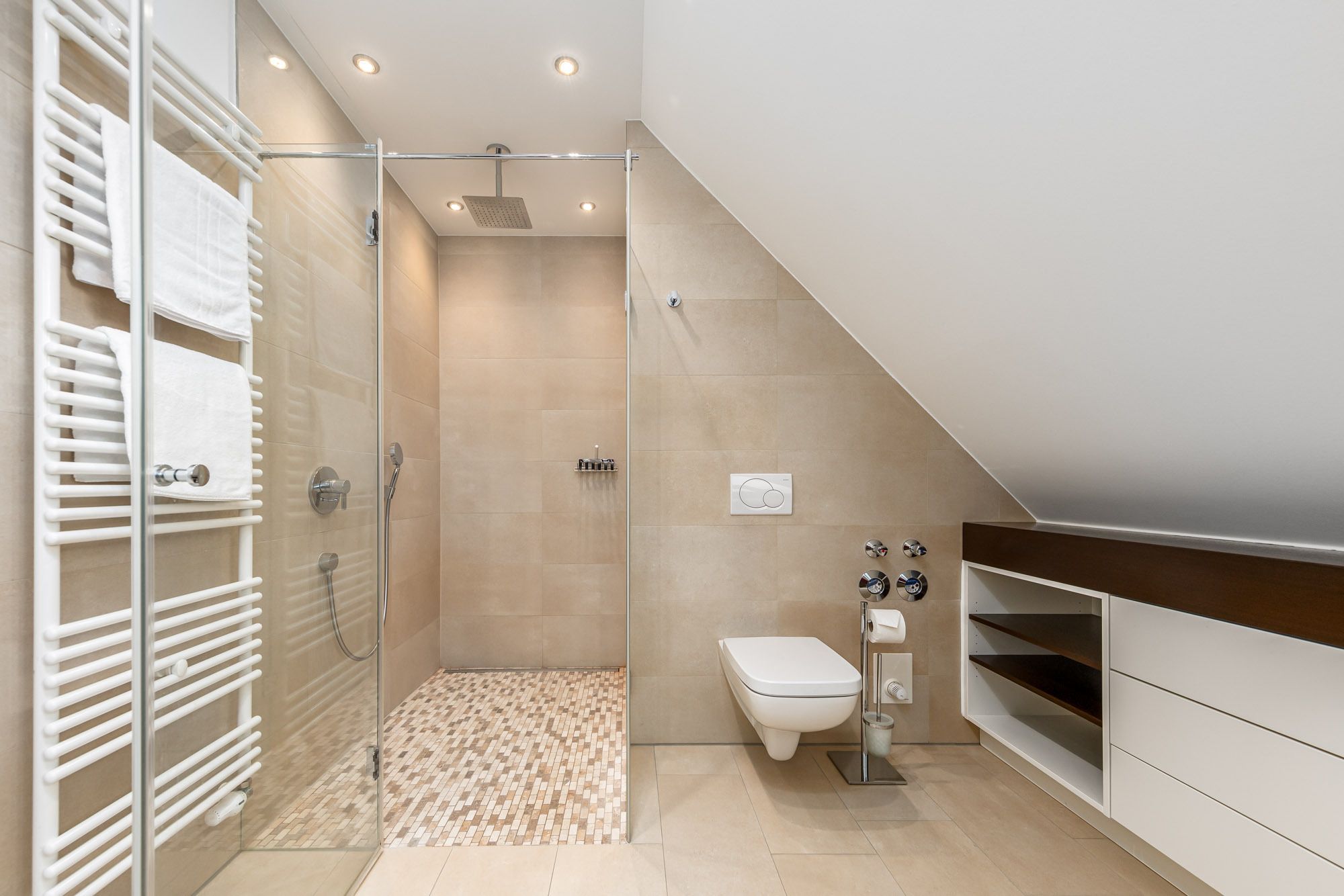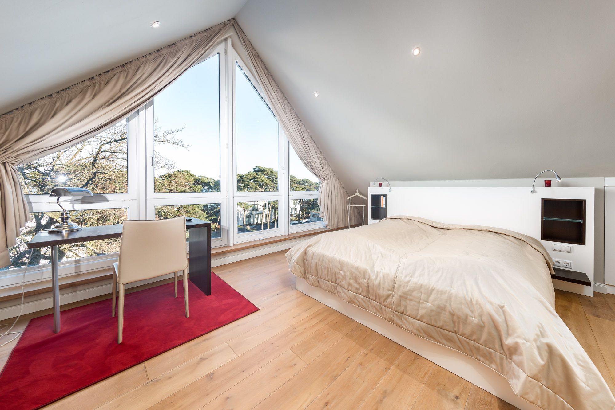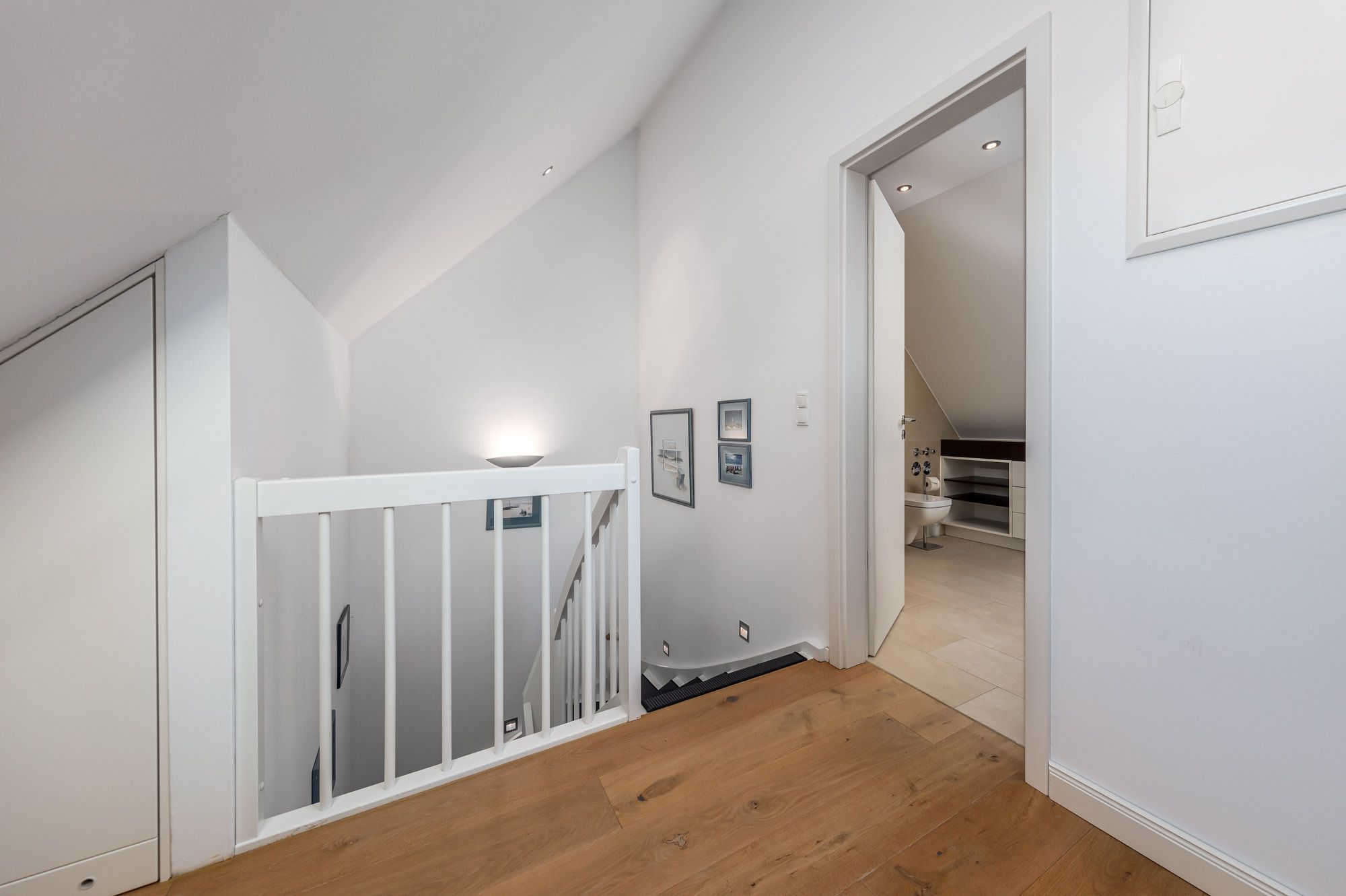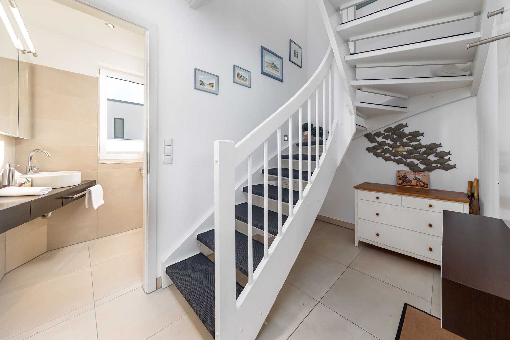 Das separate Schlafzimmer mit Doppelbett (200x200cm) und 2. Flatscreen-TV befindet sich auf der 2. Ebene der Timmendorfer Strand Ferienwohnung (über eine Treppe erreichbar), das 2. Schlafzimmer verfügt über ein Etagenbett mit zwei Matratzen (90x200cm) und liegt auf der unteren Ebene. Um Ihnen einen erholsamen Schlaf zu garantieren, lassen sich die Schlafräume der Ferienwohnung verdunkeln. Das großzügige Badezimmer ist mit einer Regenwald-Dusche ausgestattet und befindet sich ebenfalls auf der 2. Ebene.