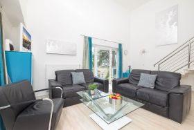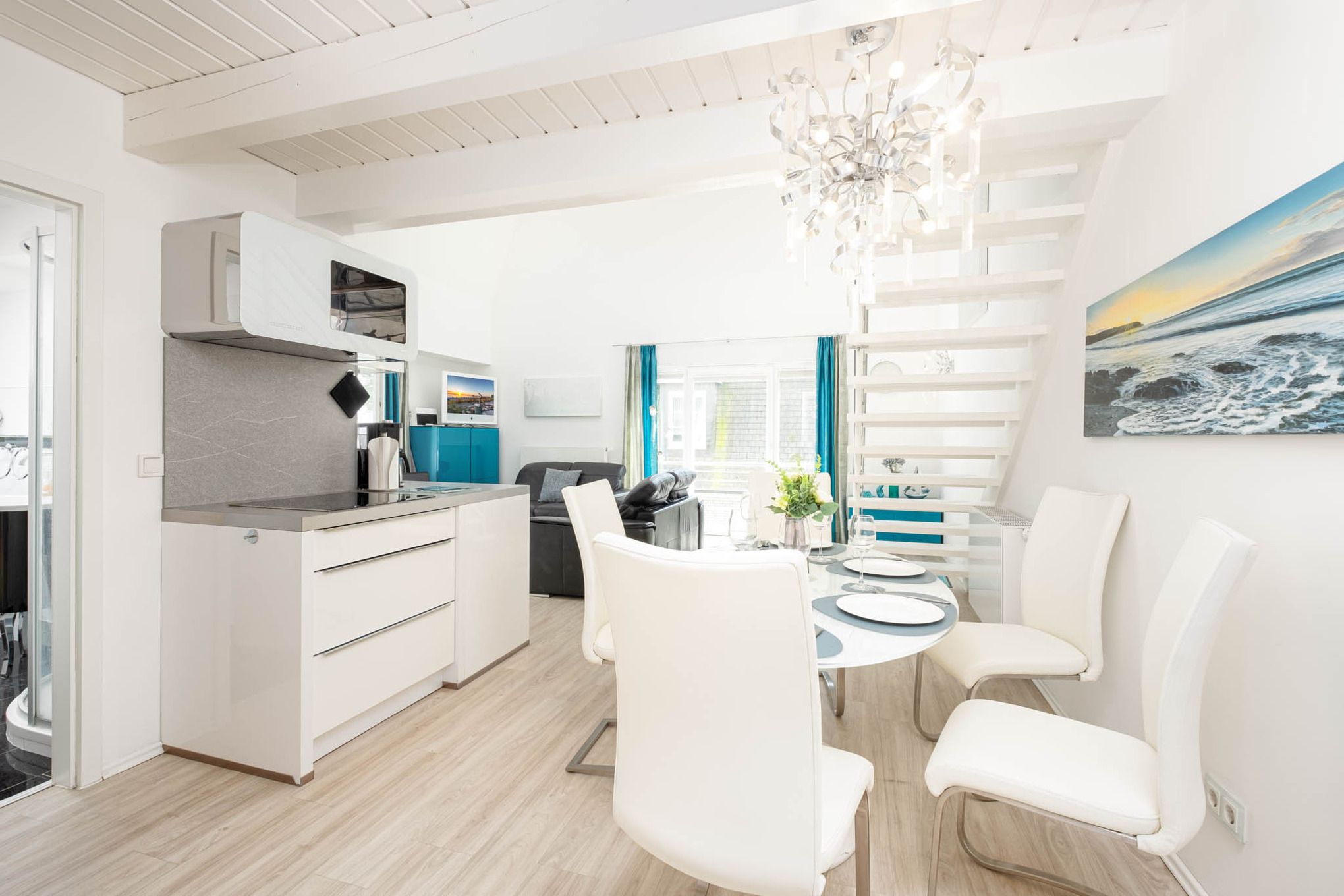Der Wohn- und Essbereich mit offener Küche, mit Cerankochfeld, Kühlschrank mit integriertem Gefrierfach, Mikrowelle, Geschirrspülmaschine und Kaffeemaschine lässt keine Wünsche offen. In der gleichen Etage finden Sie ebenfalls ein Schlafzimmer mit einem Doppelbett (180 x 200 cm), sowie ein Badezimmer mit Dusche. In allen Schlafräumen befinden sich TV-Geräte. Außenrollos zum abdunkeln des Raumes runden den Komfort ab.