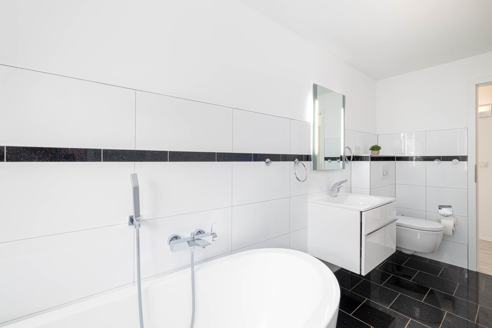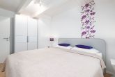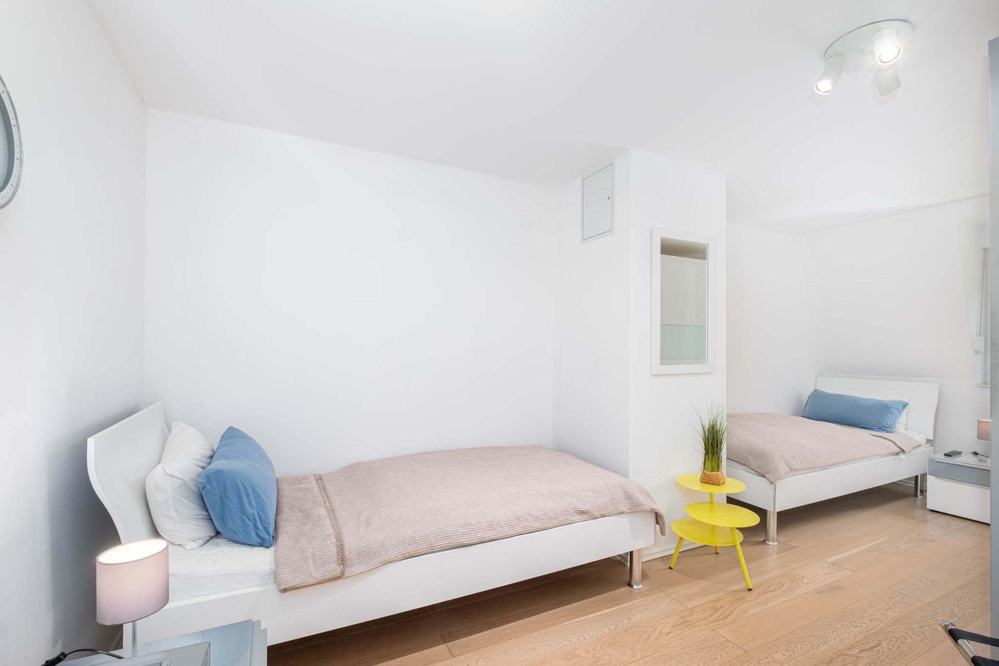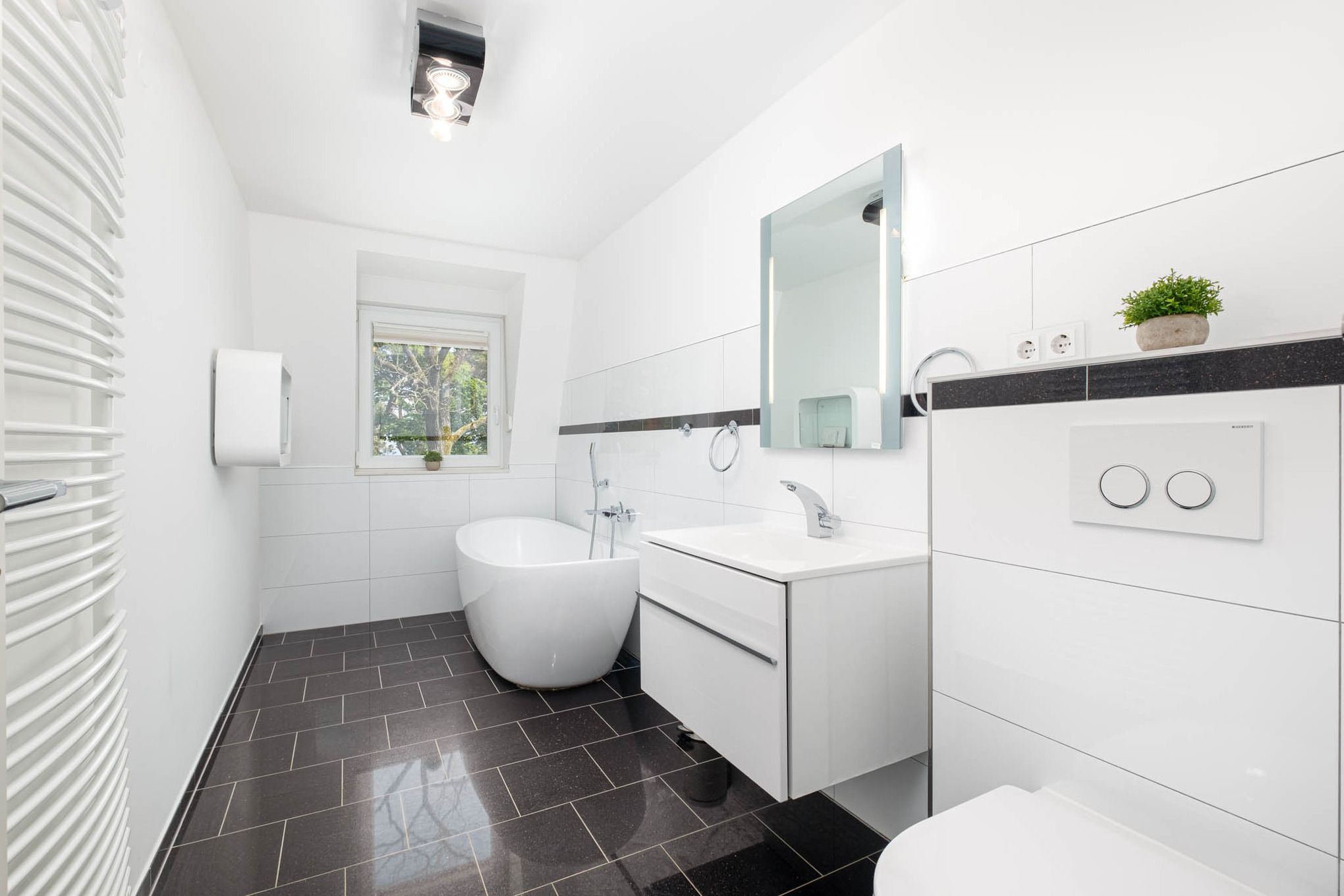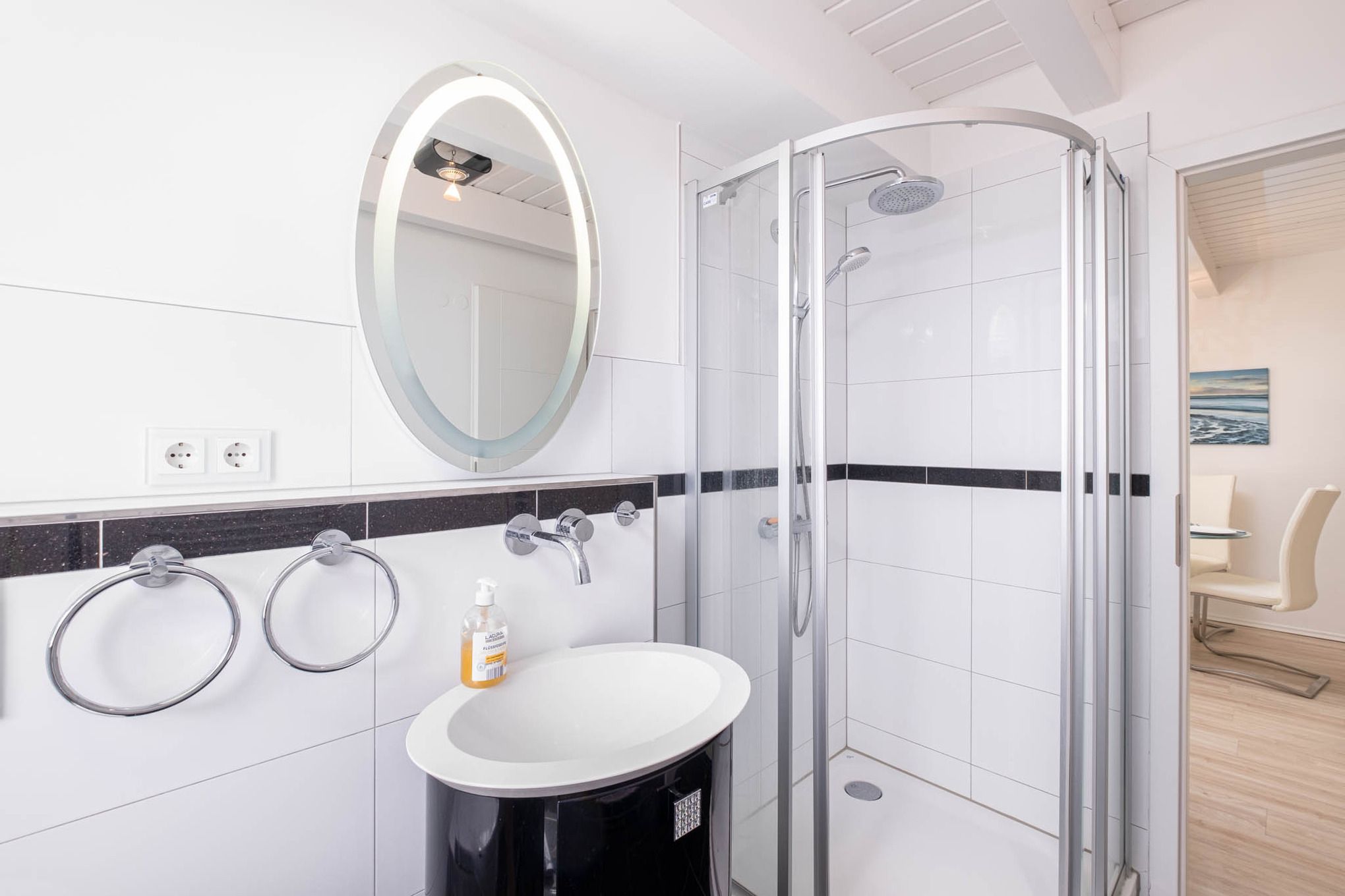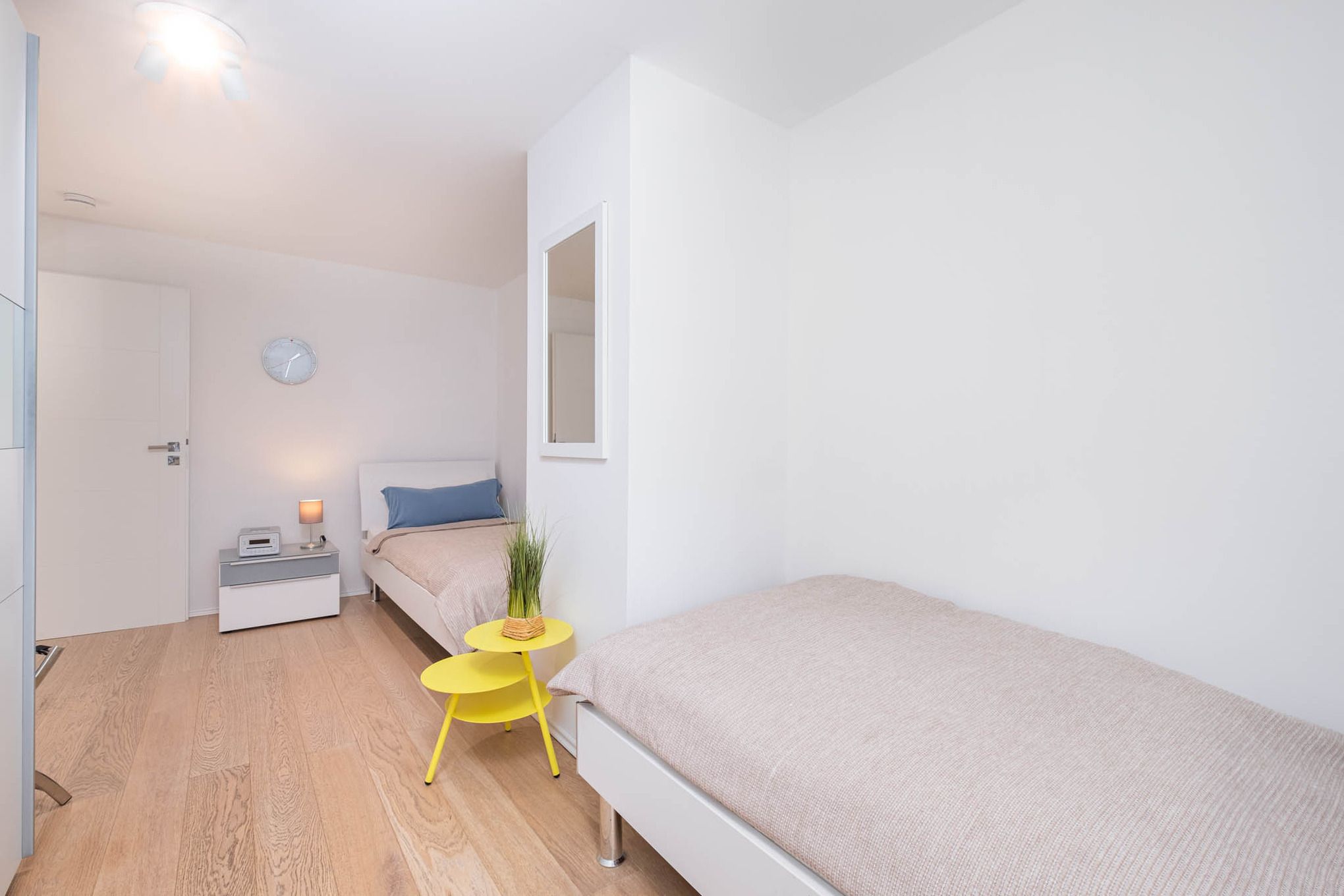 Über die offene Treppe im Wohnbereich erreichen Sie die obere Etage ausgestattet mit einen weiteren Schlafzimmer mit zwei getrennten Einzelbetten (je 90 x 200 cm). Ebenfalls begrüßt Sie auf dieser Ebene ein Badezimmer mit Ostseeblick. Hier können Sie Ihren Urlaubstag in der Badewanne ausklingen lassen.