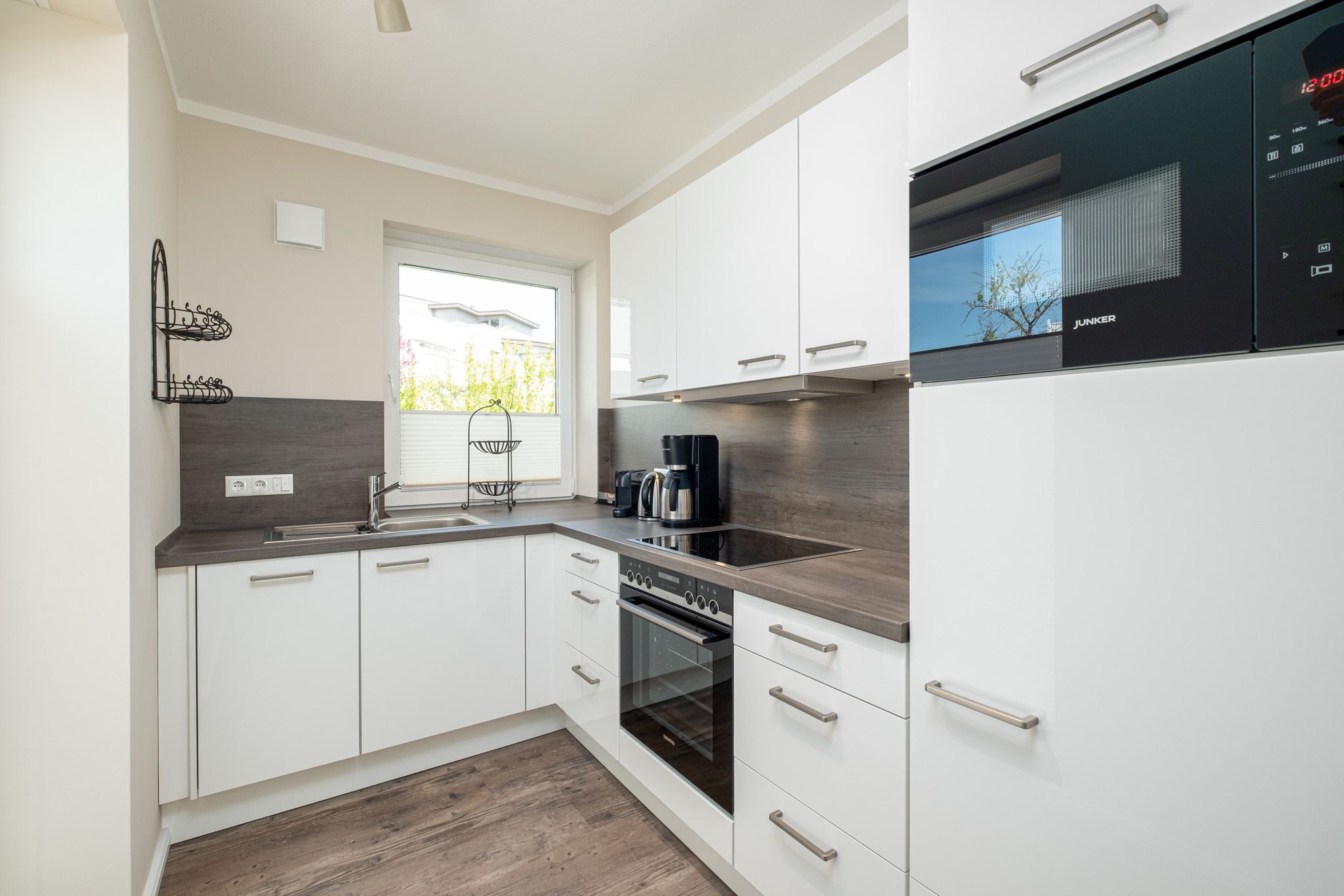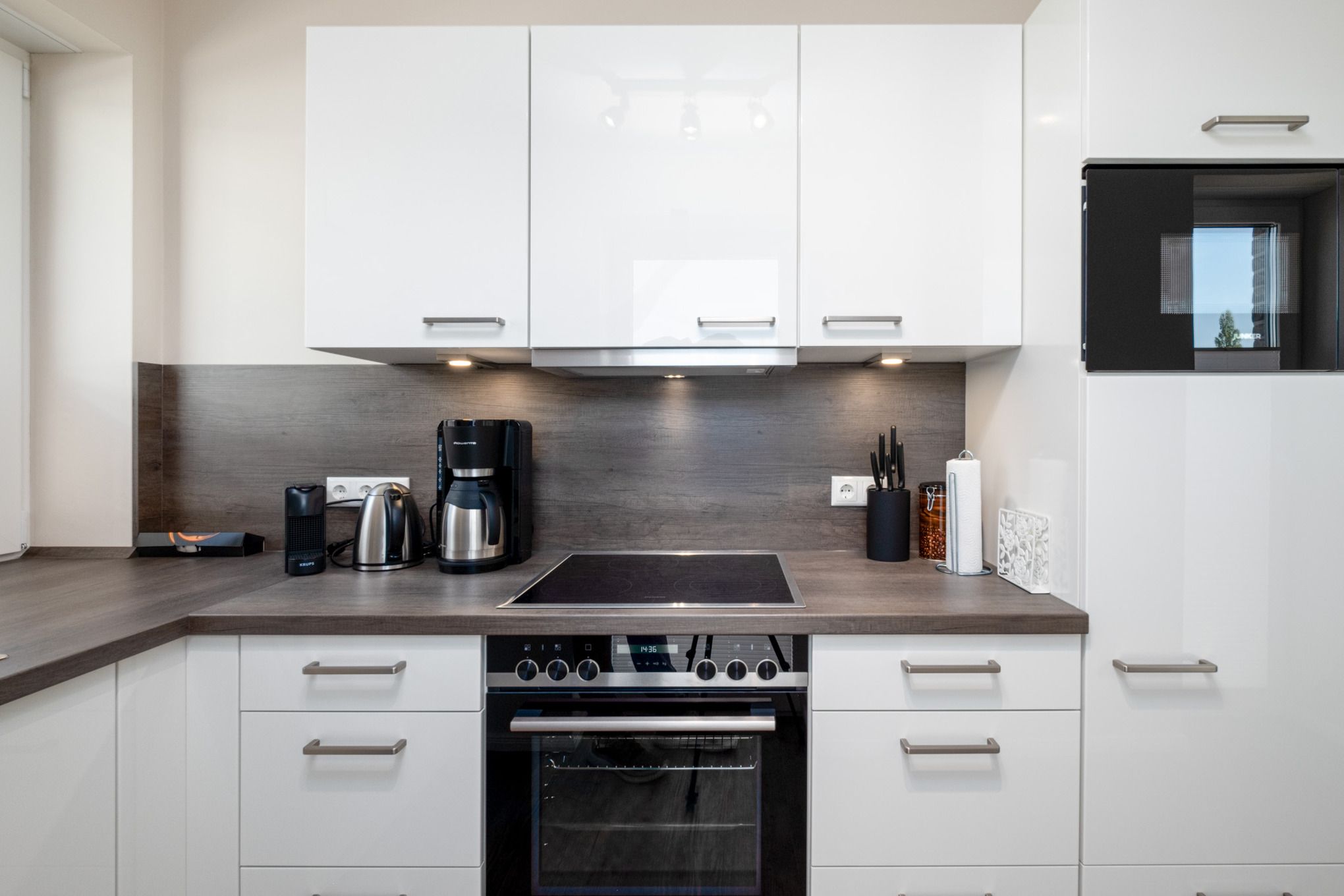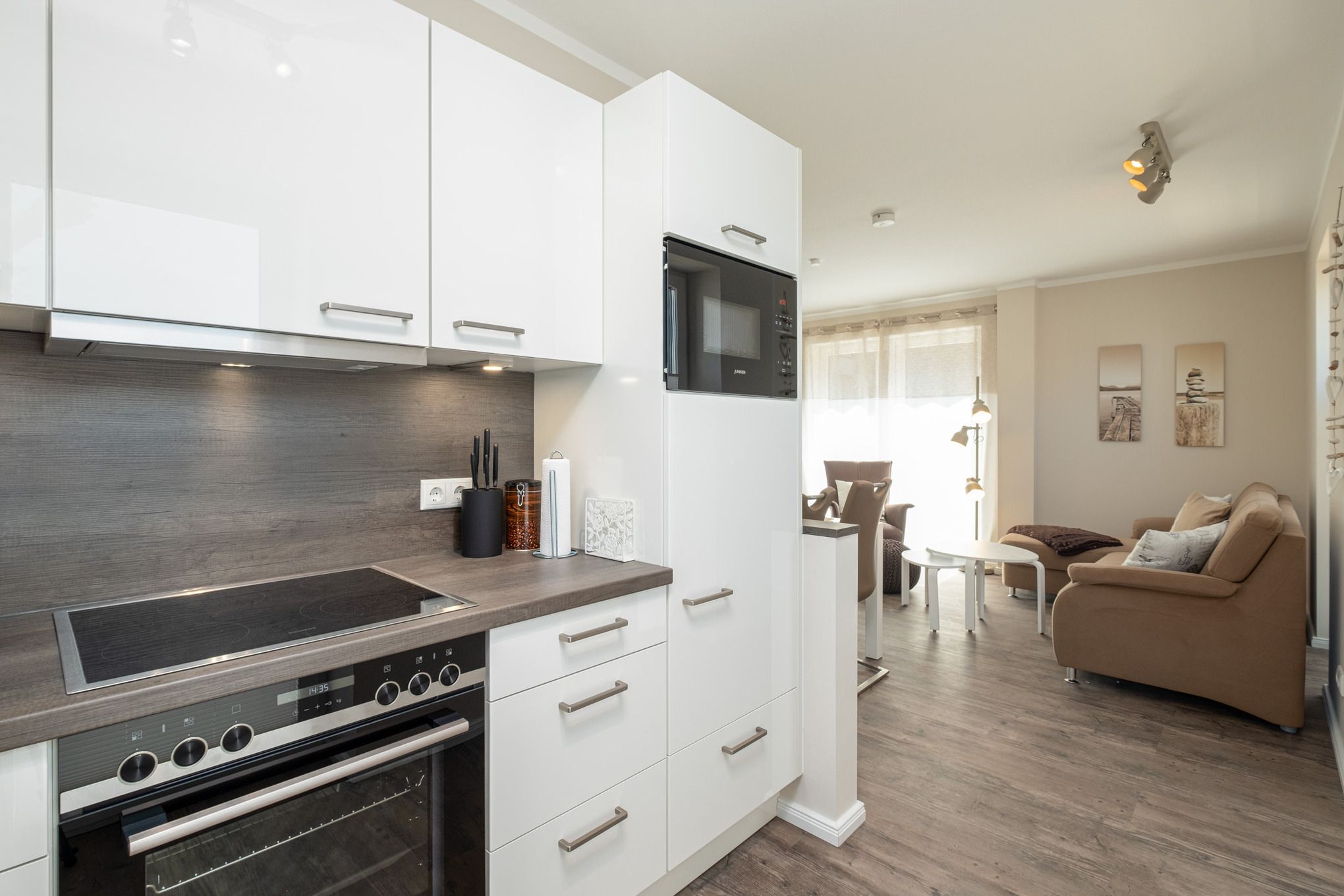 Die offene Küche ist mit allem Komfort ausgestattet u.a. sind Ceranfeld, Backofen, Mikrowelle, Nespresso Maschine und Geschirrspüler vorhanden.