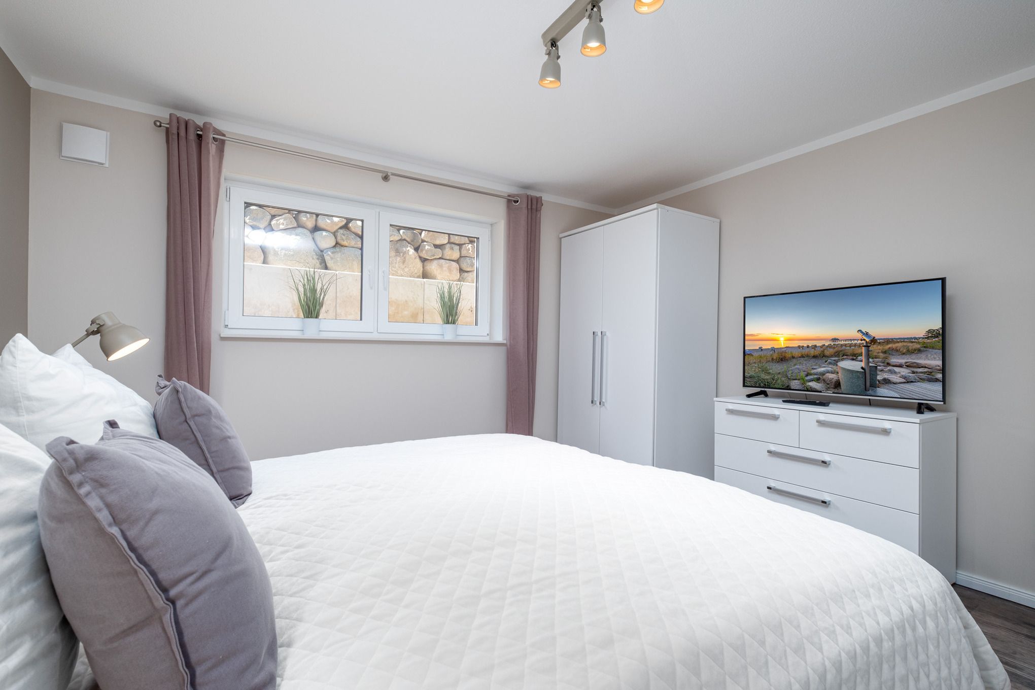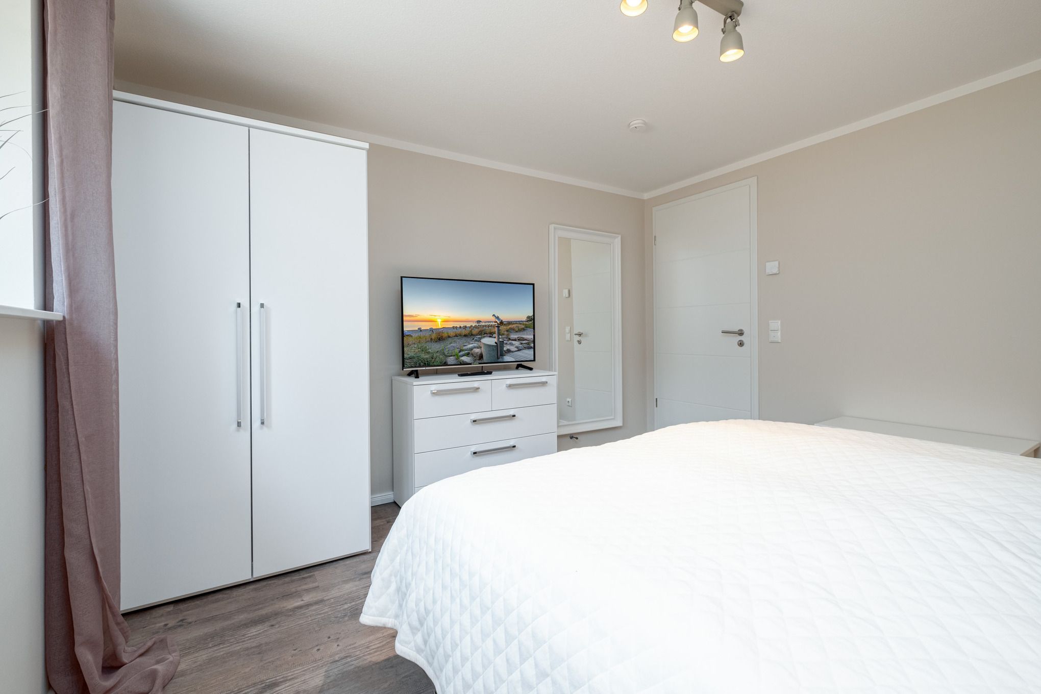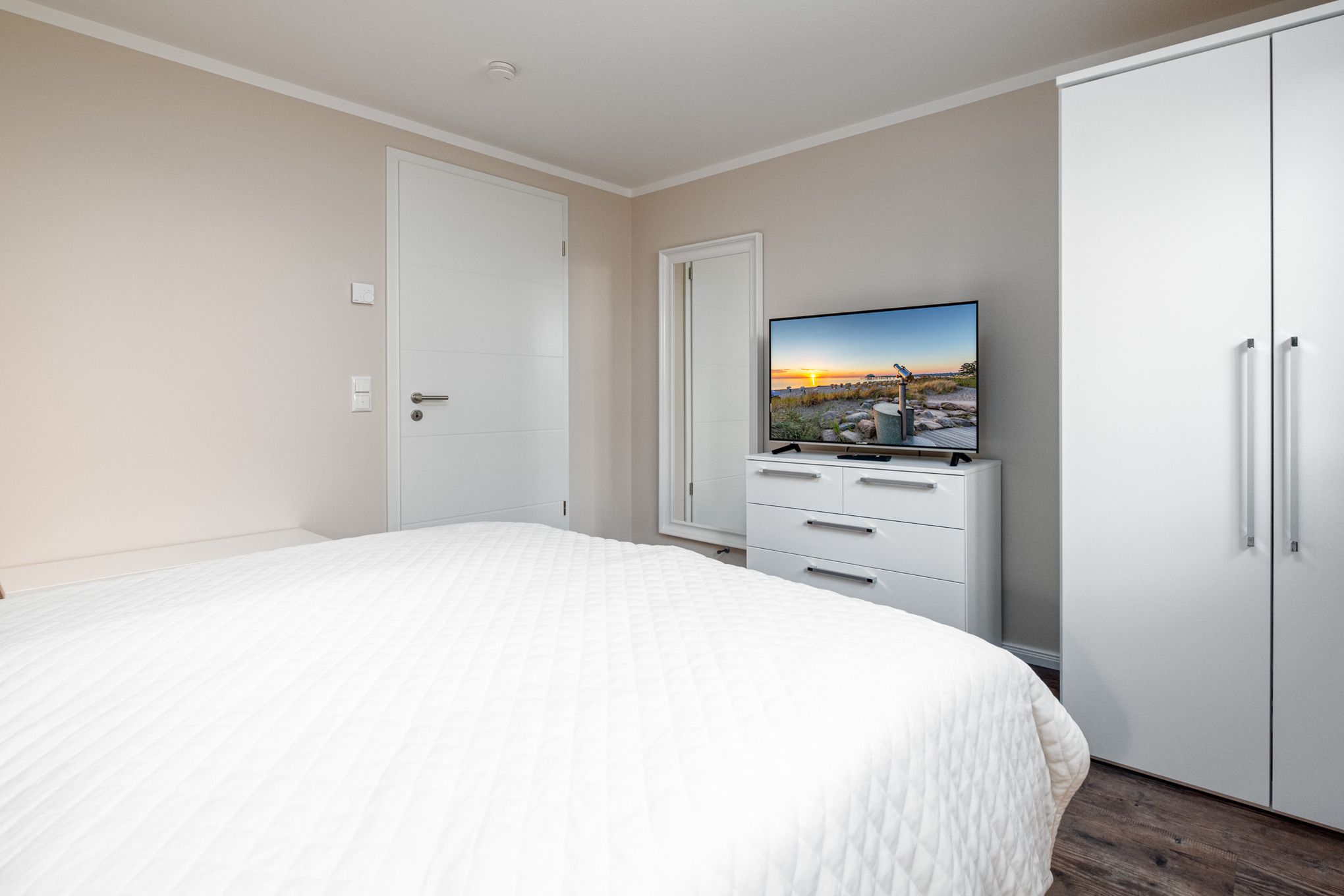 Das Schlafzimmer I sowie das Schlafzimmer II befinden sich beide im Untergeschoss der Niendorf/Ostsee Ferienwohnung und sind je mit einem Doppelbett (180x200cm), einem Kleiderschrank und einem zusätzlichen Flatscreen-TV ausgestattet. Die großen Erdlichtschächte sorgen auch hier für einen hellen Raum.