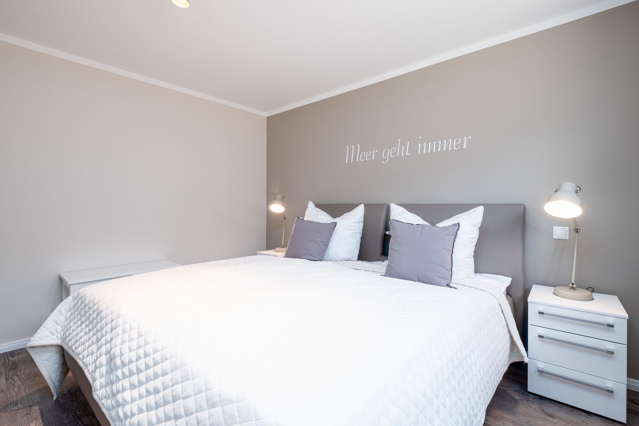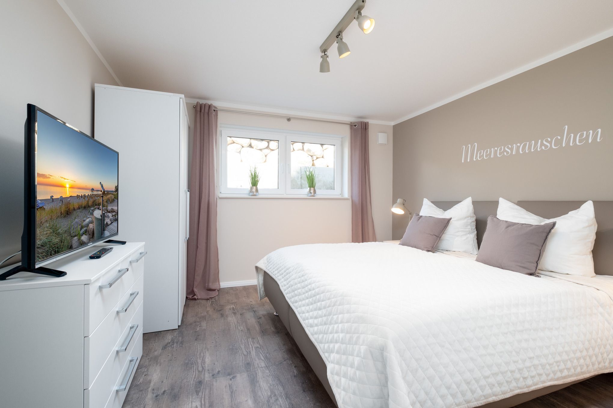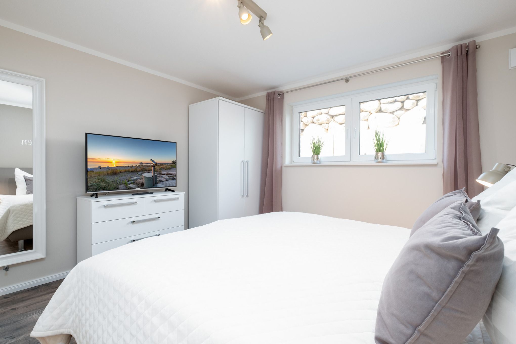 Das Schlafzimmer I sowie das Schlafzimmer II befinden sich beide im Untergeschoss der Niendorf/Ostsee Ferienwohnung und sind je mit einem Doppelbett (180x200cm), einem Kleiderschrank und einem zusätzlichen Flatscreen-TV ausgestattet. Die großen Erdlichtschächte sorgen auch hier für einen hellen Raum.