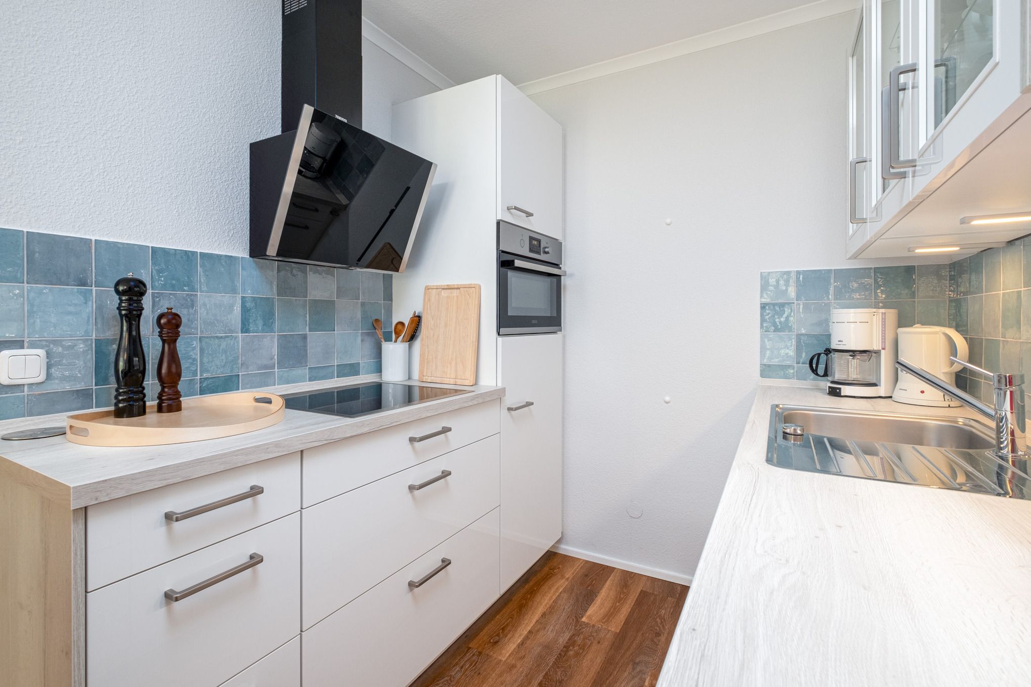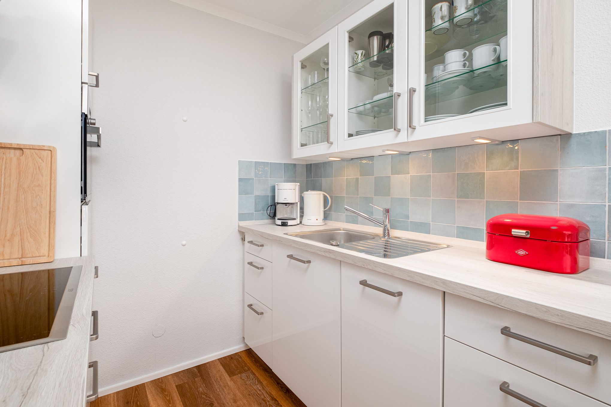 Der offene Wohnbereich ist mit einer Couchgarnitur, einem Essbereich sowie einer Schlafnische ausgestattet. Ein Flatscreen-TV sowie ein Radio mit Bluetooth Funktion stehen im Wohnzimmer für Sie zur Verfügung. Der Essbereich grenzt an die offene, moderne Küchenzeile. Diese ist mit 4-Platten-Induktionsherd, Geschirrspüler, Mikrowelle, Kaffeemaschine, Wasserkocher und Toaster ausgestattet.