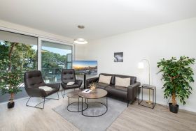 Die Küche ist modern und rund um mit allem, was das kulinarische Herz höher schlagen lässt, ausgestattet - ein Kühlschrank mit Gefrierfach, ein Backofen mit Mikrowellenfunktion, ein Induktionskochfeld, ein Geschirrspüler, eine Kaffeemaschine sowie eine ergänzende Nespresso-Kapselmaschine, ein Toaster und ein Wasserkocher stehen für Sie bereit.