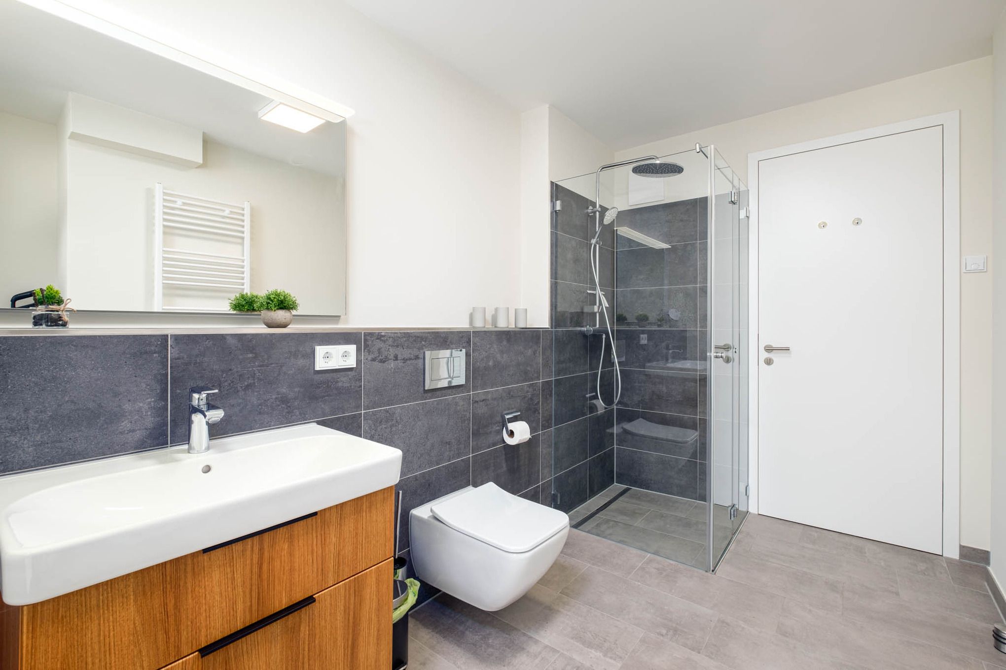 Die Timmendorfer Strand Ferienwohnung bietet Ihnen ein Badezimmer mit WC, Dusche, Waschmaschine und Handtuchwärmer. Ergänzend verfügt das Objekt über ein Gäste-WC.