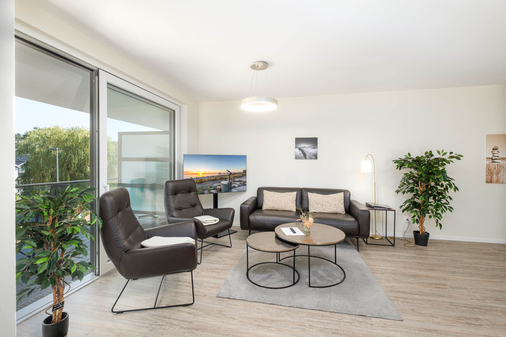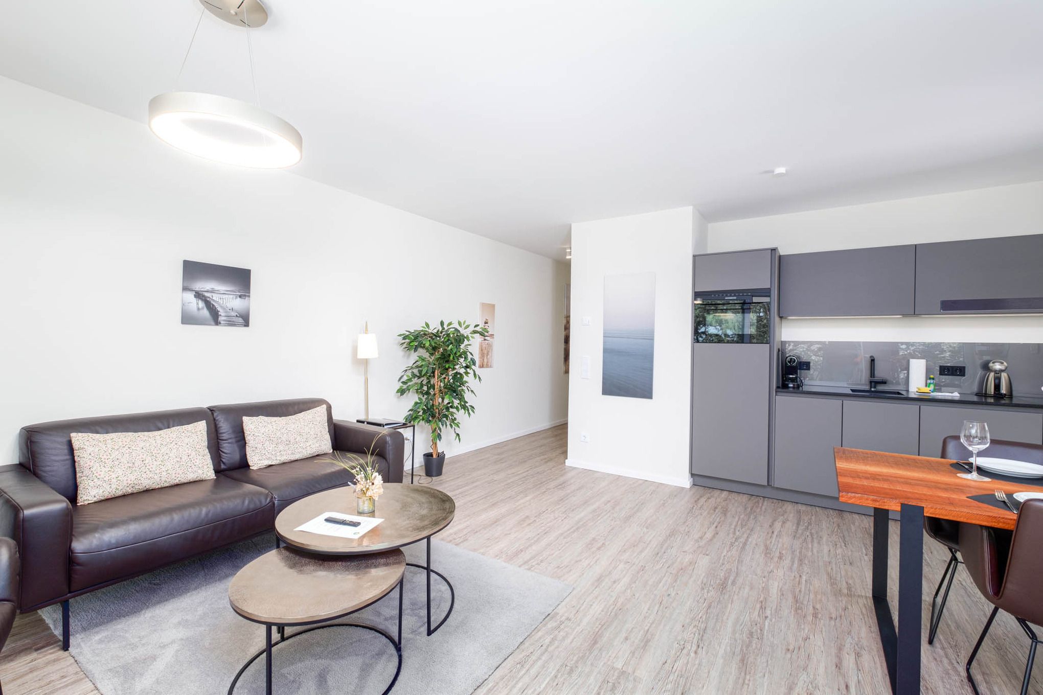Die Ferienunterkunft verfügt über einen offen gestalteten Wohn-Essbereich mit angrenzender, offener Küche. Das direkt angrenzende und ebenfalls offene Wohnzimmer ist mit einer hochwertigen Couchgarnitur, ergänzenden komfortablen Ledersesseln ausgestattet und verfügt zudem über einen Flatscreen-TV. Darüber hinaus steht Ihnen ein Radio mit Bluetooth-Funktion zur Verfügung.
