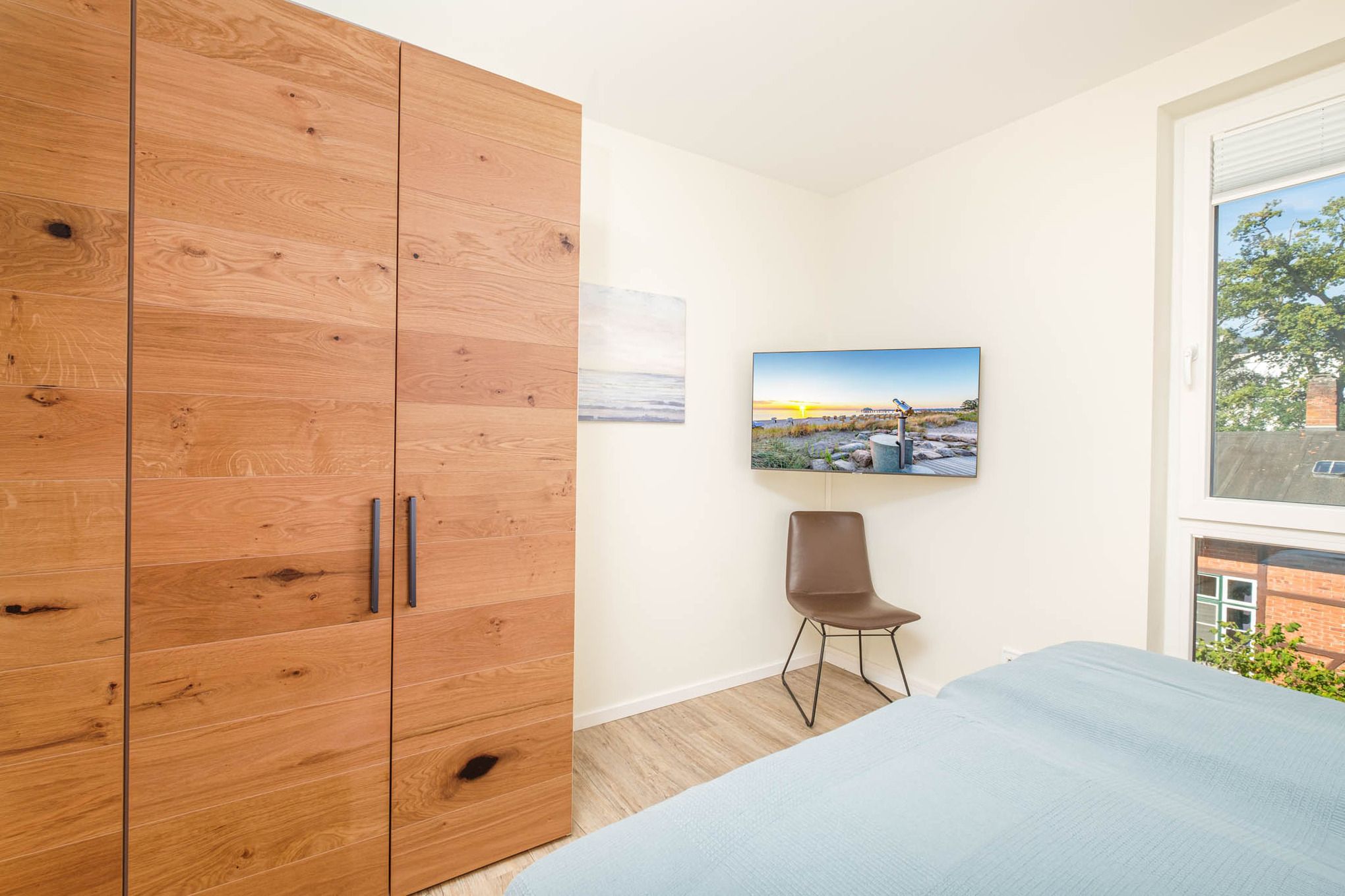 Das Schlafzimmer I bietet Ihnen mit einem hochwertigen Boxspringbett (180x200cm) sowie einem zusätzlichen 2. TV und einem geräumigen Kleiderschrank eine Ruheoase für erholsame Stunden. Im Schlafzimmer II erwarten Sie zwei komfortable Einzelbetten (je 90x200cm) sowie ebenfalls Stauraum für Ihr Reisegepäck.