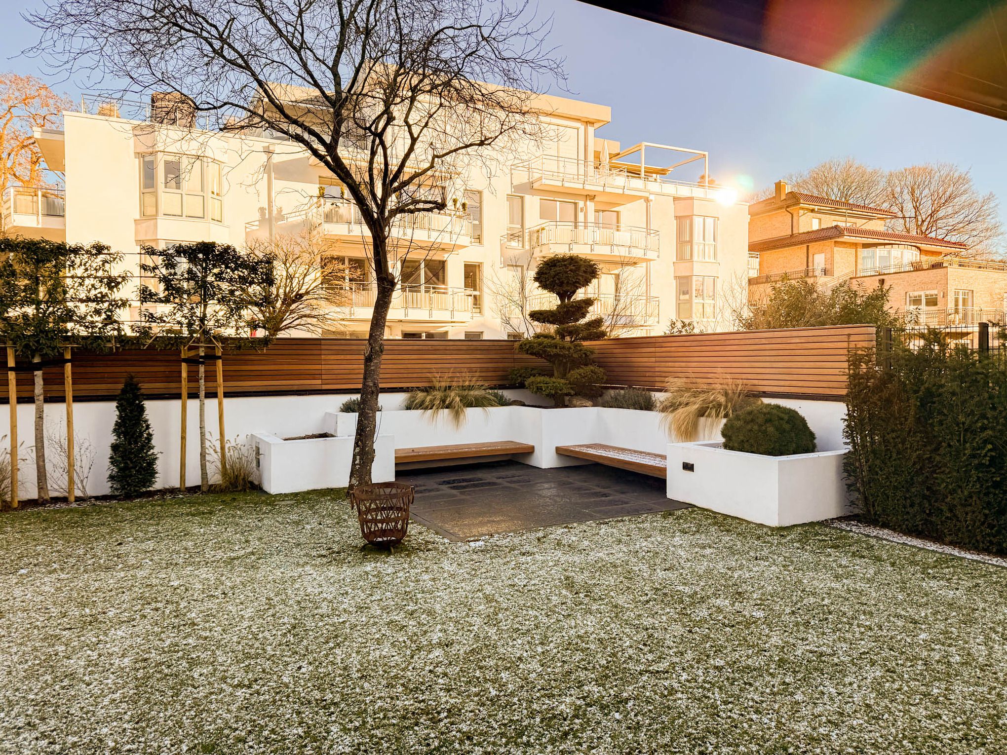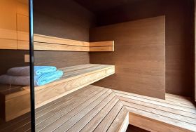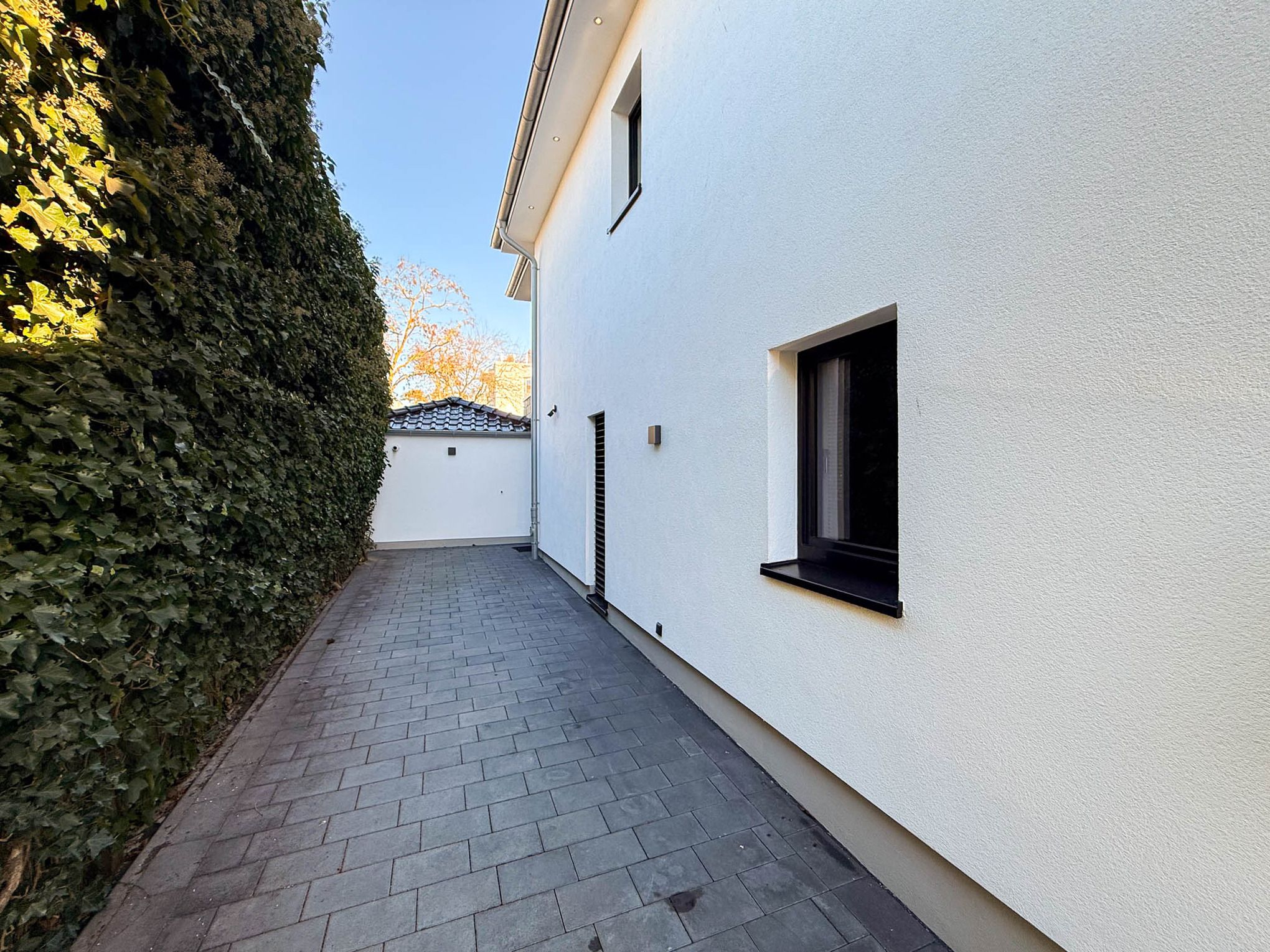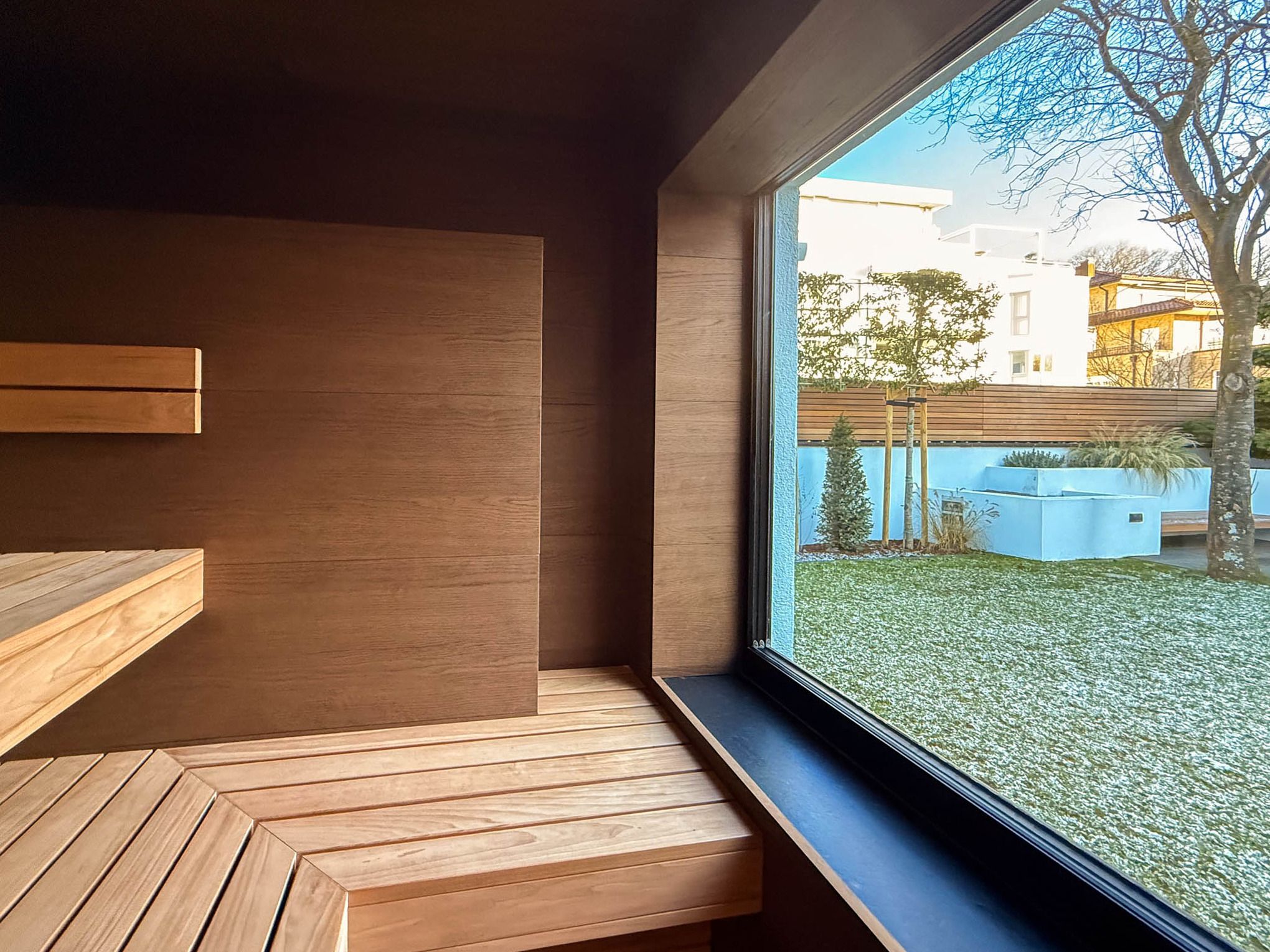 Ein besonderes Highlight ist das separat gelegene Schlafzimmer im Anbau, das über die Terrasse erreichbar ist. Dieses bietet ein Bad en Suite mit Dusche sowie direkten Zugang zur angrenzenden Sauna mit Blick in den Garten – ein privater Wellnessbereich der Extraklasse.