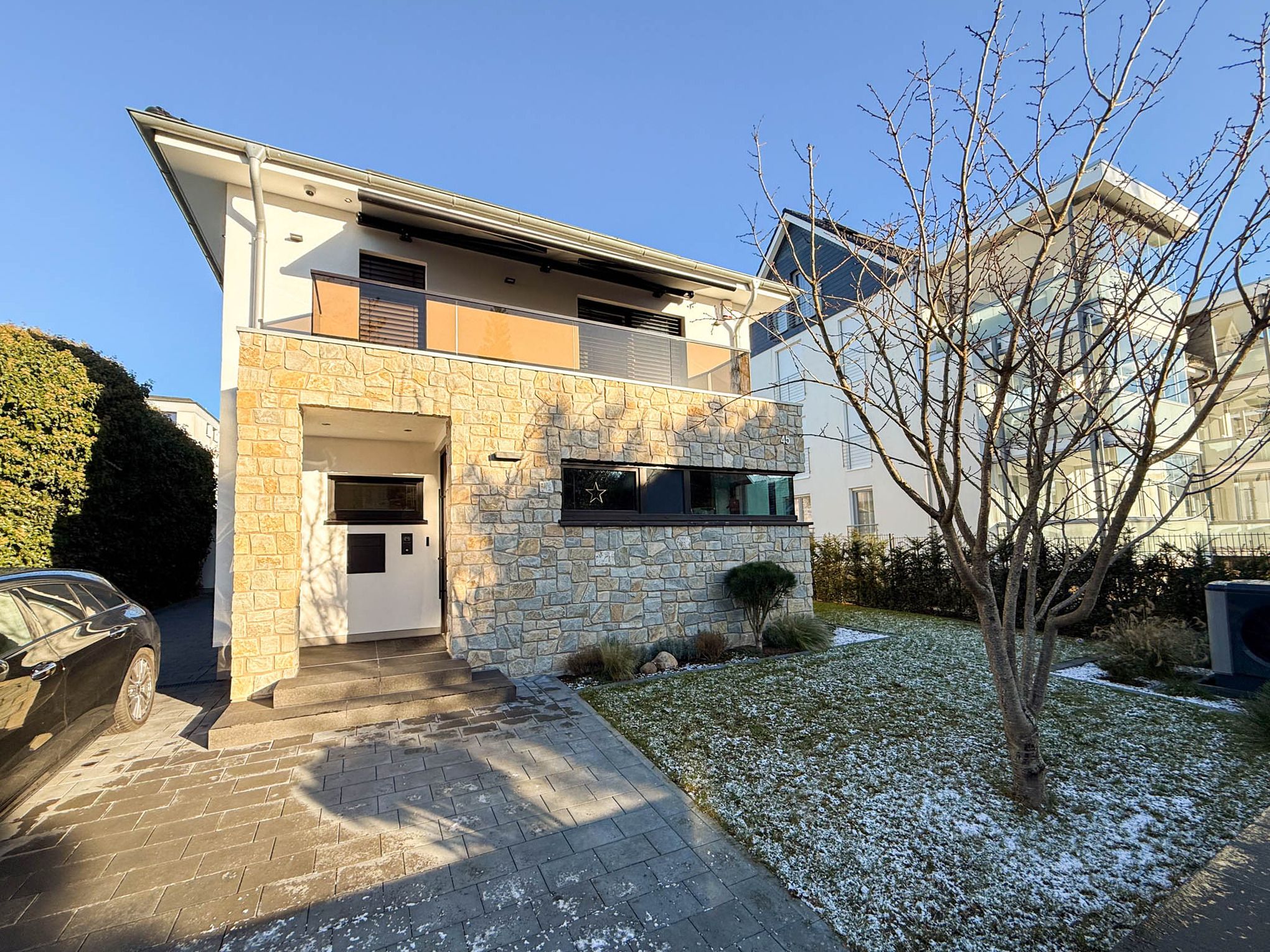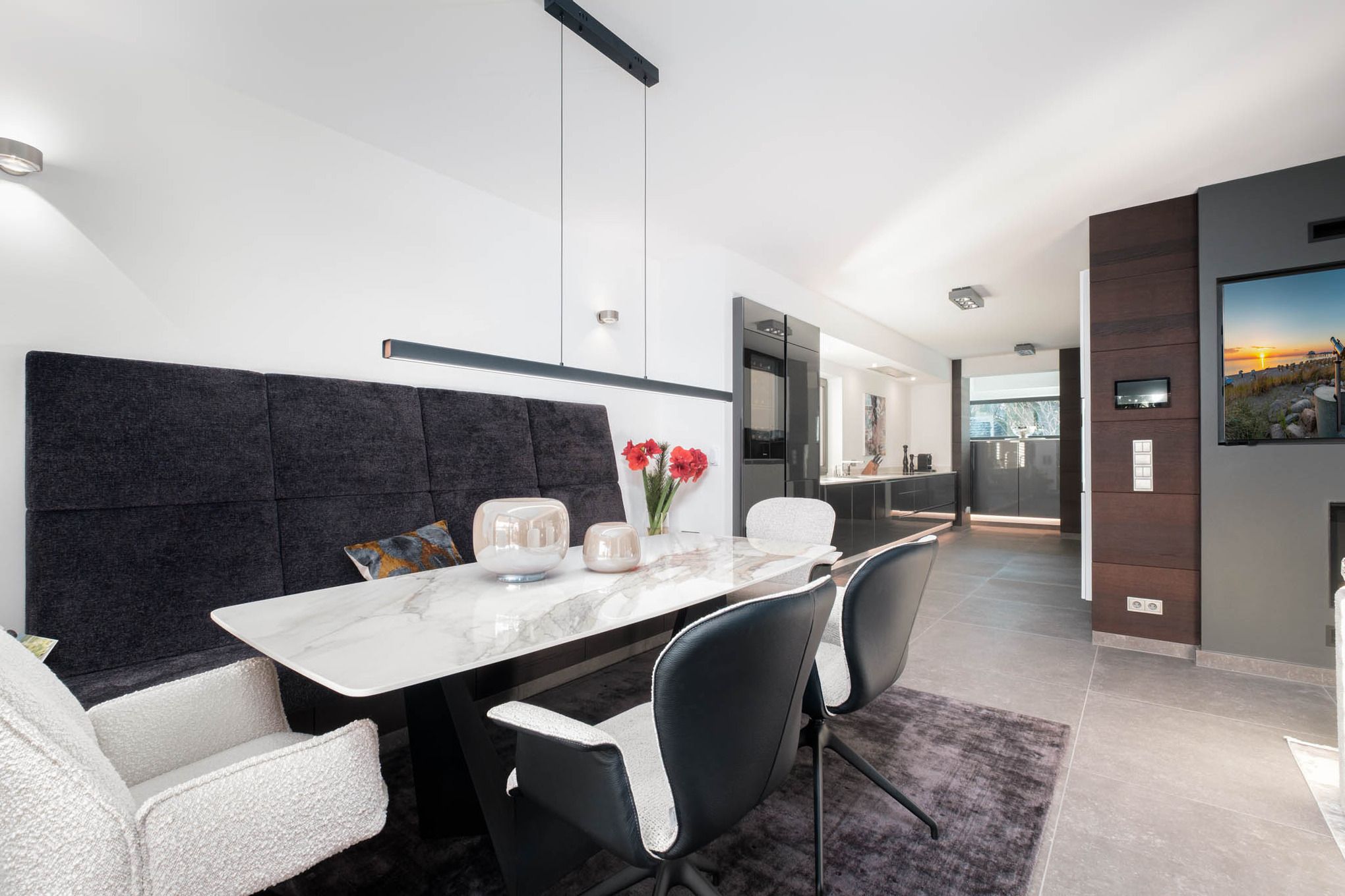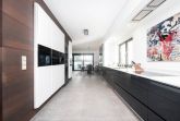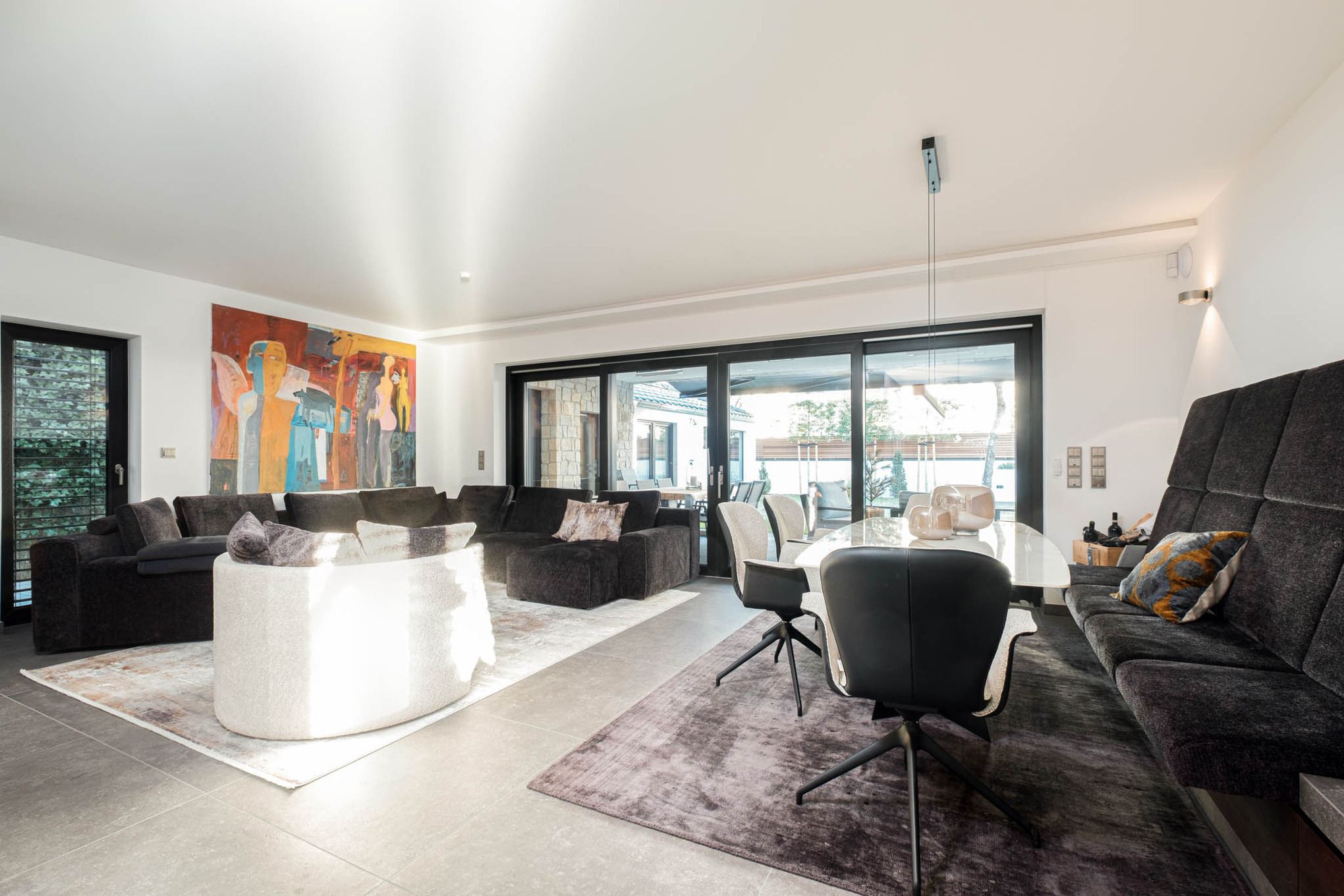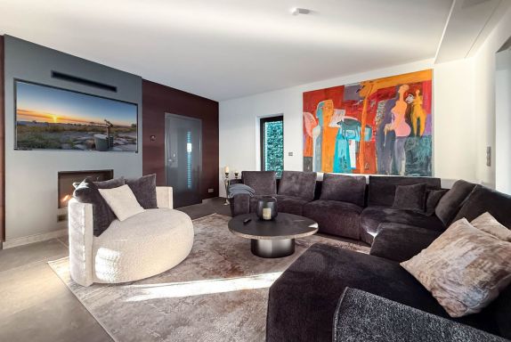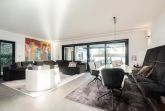 Der helle, offen gestaltete Wohnraum bildet das Herzstück des Hauses und überzeugt mit exklusivem Mobiliar, einem stilvollen Marmortisch im offenen Essbereich, einer Sonos-Musikanlage für erstklassigen Klang – auch auf der Terrasse. Die Beleuchtung lässt sich in weiten Teilen des Hauses atmosphärisch dimmen und sorgt zu jeder Tageszeit für ein besonderes Ambiente.