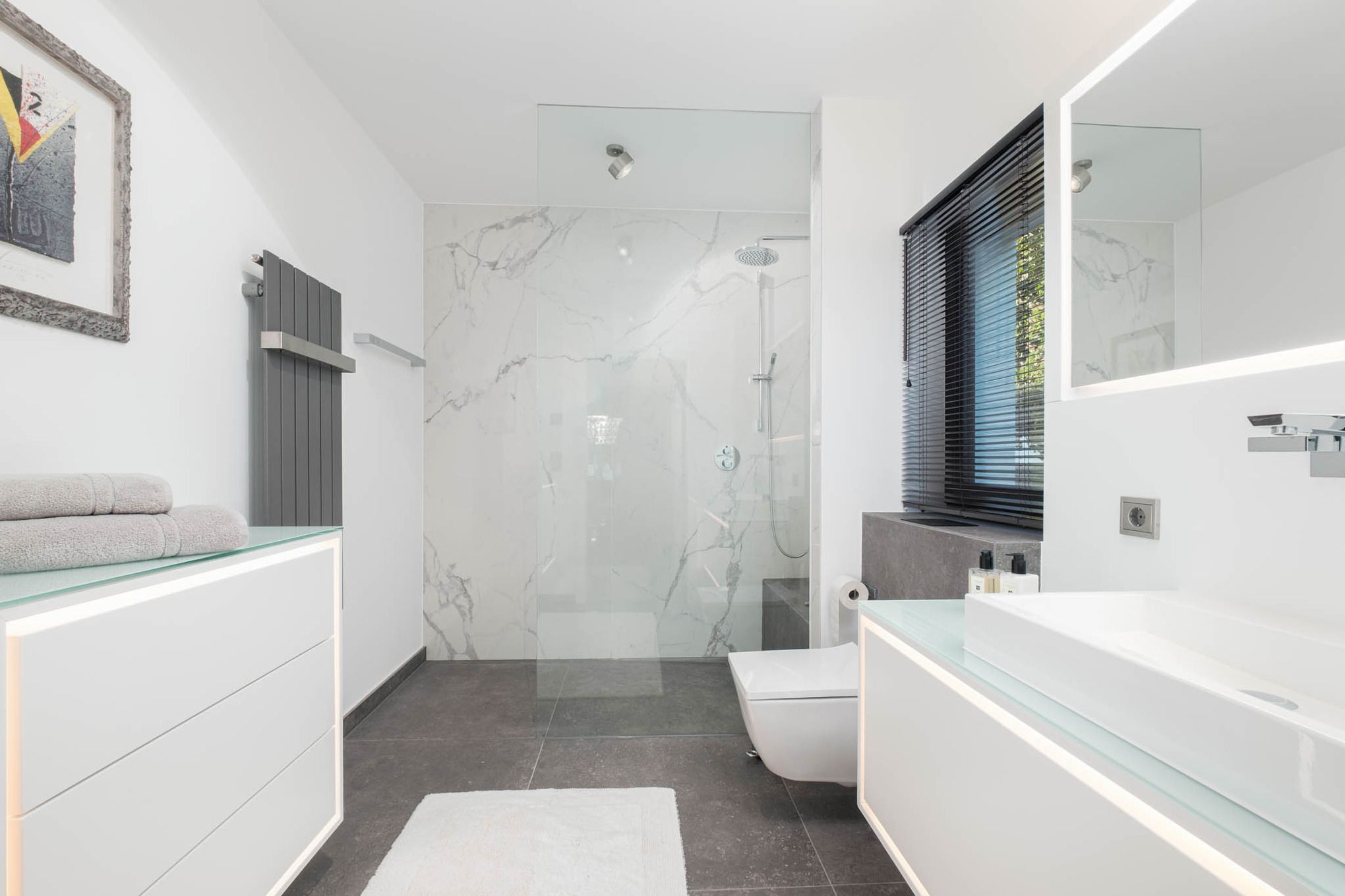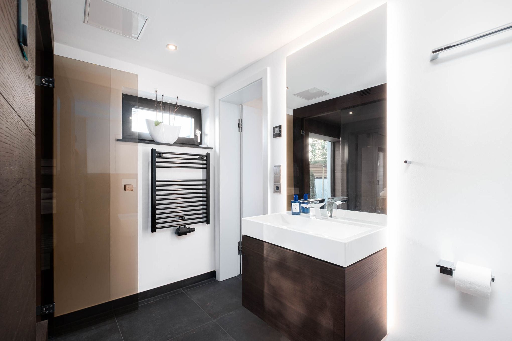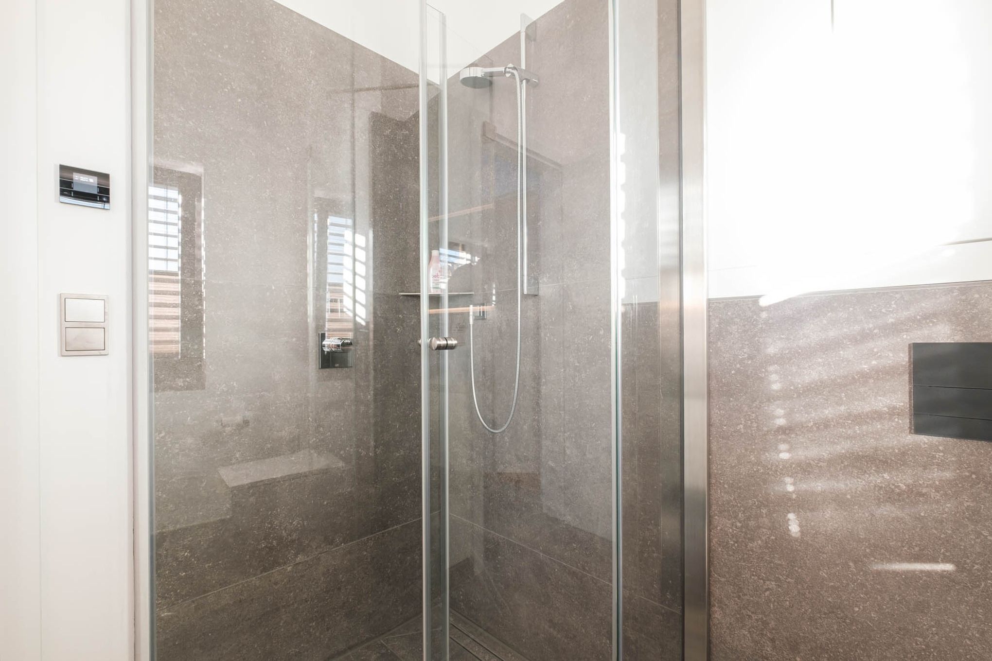 Zusätzlich laden ein direkt vom Wohnbereich zugängliches Bad mit Dusche sowie ein weiteres, drittes modernes Badezimmer mit Dusche im Obergeschoss zum Relaxen und zu Wellness-Momenten ein.