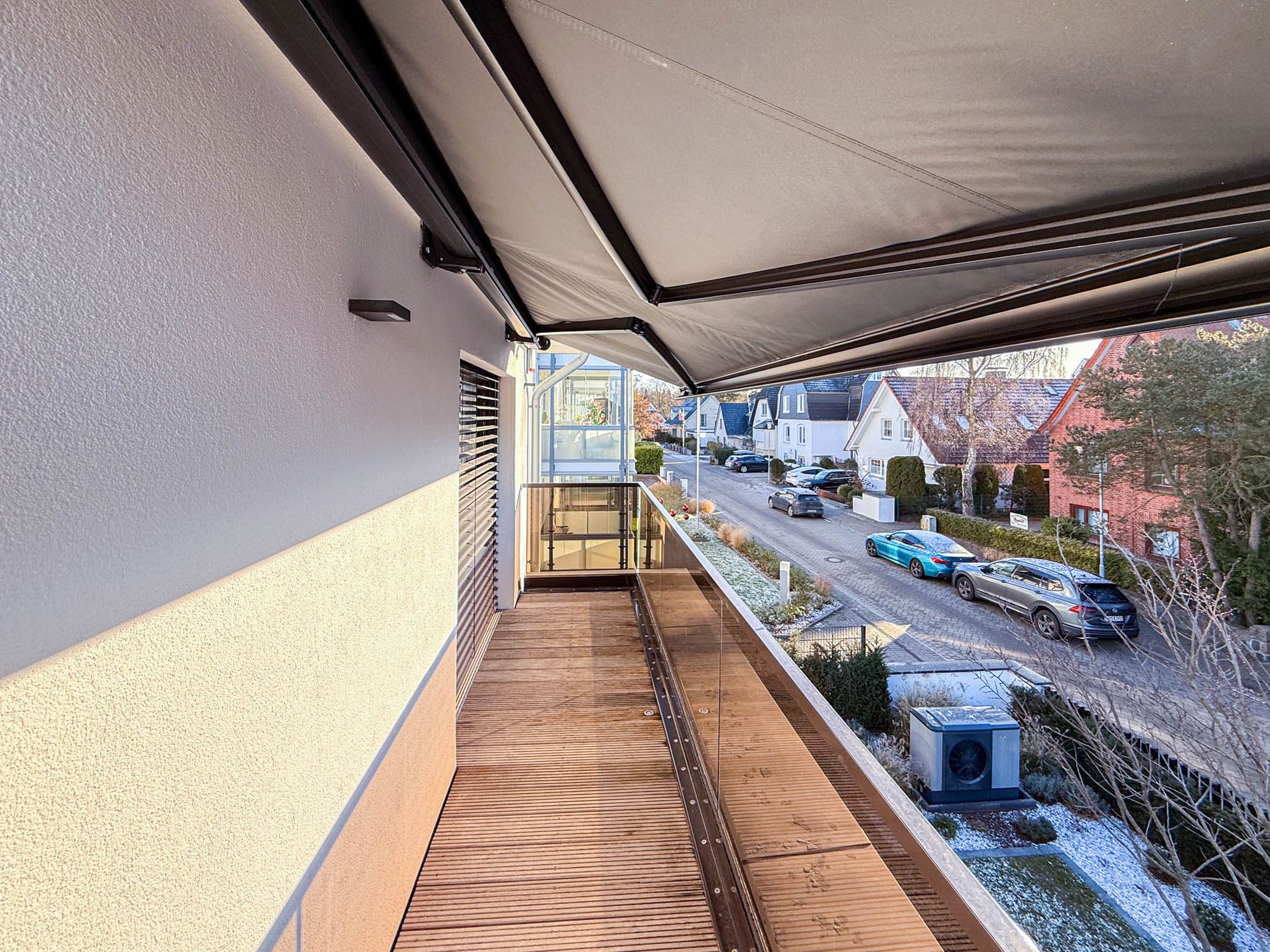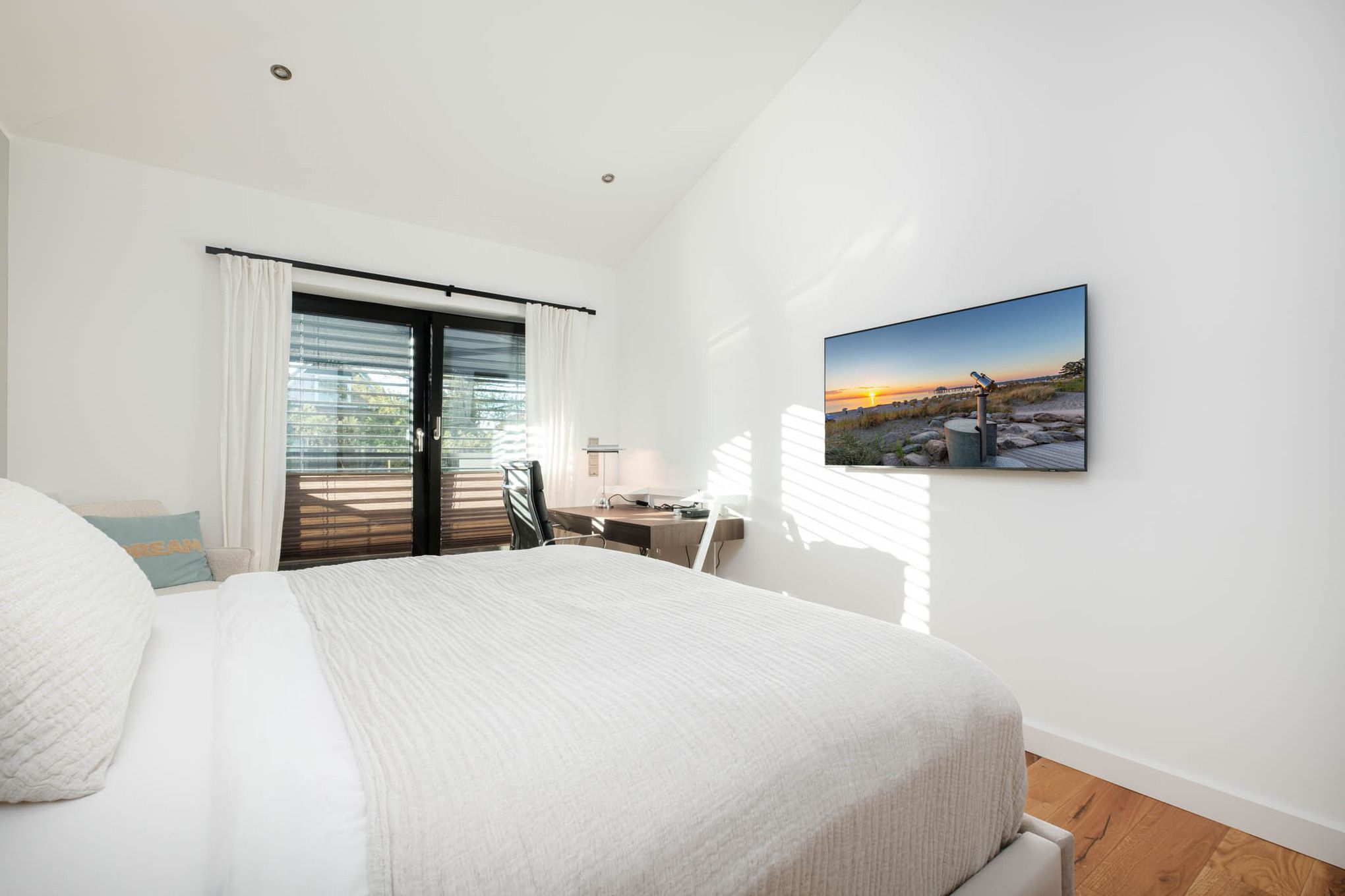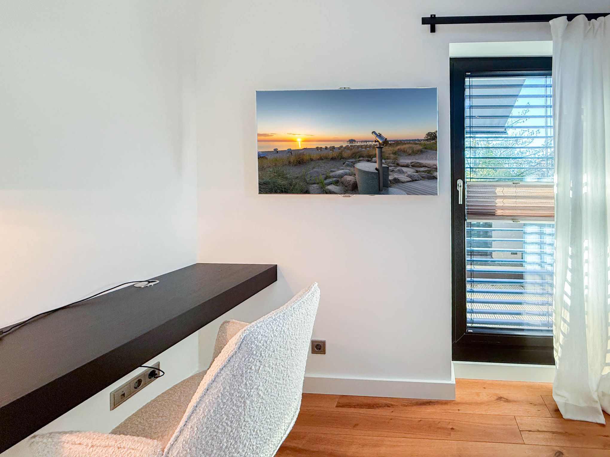 Im Obergeschoss befinden sich zwei weitere Schlafzimmer mit hochwertigen Boxspringbetten (1,55 x 2,00 m und 1,80 x 2,00 m). Beide Zimmer haben Zugang zu einem gemeinsamen Süd-Balkon mit Markise – so starten Sie mit Sonne am Morgen ideal in den Tag. Das größere Schlafzimmer verfügt zudem über eine Klimaanlage.