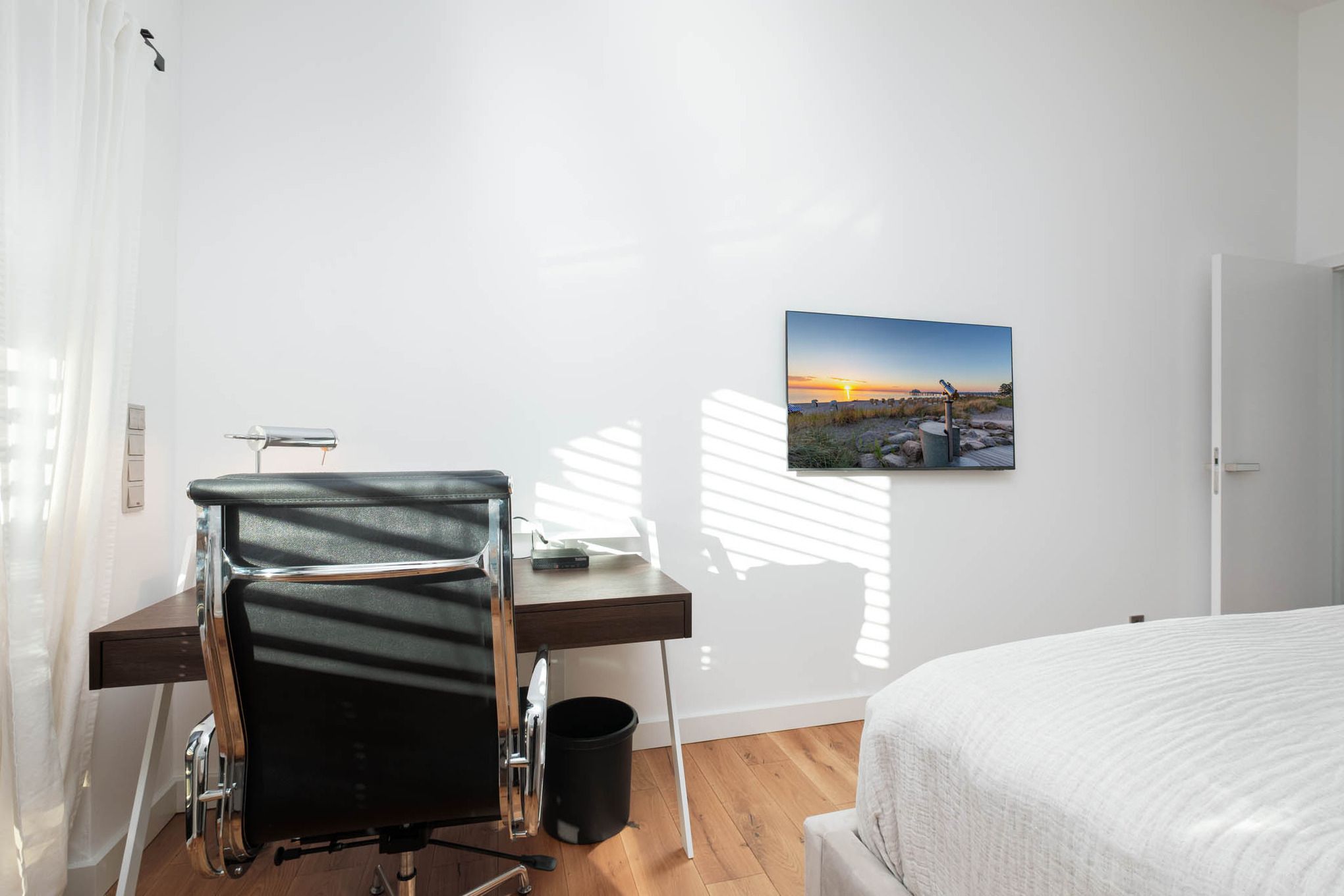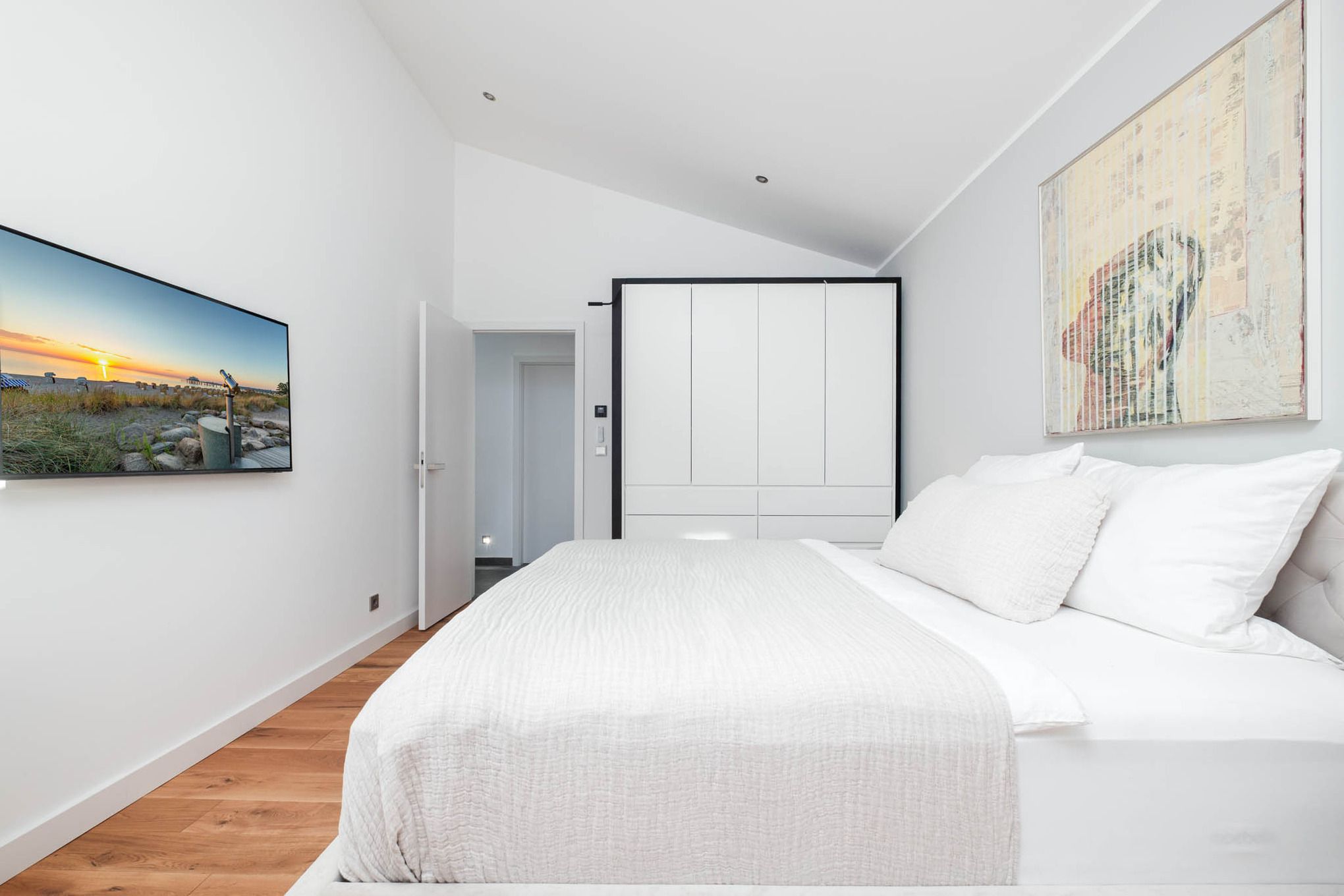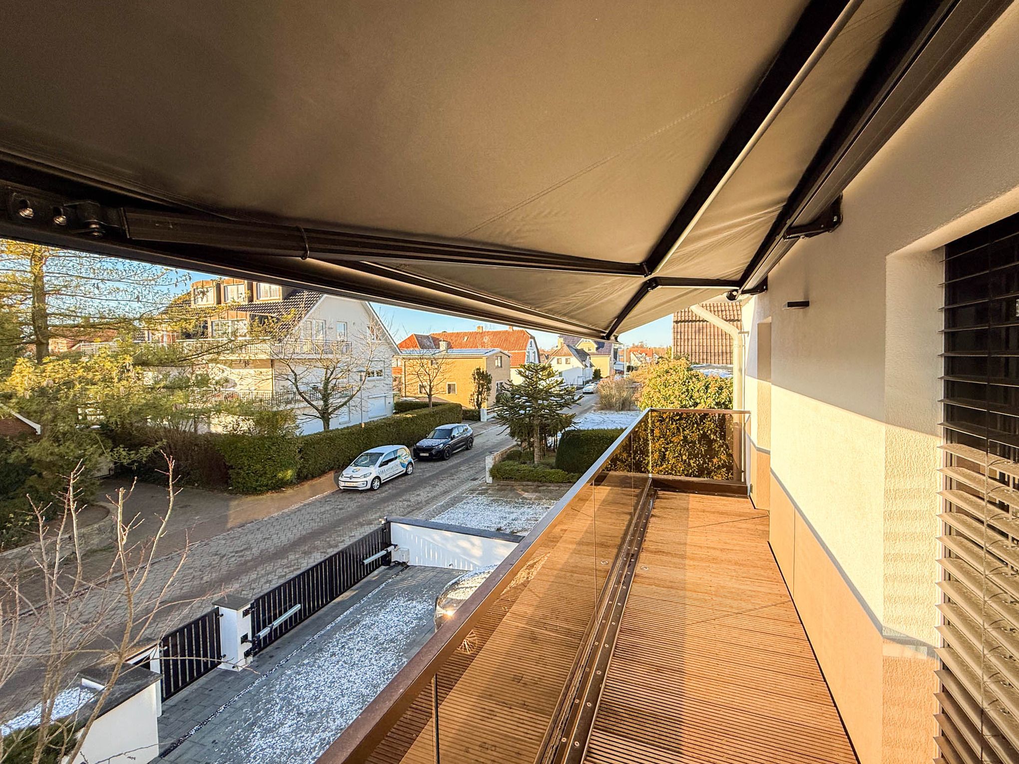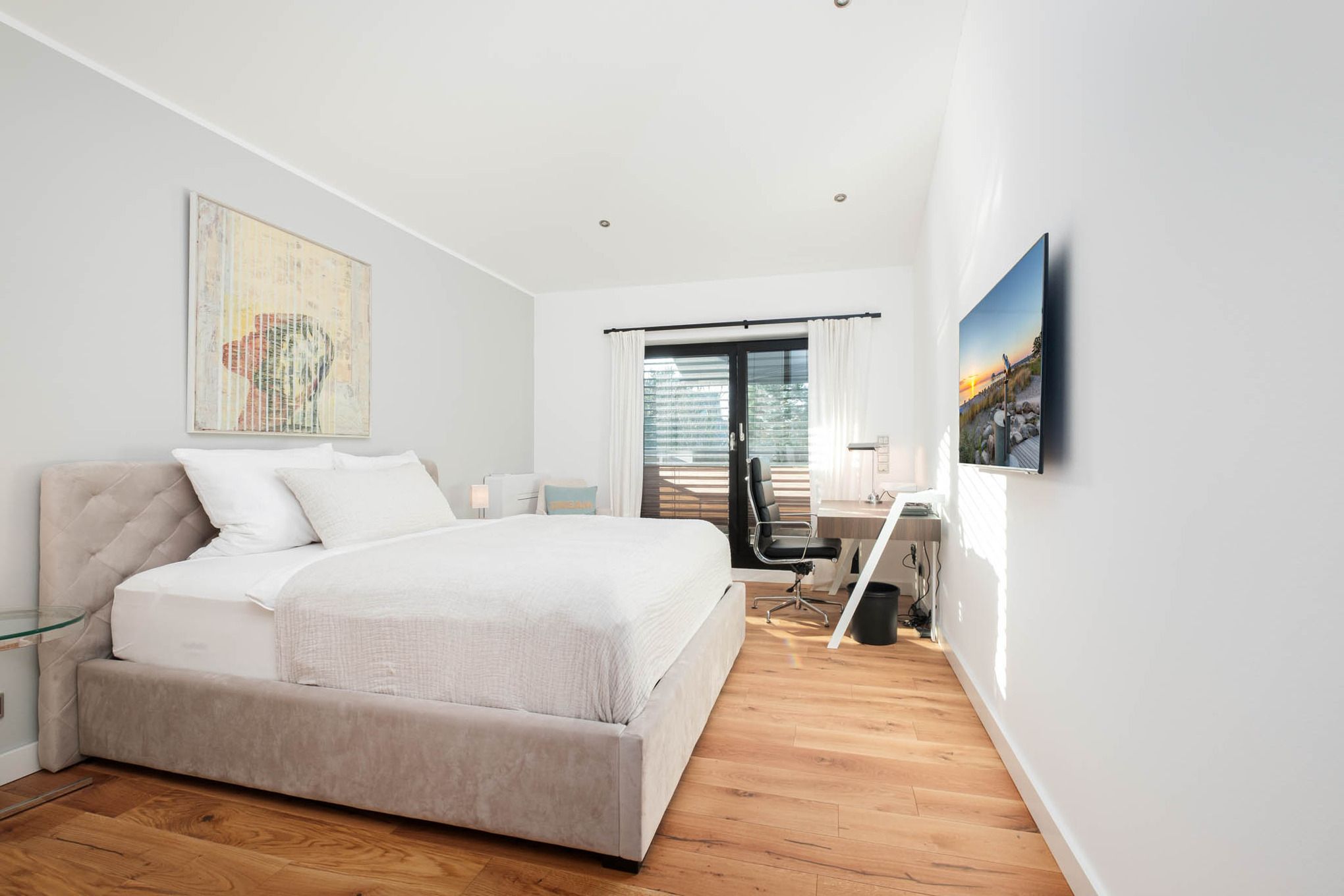 Im Obergeschoss befinden sich zwei weitere Schlafzimmer mit hochwertigen Boxspringbetten (1,55 x 2,00 m und 1,80 x 2,00 m). Beide Zimmer haben Zugang zu einem gemeinsamen Süd-Balkon mit Markise – so starten Sie mit Sonne am Morgen ideal in den Tag. Das größere Schlafzimmer verfügt zudem über eine Klimaanlage.